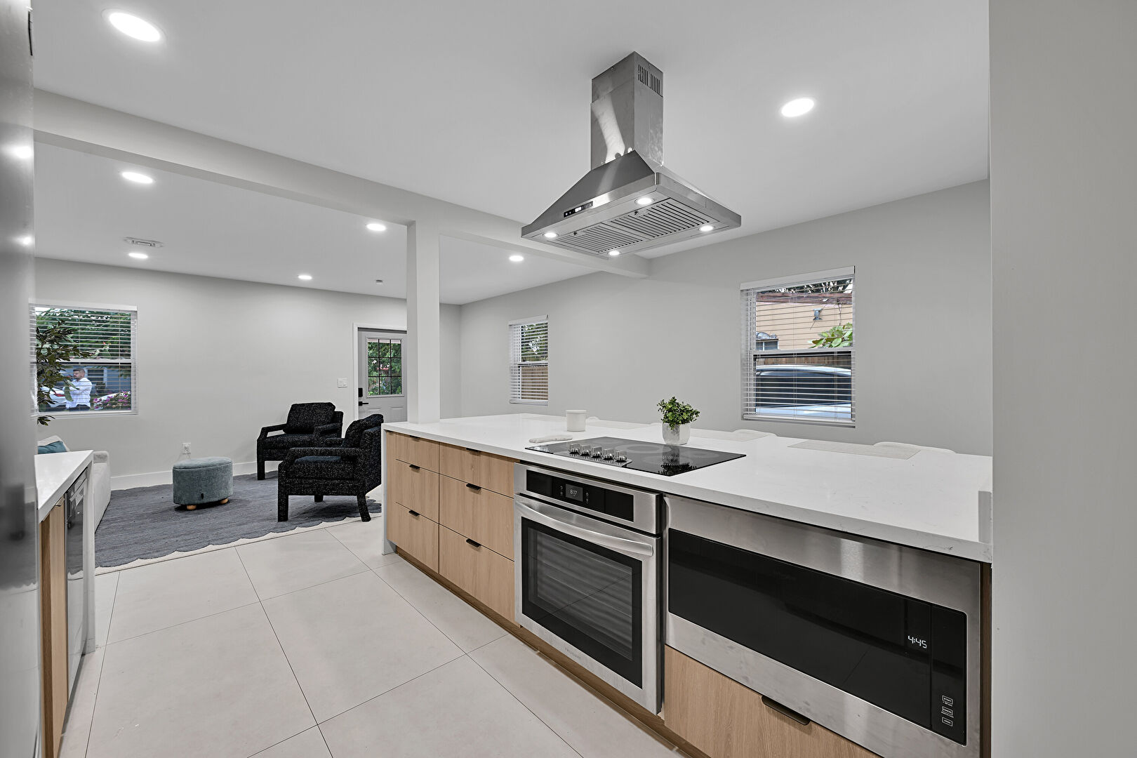 Barn Door, Baseboards Wall, Drywall, Flat Panel Cabinets, Galley Kitchen, Kitchen Bar, Kitchen Peninsula, Medium Brown Cabinets, Natural Light, Opens To Living Area, Recessed Lighting, Stone Countertops, Tile Floor, Vent, Flat Panel Cabinets, Galley Kitchen, Stone Countertops, Vent