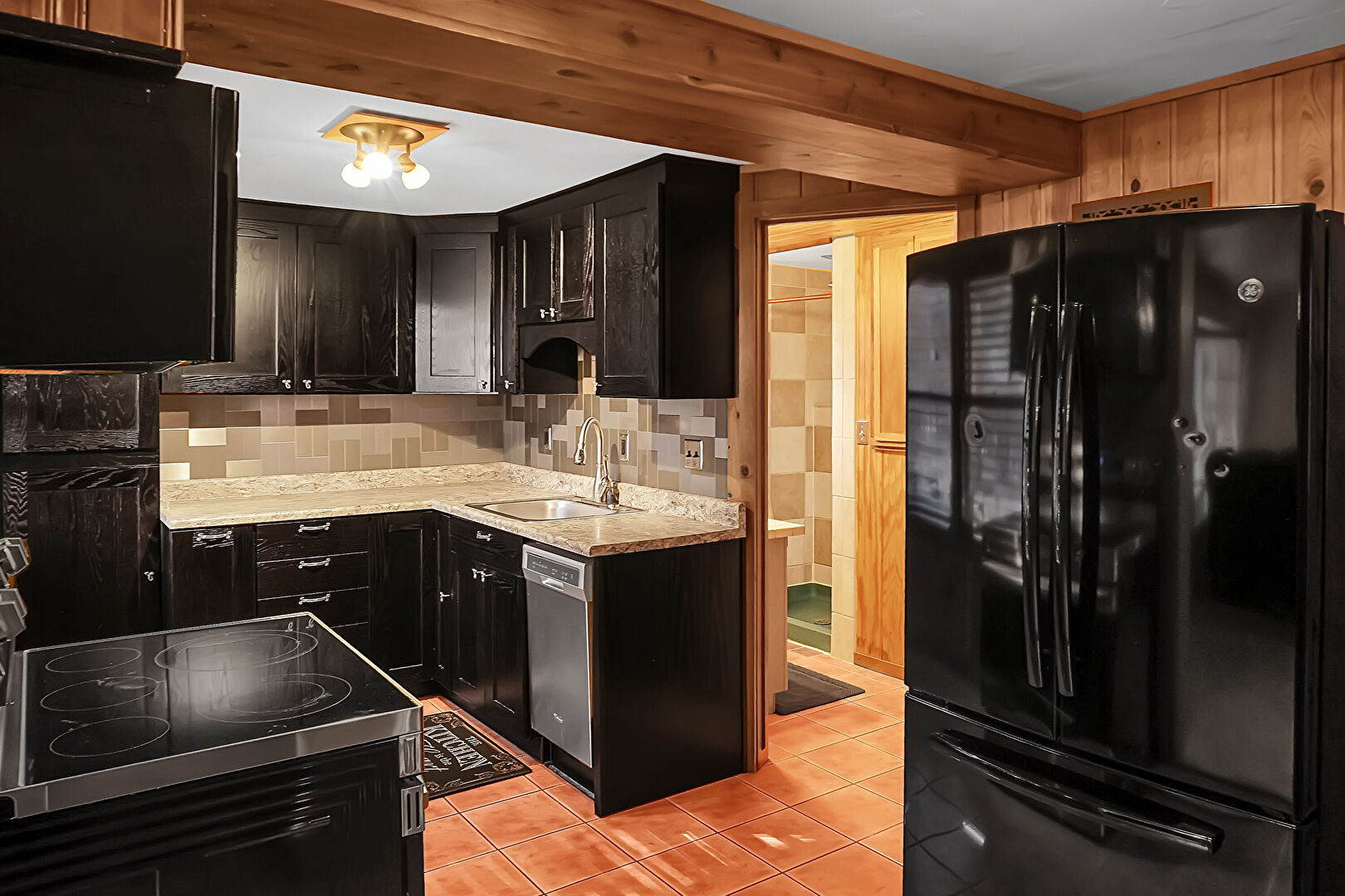Black Cabinets, Natural Light, Shaker Cabinets, Tile Floor, Wood Wall, Shaker Cabinets, Stone Countertops