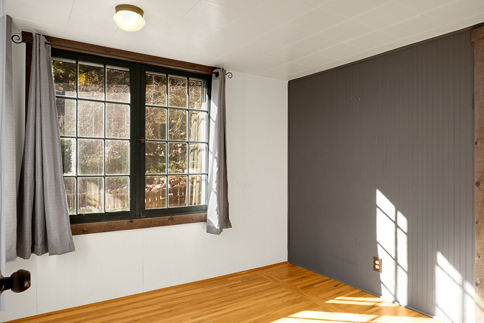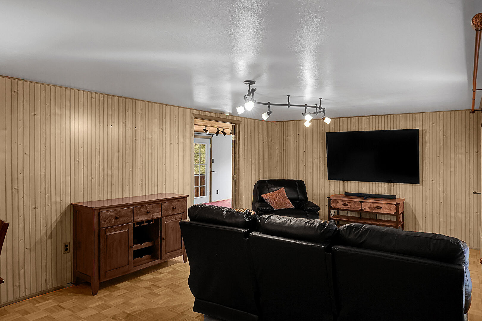 Carpet, Drywall, French Doors, Natural Light, Track Lighting, Wainscot Wall, Wood Ceiling, Wood Stove, Wood Wall, Drywall, Track Lighting