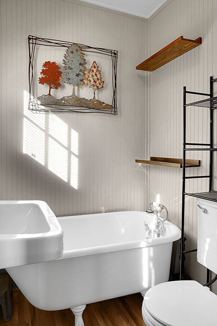 Full Bathroom, Natural Light, Wood Finish Floor, Wood Wall, Crown Molding