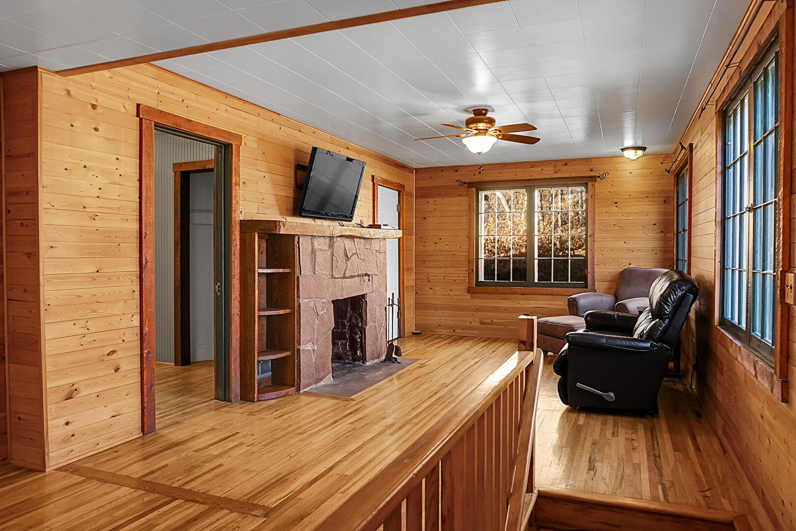 Ceiling Fan, Fireplace, Natural Light, Wood Finish Floor, Wood Wall, Upstairs Landing, Wood Wall