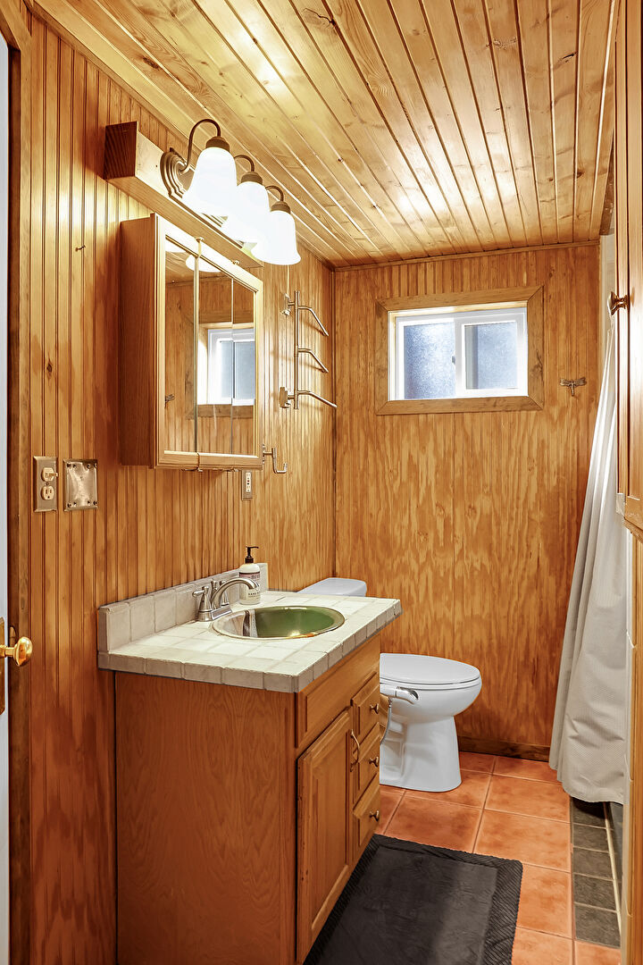 Natural Light, Vanity, Wood Ceiling, Wood Wall, Tile Floor