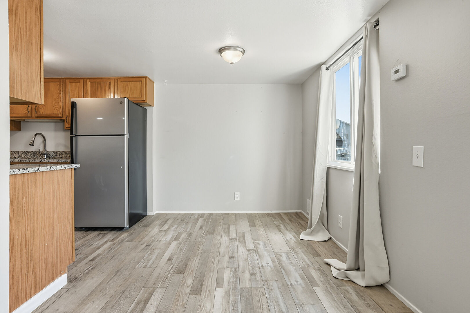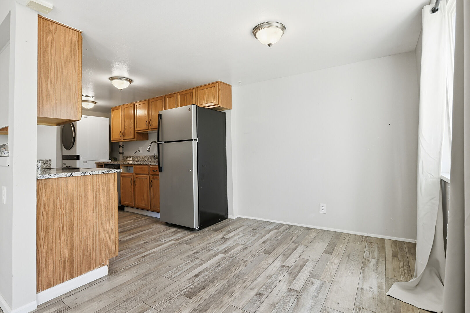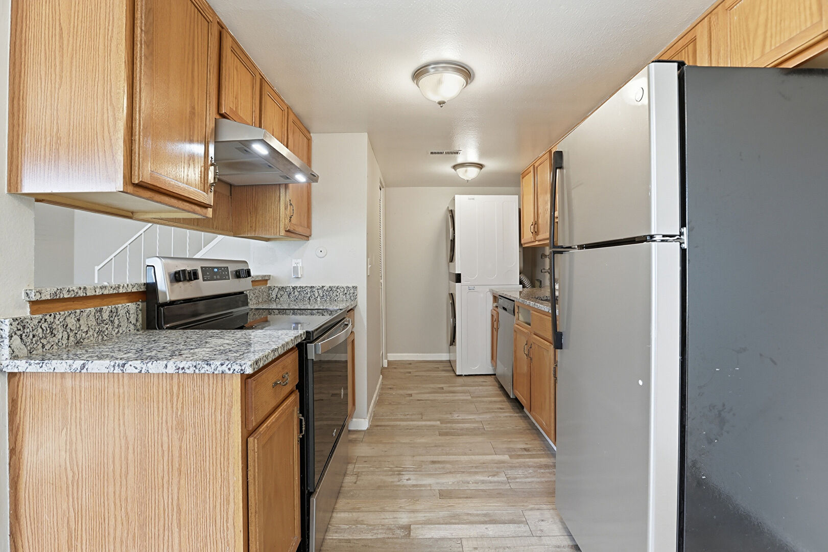 Baseboards Wall, Drywall, Galley Kitchen, Laundry, Medium Brown Cabinets, Shaker Cabinets, Stone Countertops, Vent, Washer Dryer, Wood Finish Floor, Baseboards Wall, Laundry