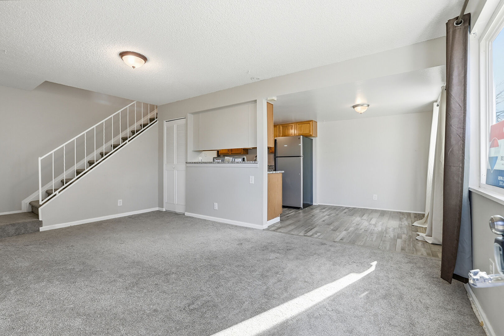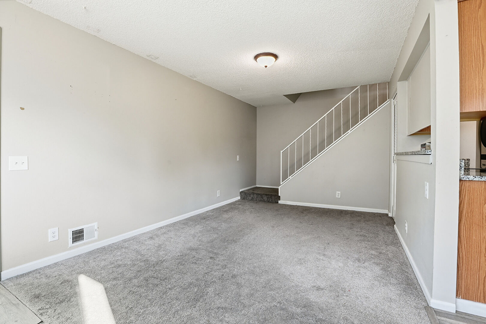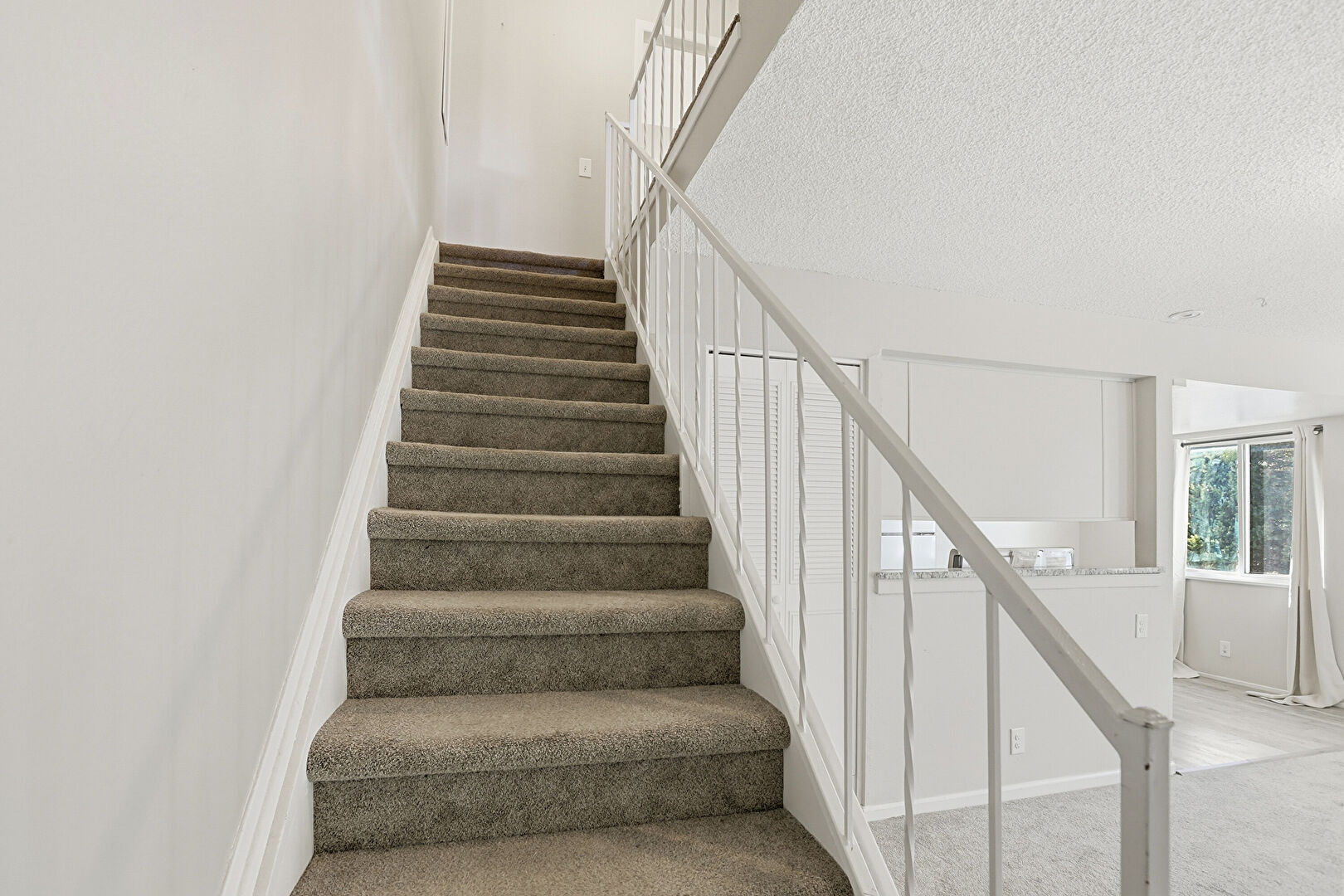 Baseboards Wall, Carpet, Drywall, Natural Light, Textured Ceiling, Stairs
