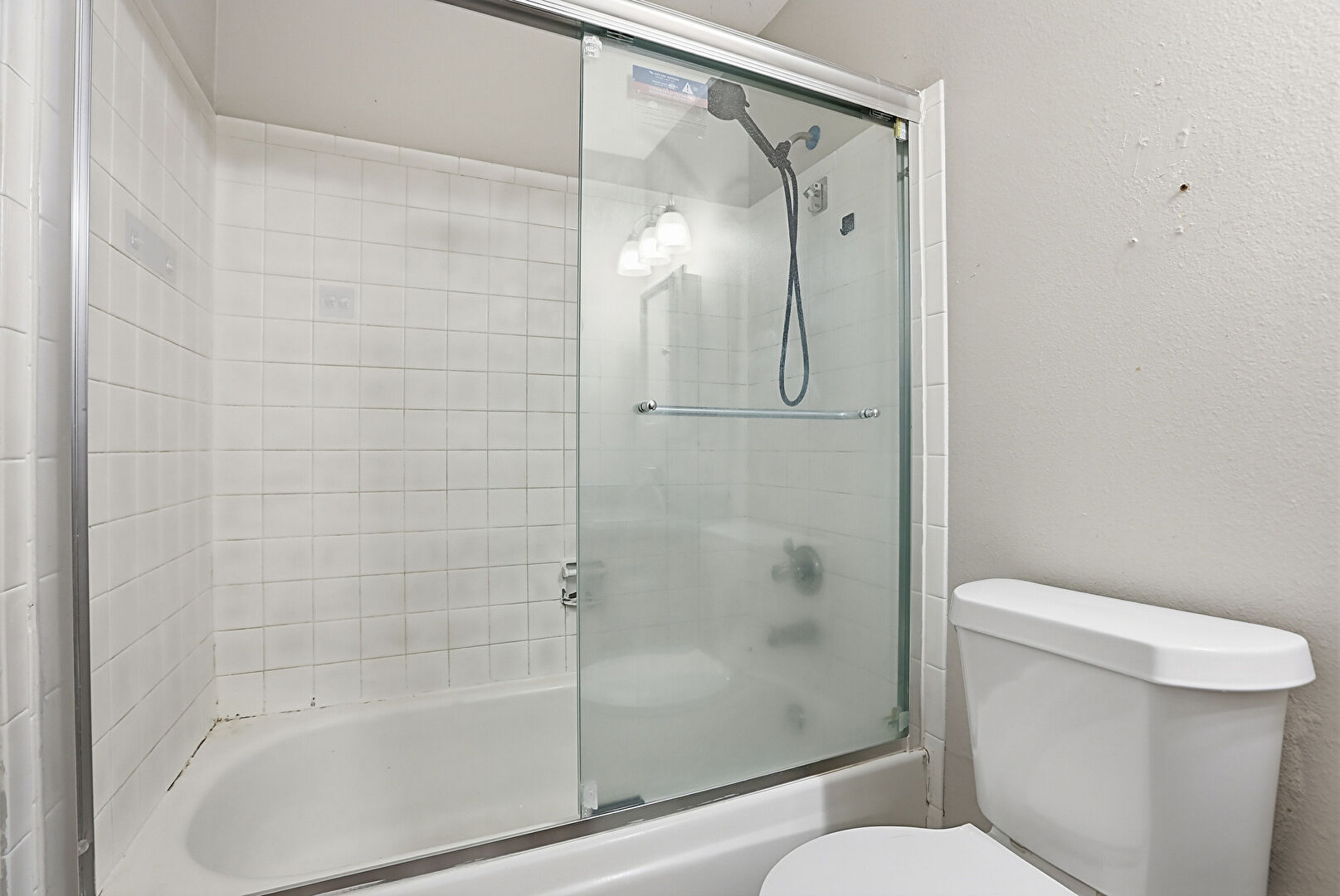 Baseboards Wall, Combined Bath Shower, Full Bathroom, Wood Finish Floor, Textured Wall, Vanity