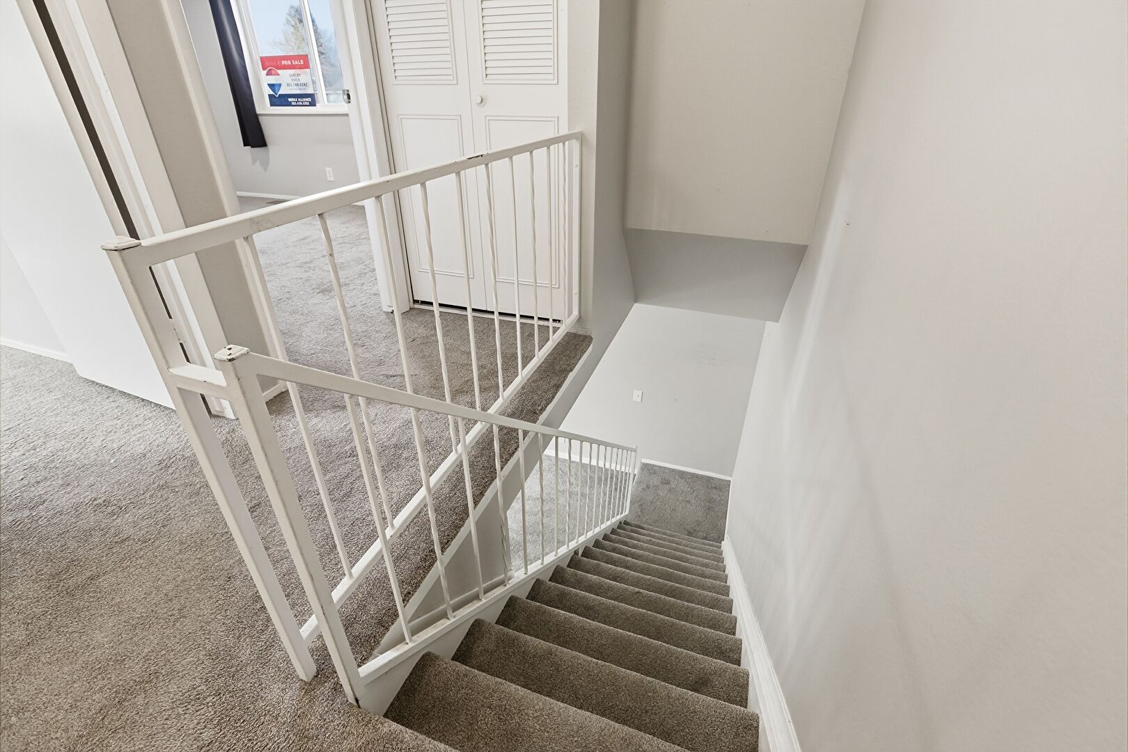 Carpet, Closet, Drywall, Natural Light, Stairs, Textured Ceiling, Vent, Baseboards Wall