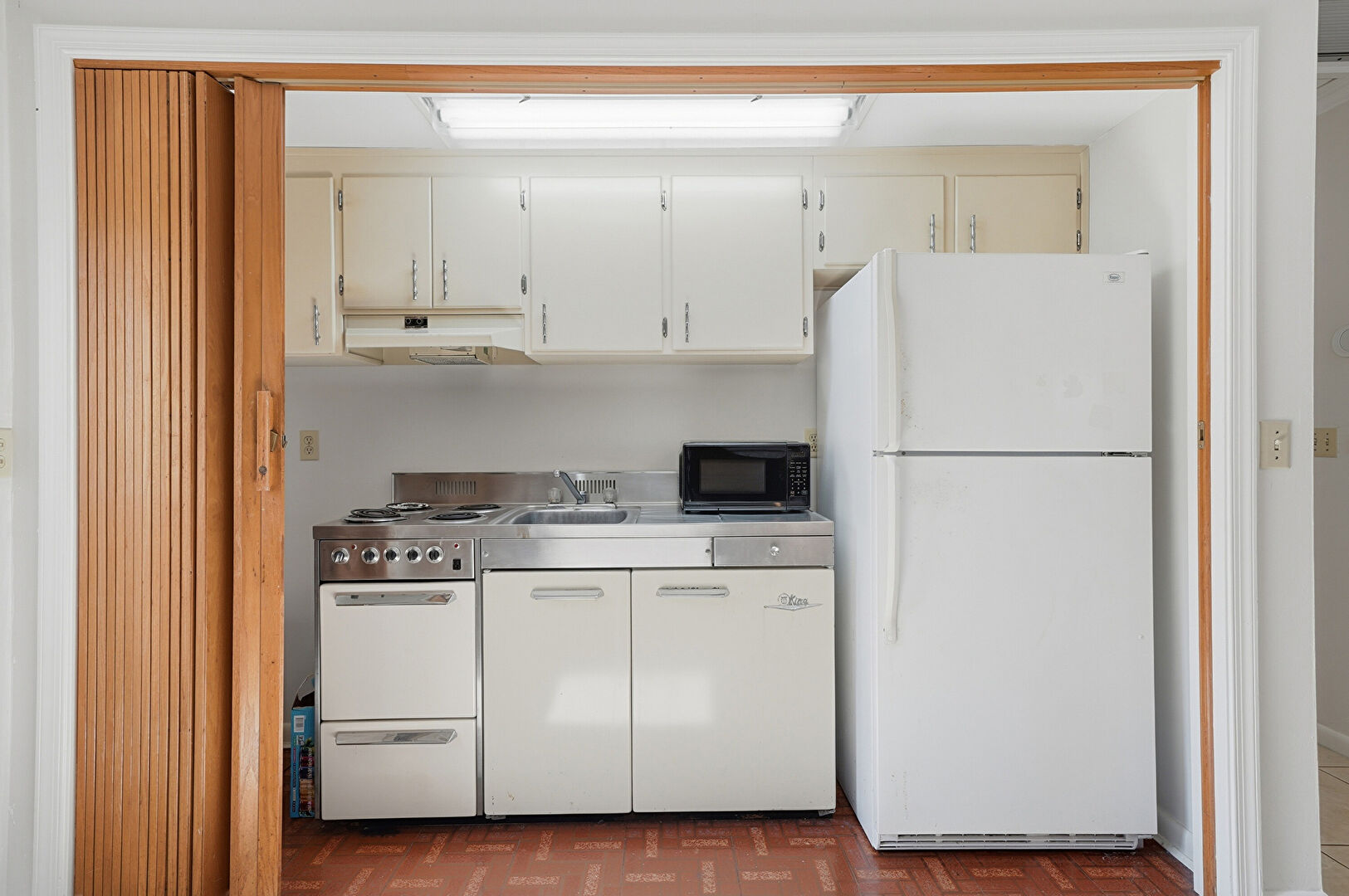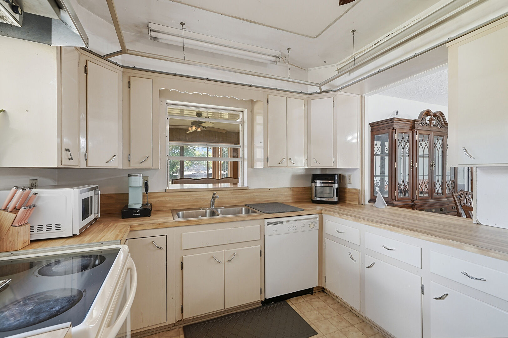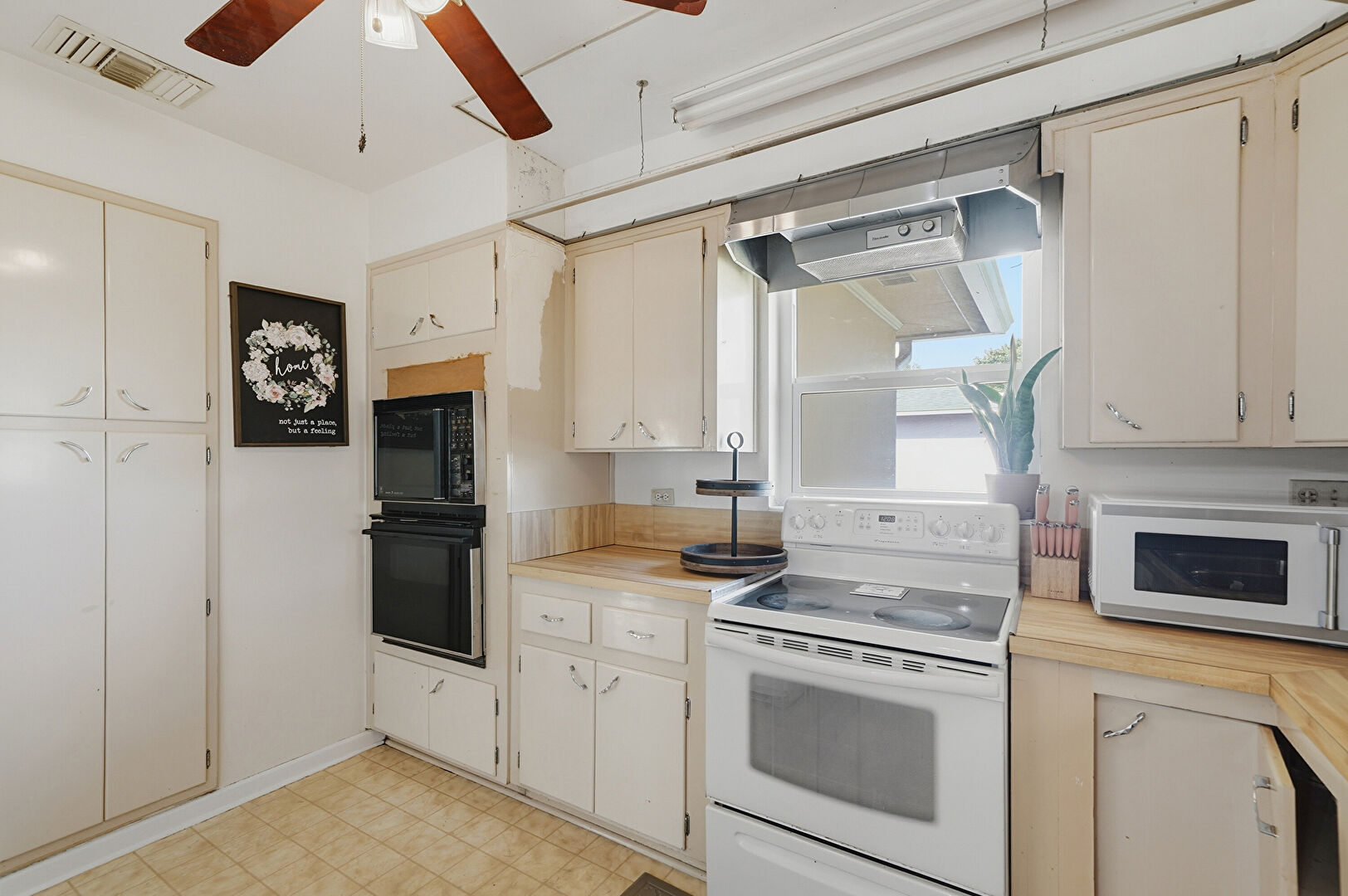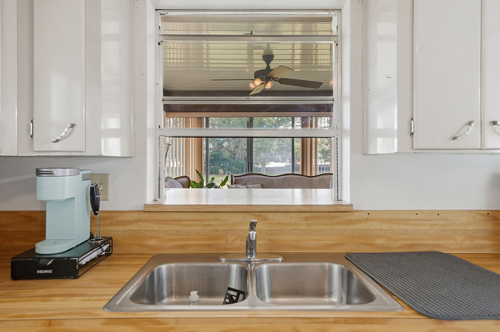 Butcher Block Countertops, Ceiling Fan, Cream Cabinets, Drywall, Kitchen Peninsula, Medium Brown Cabinets, Natural Light, Notable Chandelier, Opens To Living Area, Pass Through Window, Pendant Lighting, Vent, Vinyl Floor, Visible Hinge Cabinets, Wood Wall, Butcher Block Countertops, Ceiling Fan, Drywall, Pass Through Window, Tile Floor, Visible Hinge Cabinets