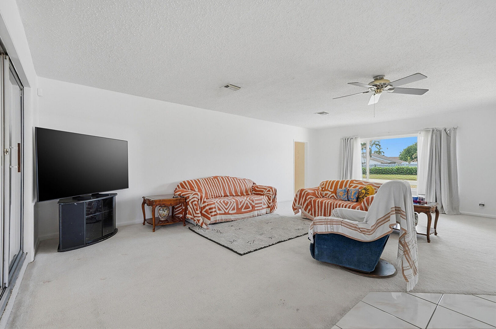 Baseboards Wall, Carpet, Ceiling Fan, Drywall, Natural Light, Textured Ceiling, Tile Floor, Vent
