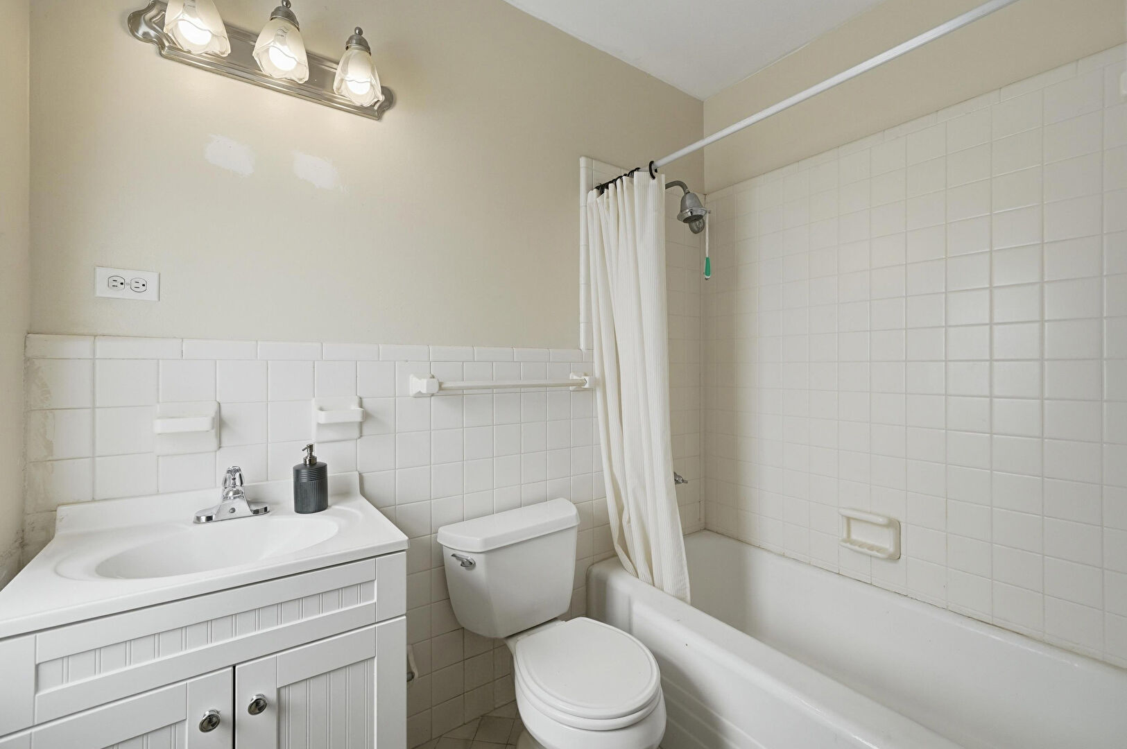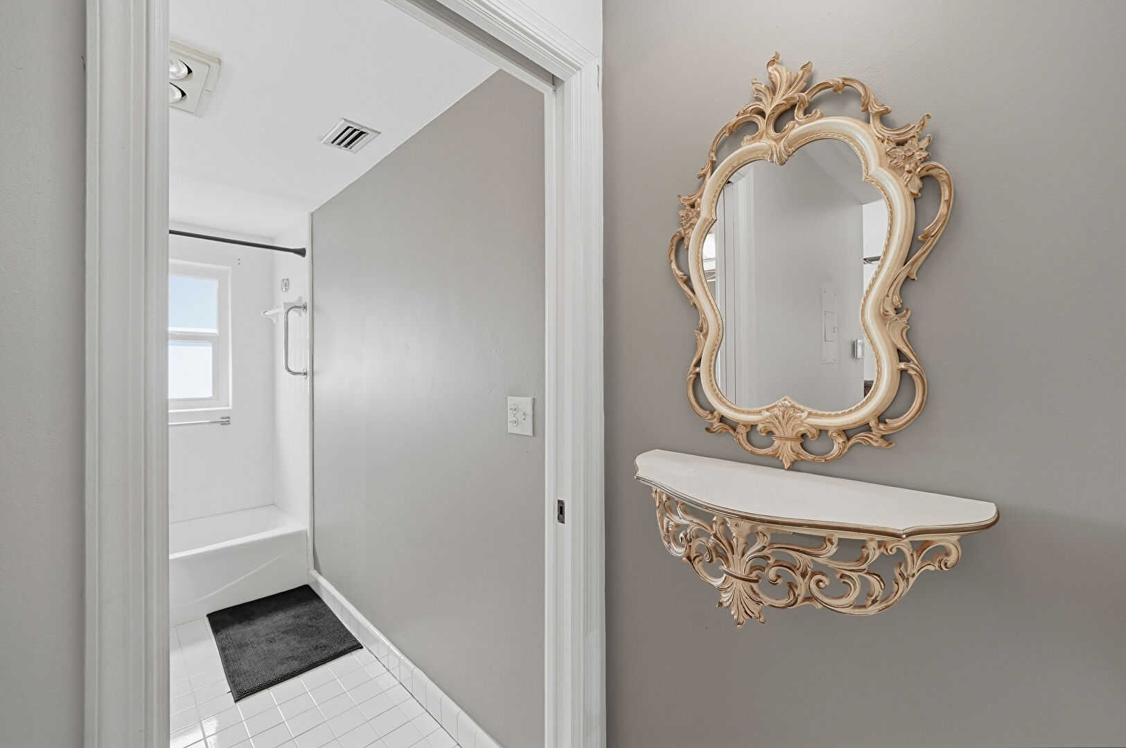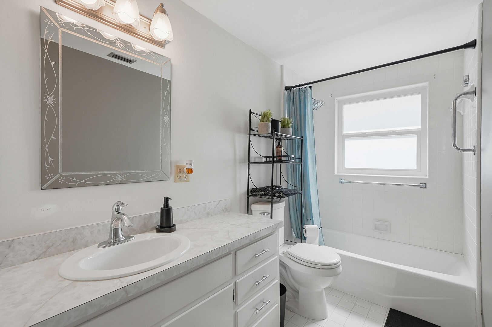 Baseboards Wall, Combined Bath Shower, Drywall, Full Bathroom, Natural Light, Tile Floor, Tile Wall, Vanity, Vent, Wainscot Wall, Drywall, Natural Light, Vanity