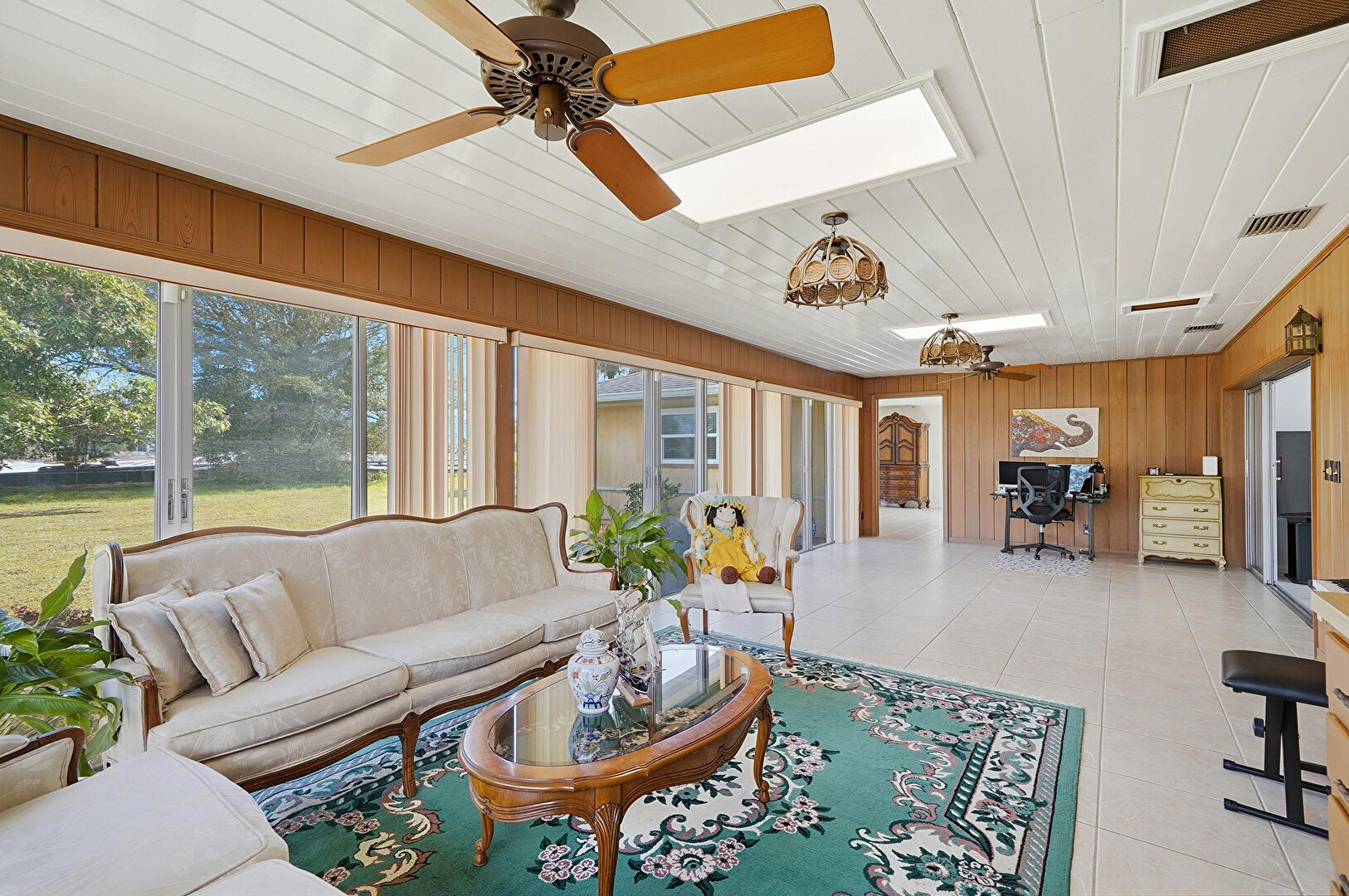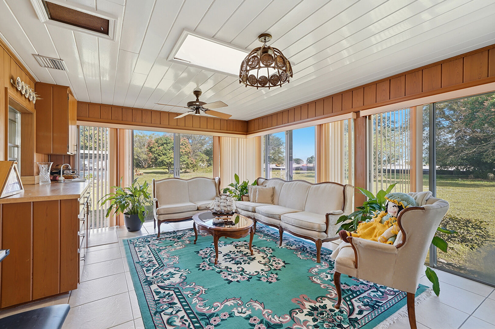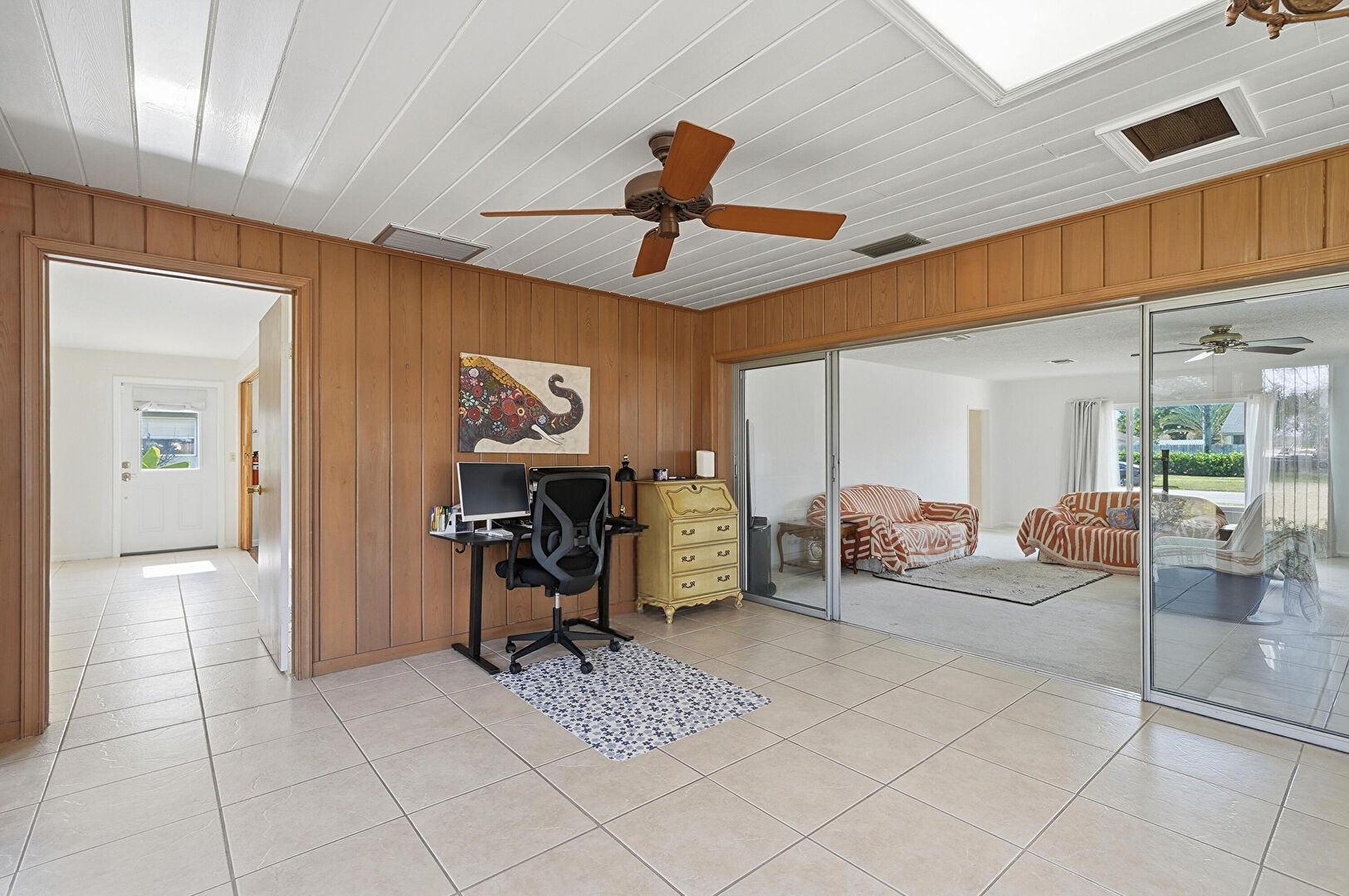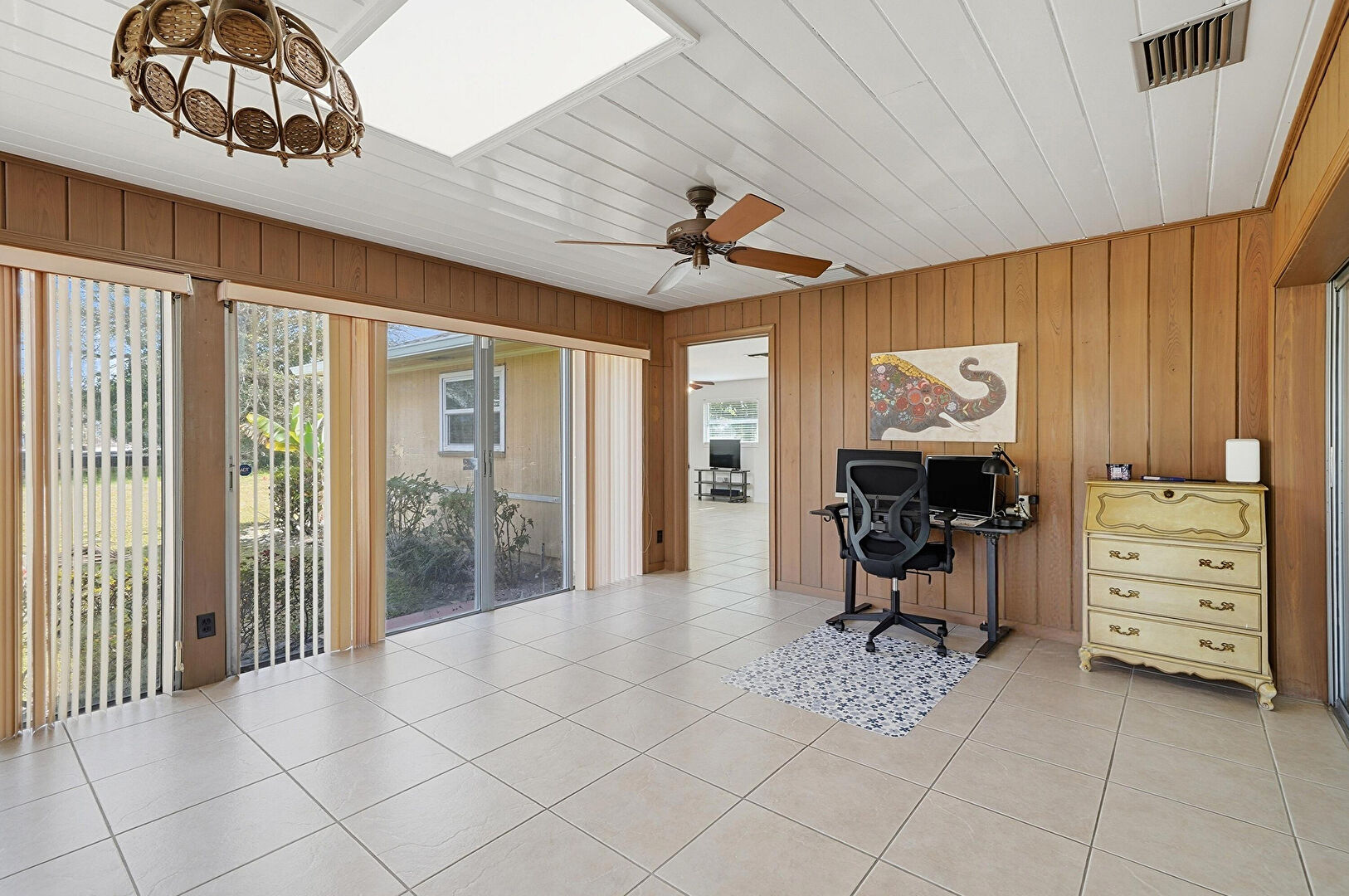 Ceiling Fan, Drywall, Natural Light, Office Area, Skylight, Textured Ceiling, Tile Floor, Wood Wall, Sunroom