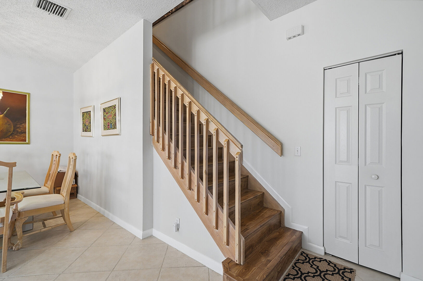 Drywall, Stairs, Textured Ceiling, Tile Floor, Vent, Baseboards Wall