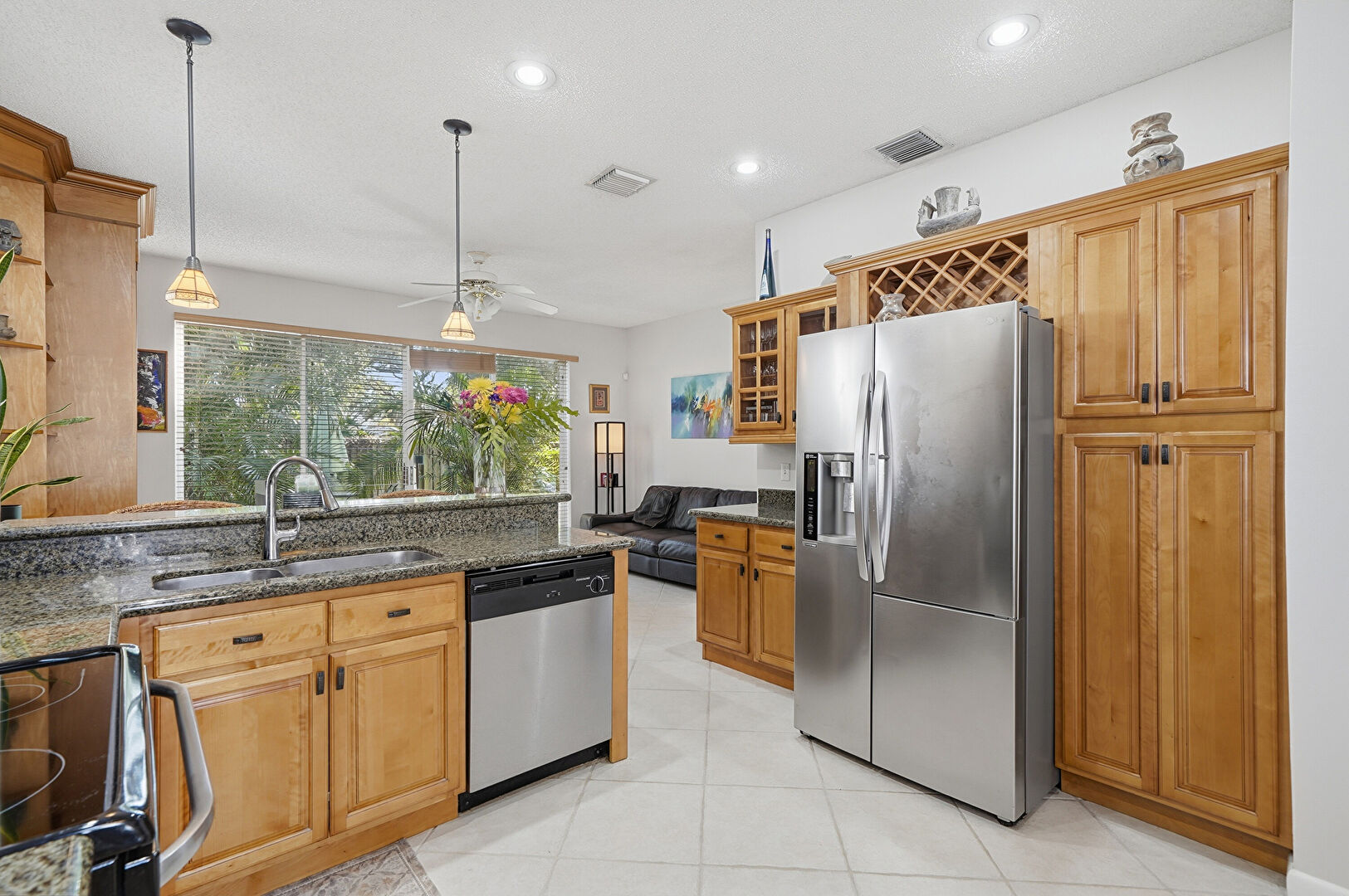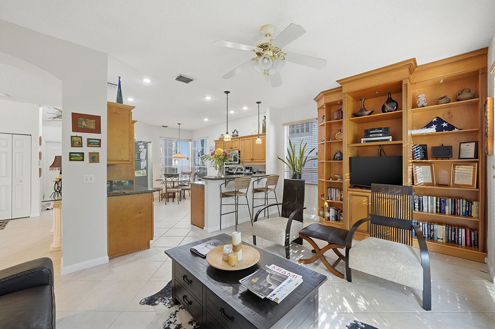Baseboards Wall, Ceiling Fan, Crown Molding Cabinets, Drywall, Glass Insert Cabinets, Kitchen Bar, Kitchen Peninsula, Medium Brown Cabinets, Natural Light, Pendant Lighting, Raised Cabinets, Recessed Lighting, Stone Countertops, Tile Floor, Toaster, U Shaped Kitchen, Vent, Crown Molding Cabinets, Kitchen Bar, Open Shelves, Opens To Living Area, Recessed Lighting