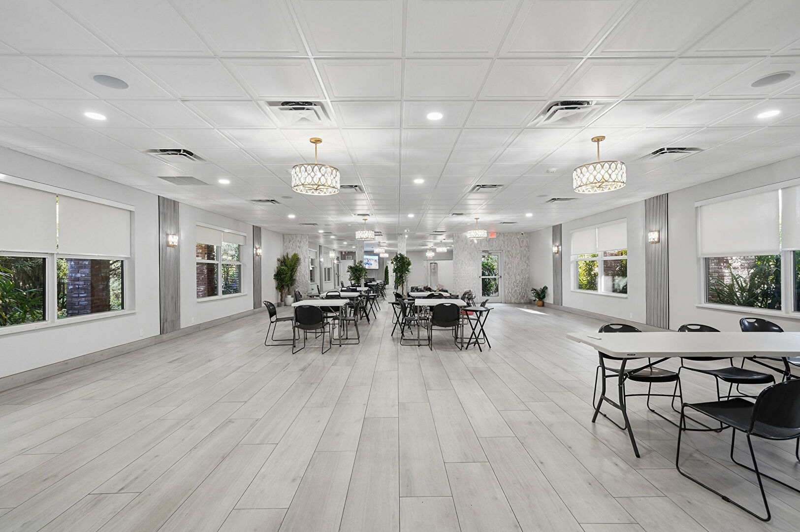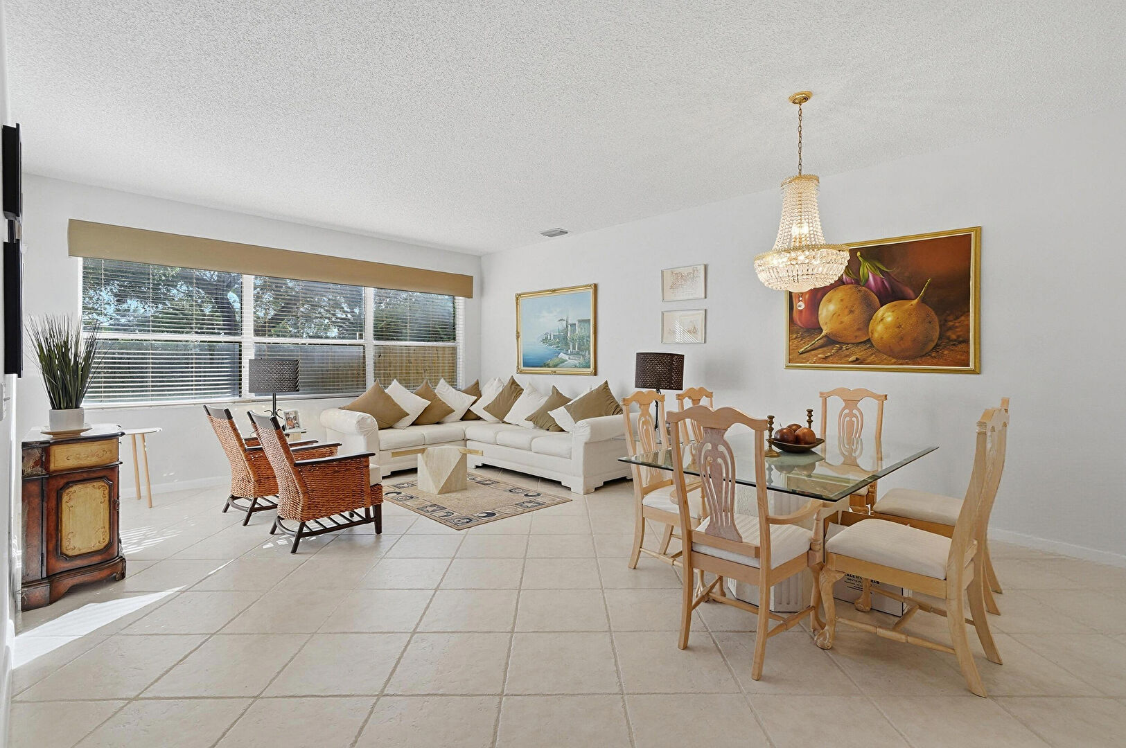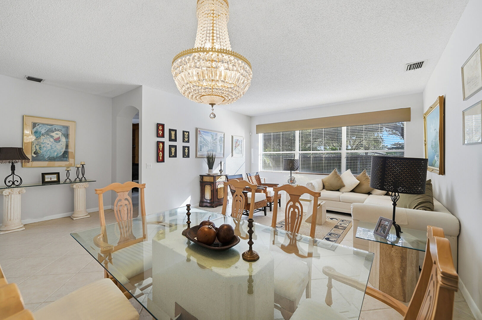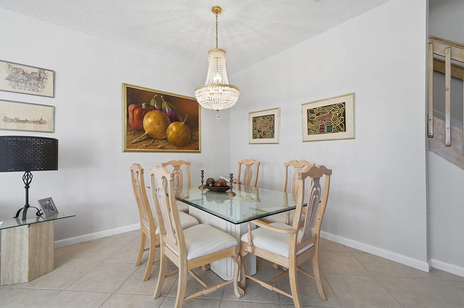 Baseboards Wall, Drywall, High Ceiling, Natural Light, Notable Chandelier, Tile Floor, Textured Ceiling