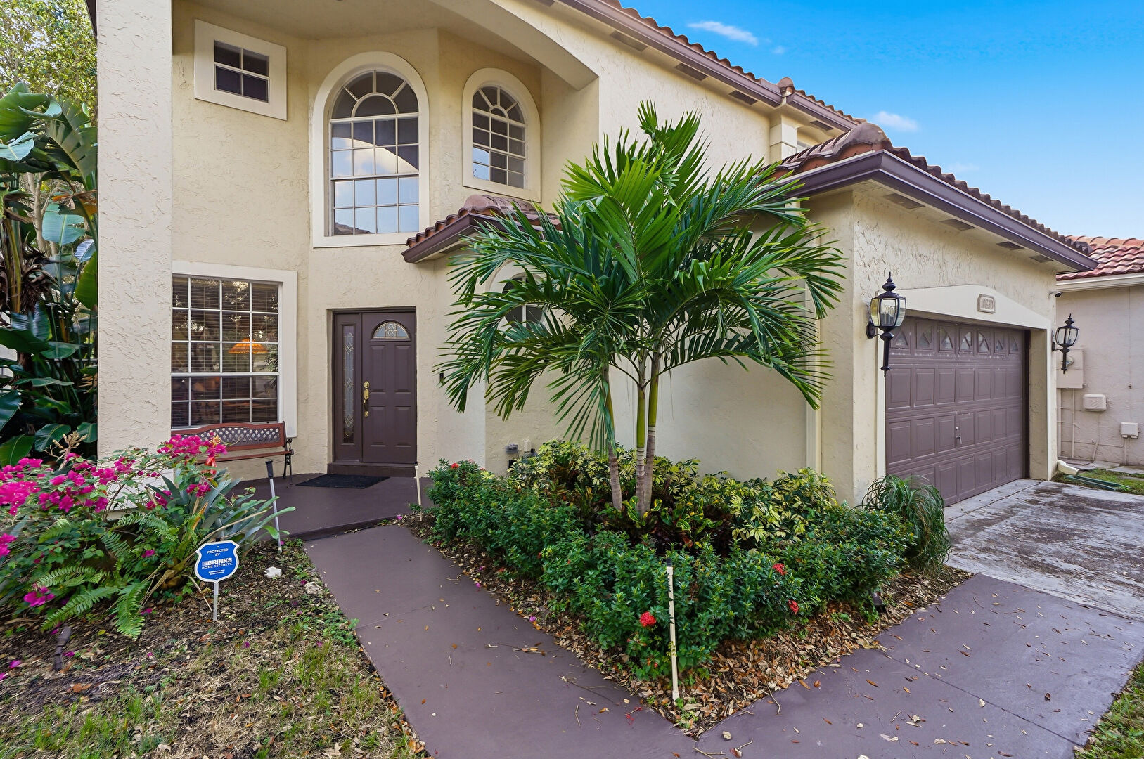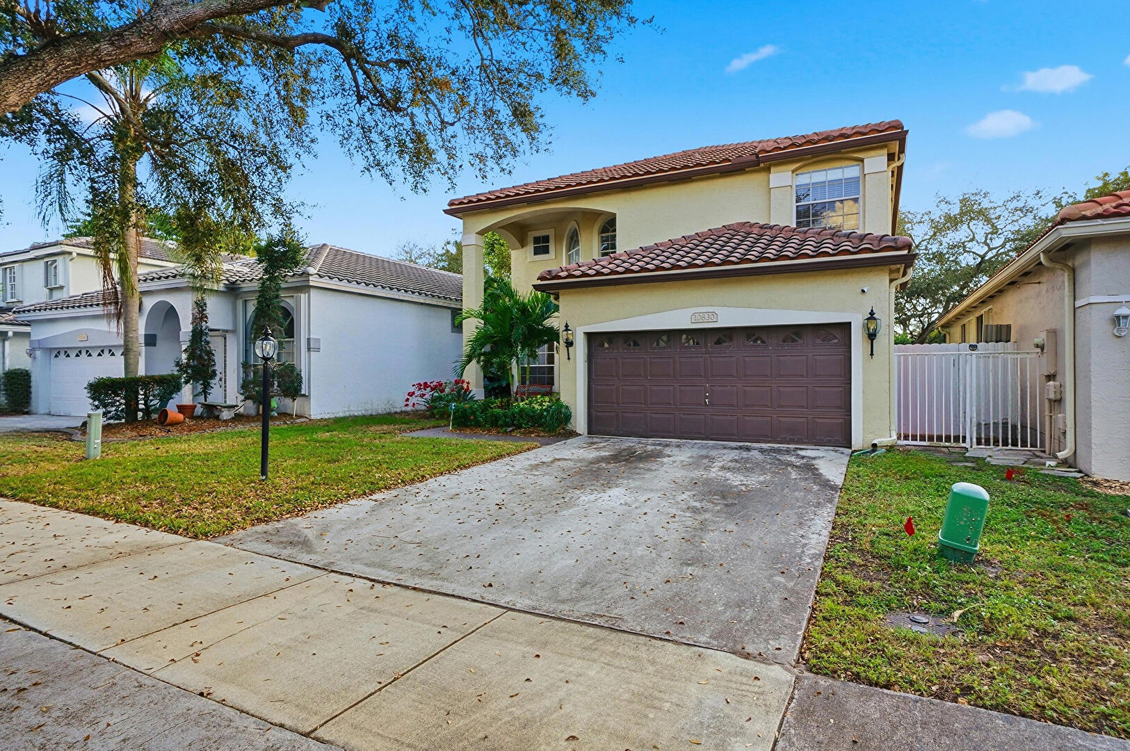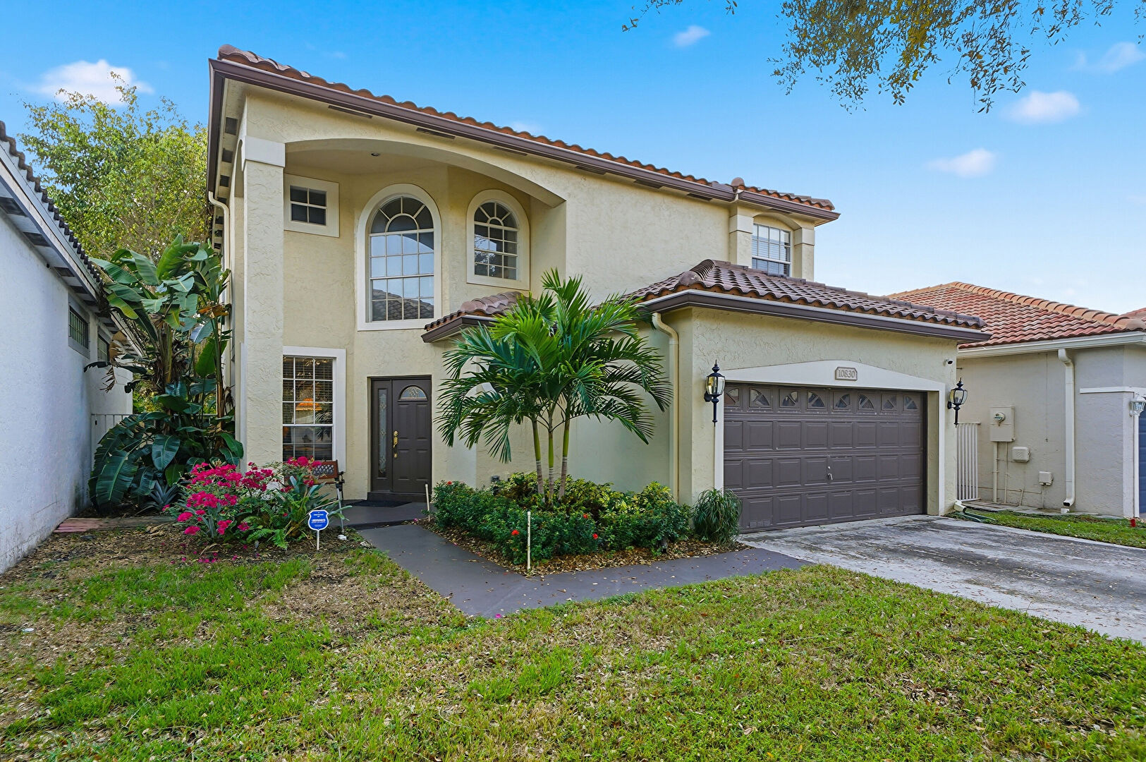 Downspout, Driveway, Electric Meter, Fence, Gutters, Lawn, Stucco Siding, Tile Roof, Driveway, Gutters, Lawn, Tile Roof