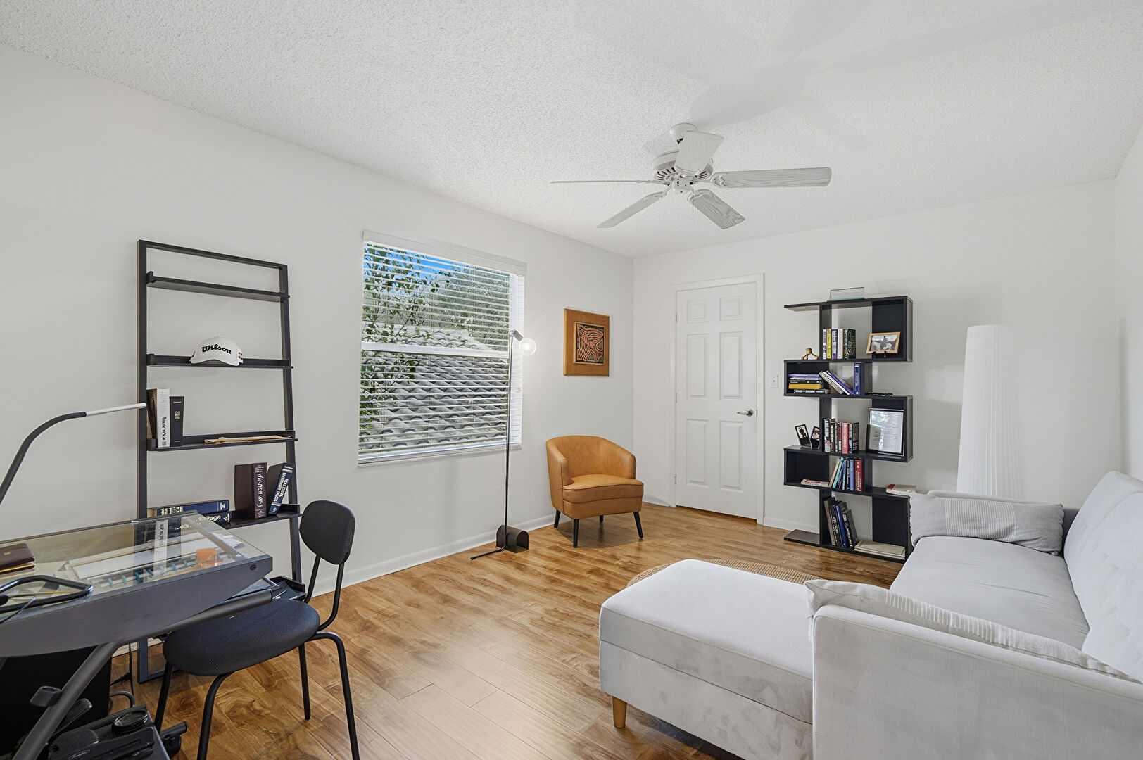 Baseboards Wall, Ceiling Fan, Drywall, Natural Light, Office Area, Textured Ceiling, Vent, Wood Finish Floor, Accent Wall, Ceiling Fan, Textured Ceiling