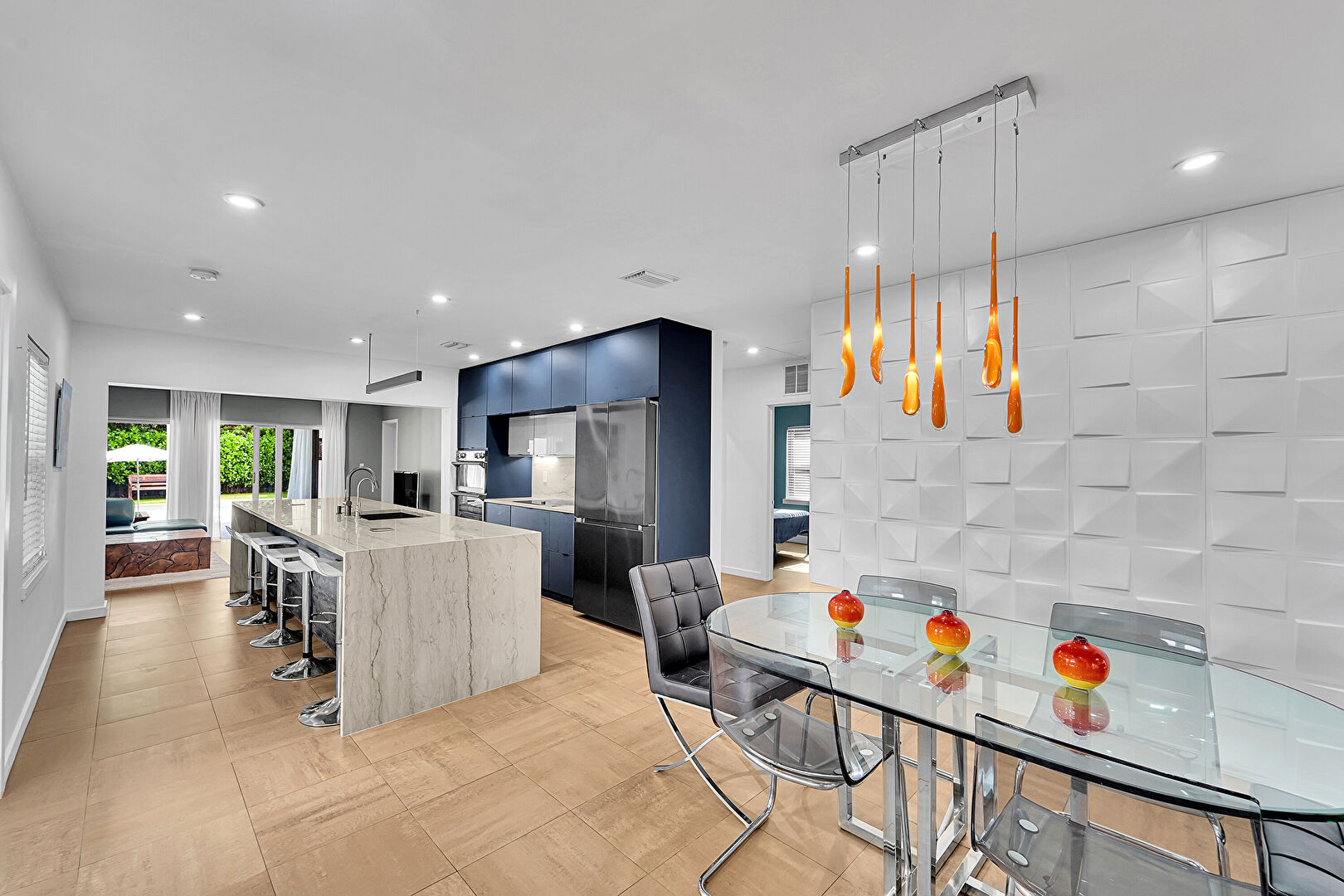 Accent Wall, Baseboards Wall, Black Cabinets, Blue Cabinets, Double Oven, Drywall, Kitchen Bar, Kitchen Island, Natural Light, Pendant Lighting, Recessed Lighting, Stone Countertops, Tile Floor, Vent, Flat Panel Cabinets
