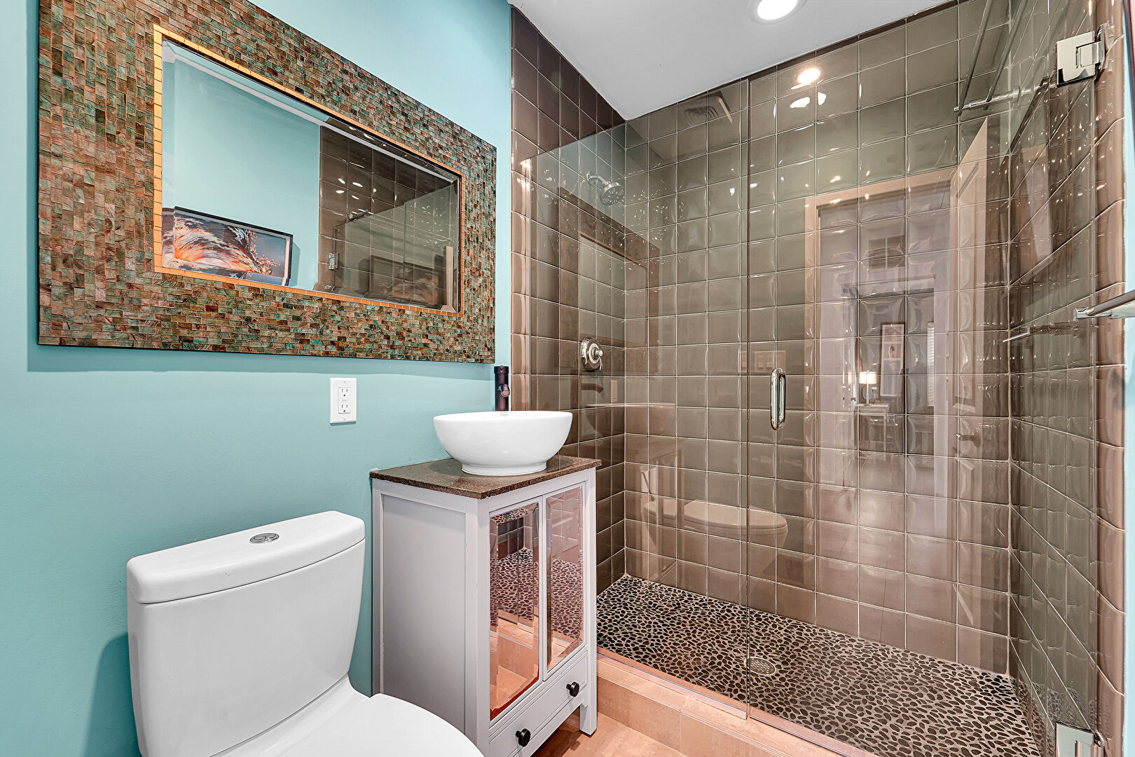 Baseboards Wall, Double Vanity, Drywall, Ensuite Bathroom, Full Bathroom, Natural Light, Recessed Lighting, Tile Floor, Tile Wall, Vent, Natural Light, Tile Floor