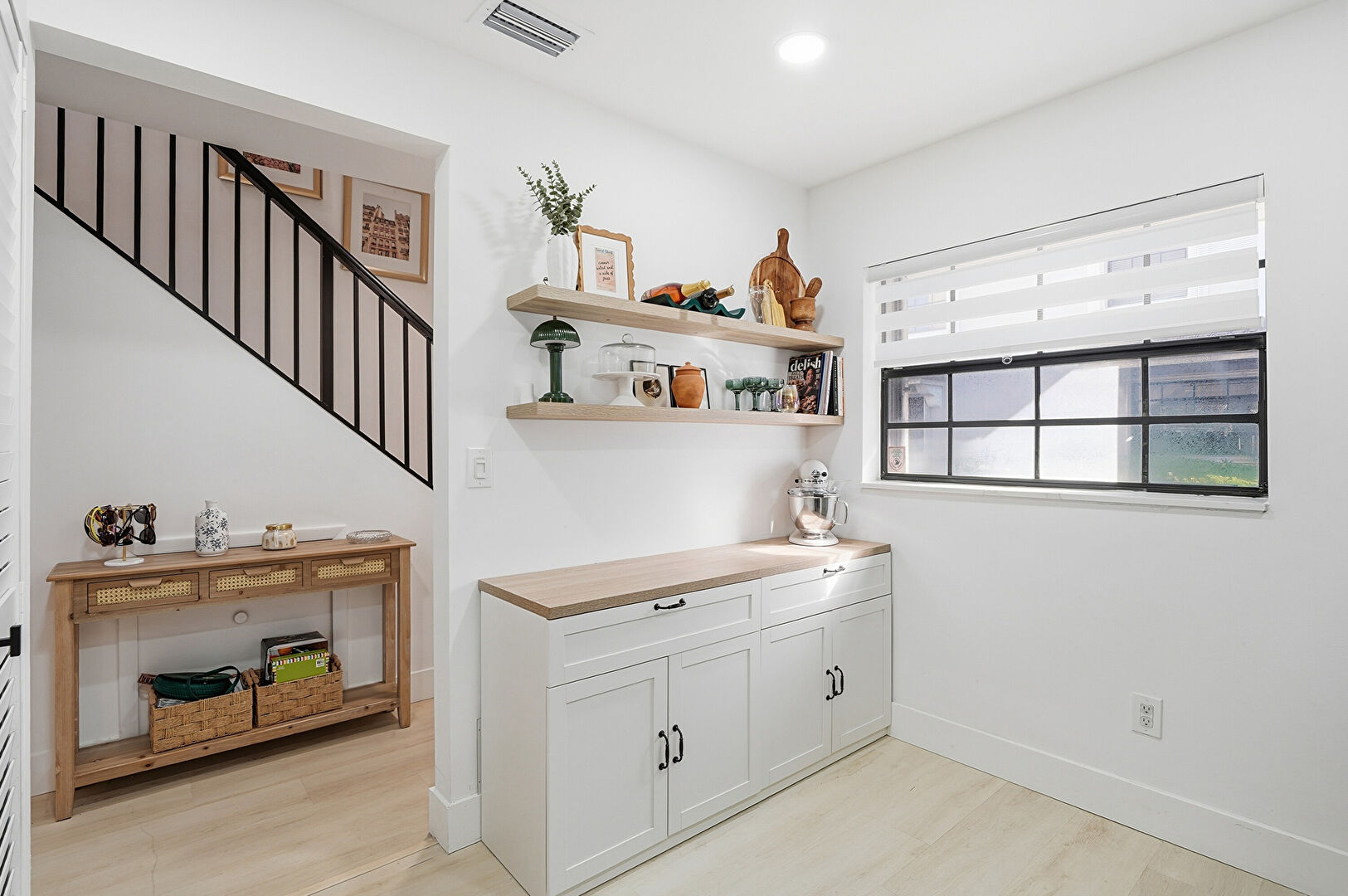 Baseboards Wall, Butcher Block Countertops, Drywall, Natural Light, Open Shelves, Recessed Lighting, Shaker Cabinets, Vent, Wood Finish Floor, Stairs
