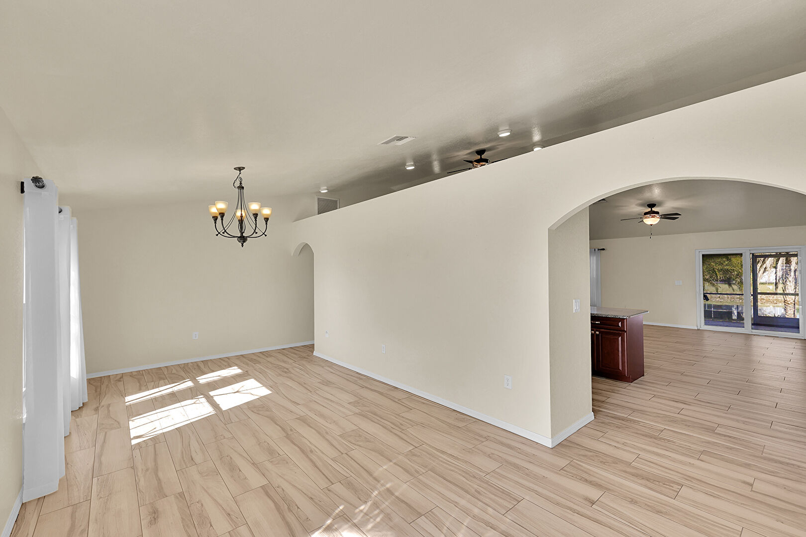 Arched Walkways, Baseboards Wall, Ceiling Fan, Drywall, Natural Light, Notable Chandelier, Vaulted Ceiling, Vent, Wood Finish Floor, Ceiling Fan, French Doors, Wood Finish Floor