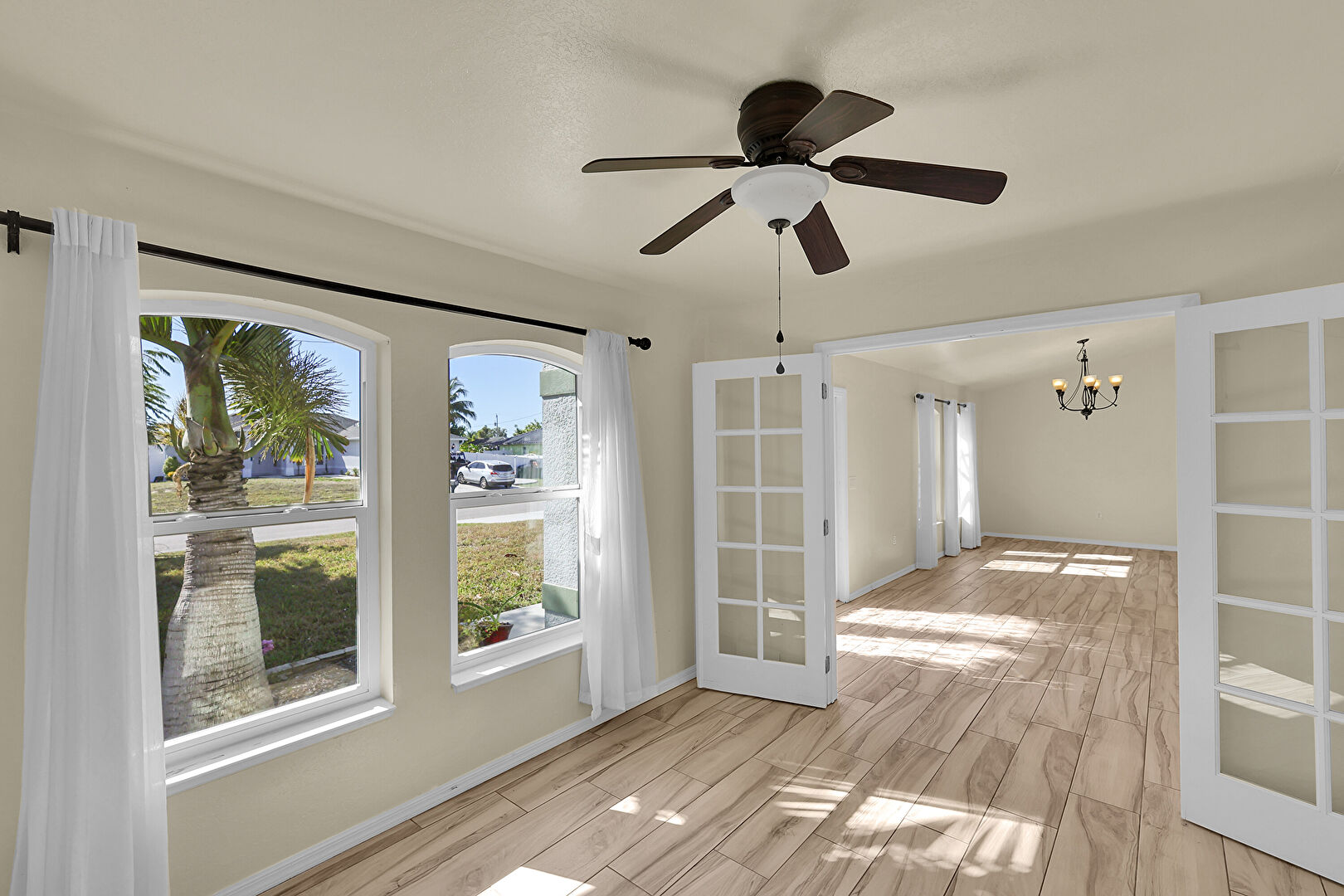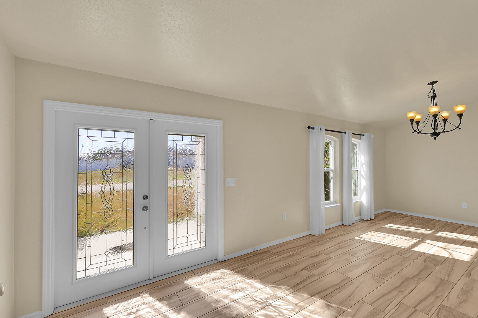 Baseboards Wall, Ceiling Fan, Drywall, French Doors, Natural Light, Notable Chandelier, Vent, Wood Finish Floor, Ceiling Fan, Wood Finish Floor