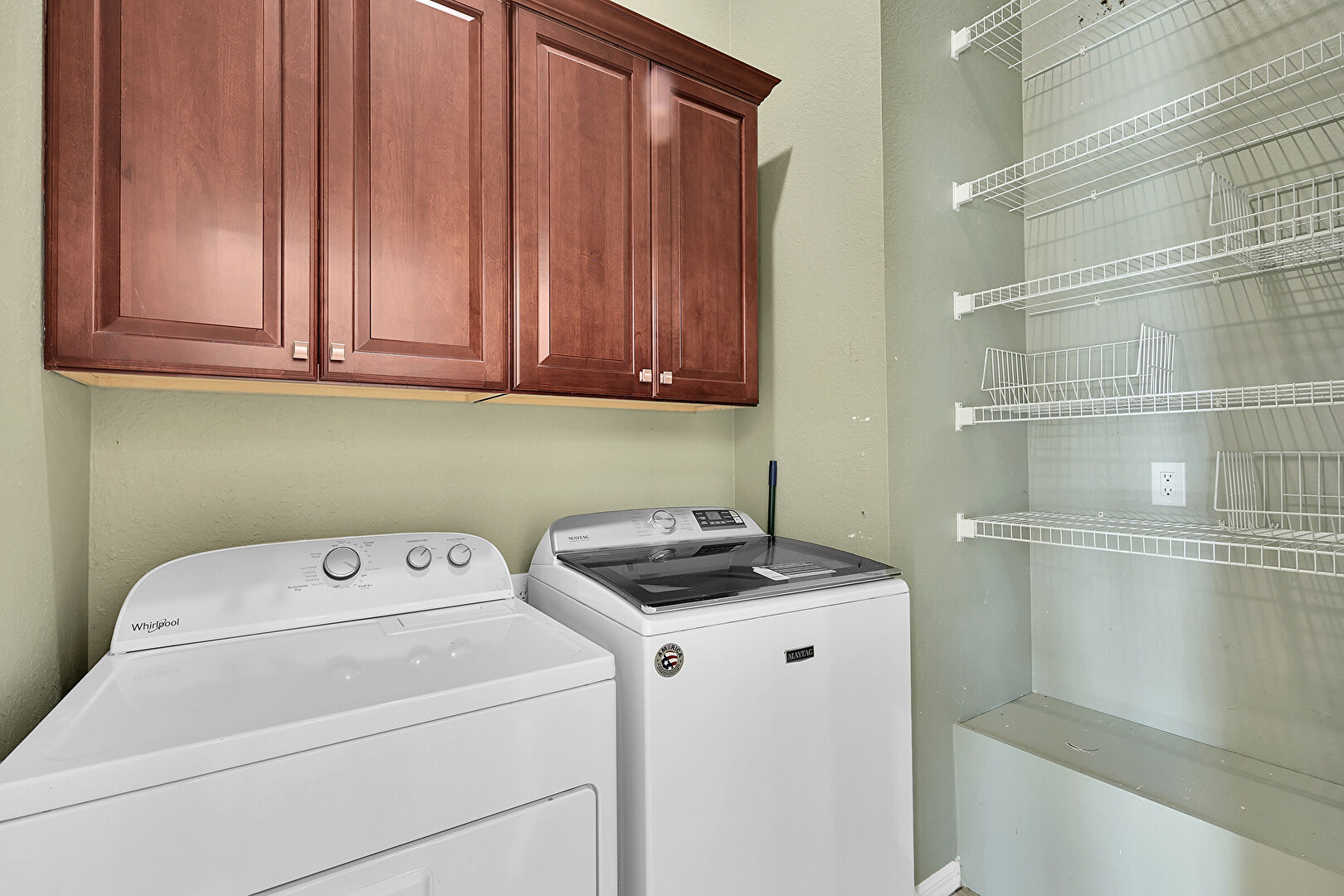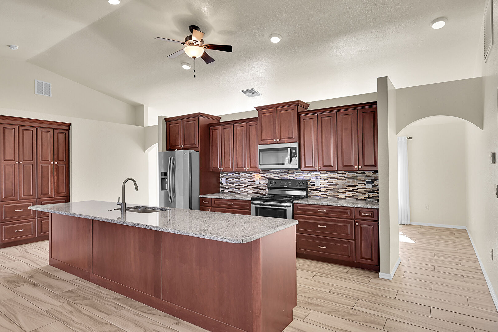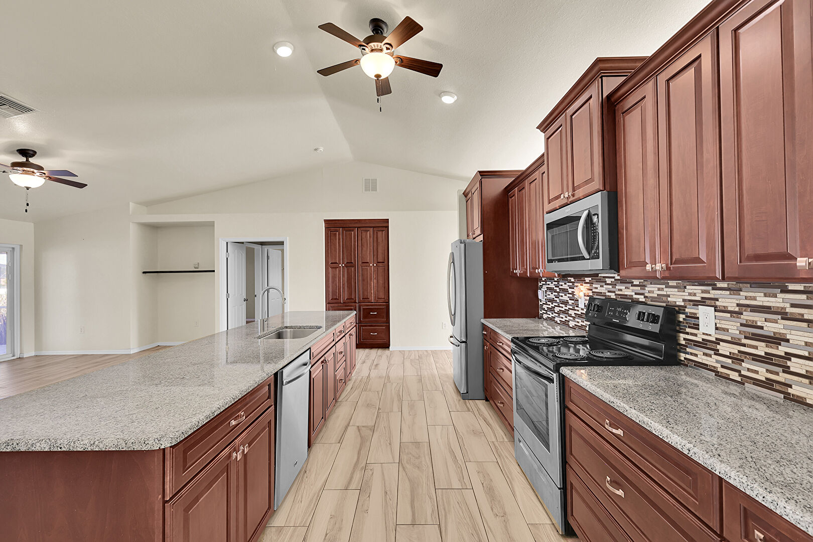 Arched Walkways, Baseboards Wall, Cathedral Ceiling, Ceiling Fan, Crown Molding Cabinets, Dark Brown Cabinets, Drywall, High Ceiling, Kitchen Bar, Kitchen Island, Laundry, Medium Brown Cabinets, Natural Light, One Wall Kitchen, Opens To Living Area, Raised Cabinets, Recessed Lighting, Reddish Brown Cabinets, Stone Countertops, Vaulted Ceiling, Vent, Washer Dryer, Wood Finish Floor, Baseboards Wall, Crown Molding Cabinets, Drywall, Kitchen Island, Natural Light, Raised Cabinets, Vent