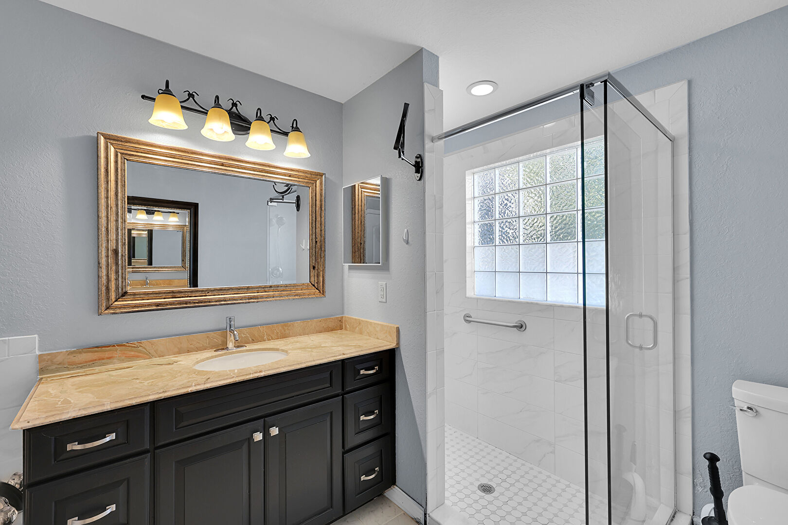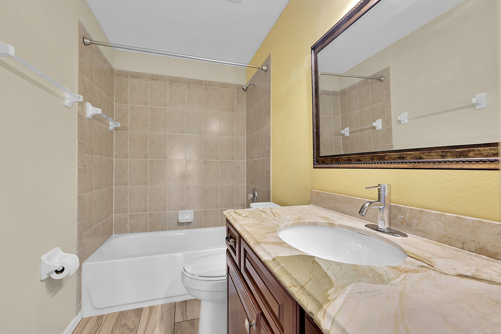 Baseboards Wall, Combined Bath Shower, Drywall, Full Bathroom, Natural Light, Textured Wall, Tile Floor, Vanity, Baseboards Wall, Recessed Lighting, Vanity, Wood Finish Floor