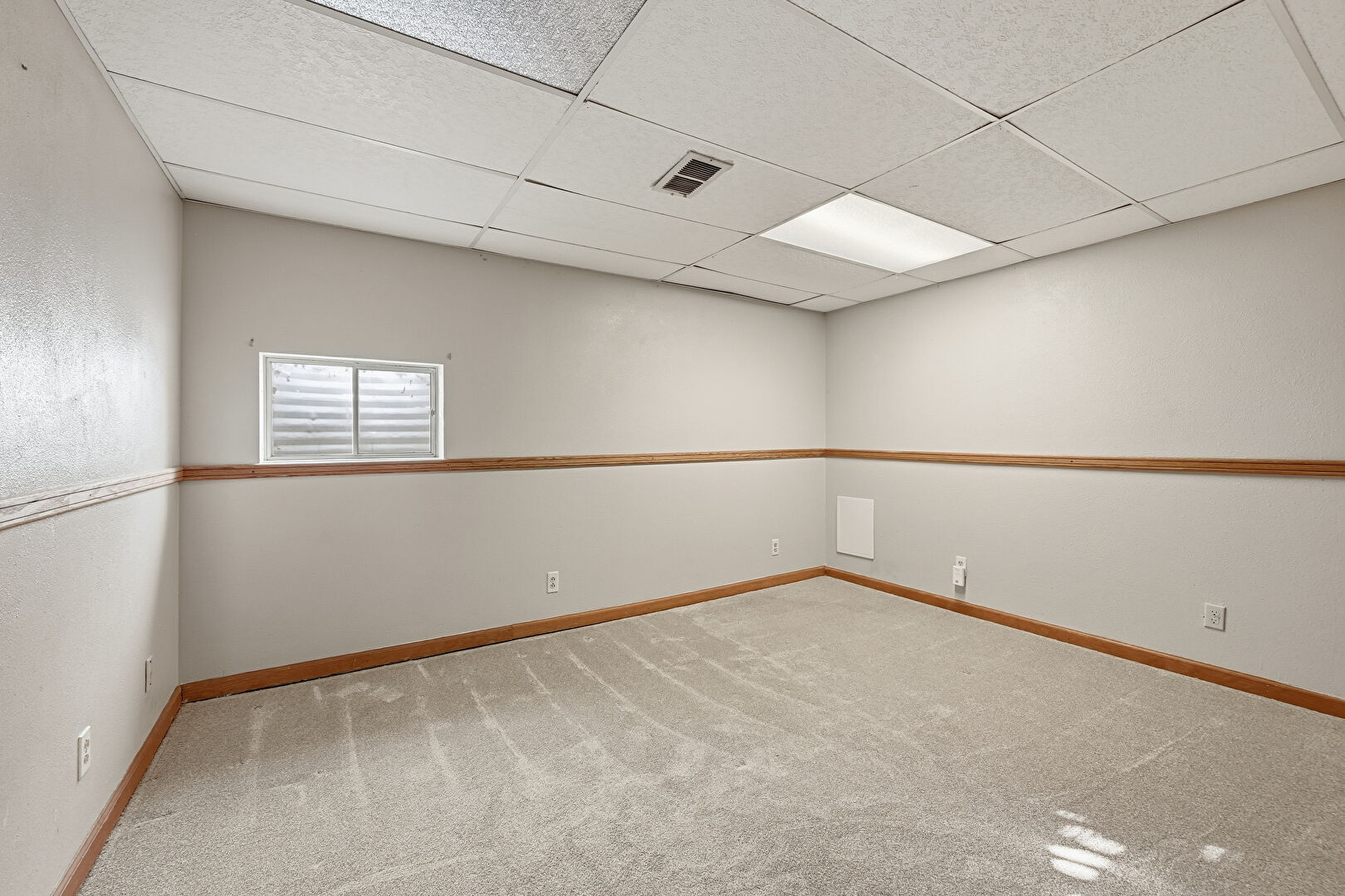 Baseboards Wall, Basement, Carpet, Ceiling Fan, Drop Ceiling, Drywall, Natural Light, Office Area, Textured Ceiling, Vent, Baseboards Wall, Drop Ceiling, Textured Ceiling, Vent