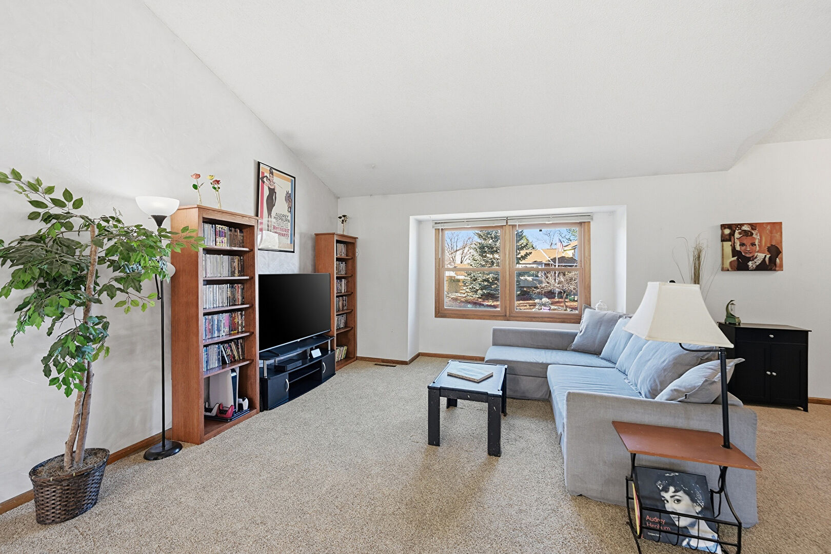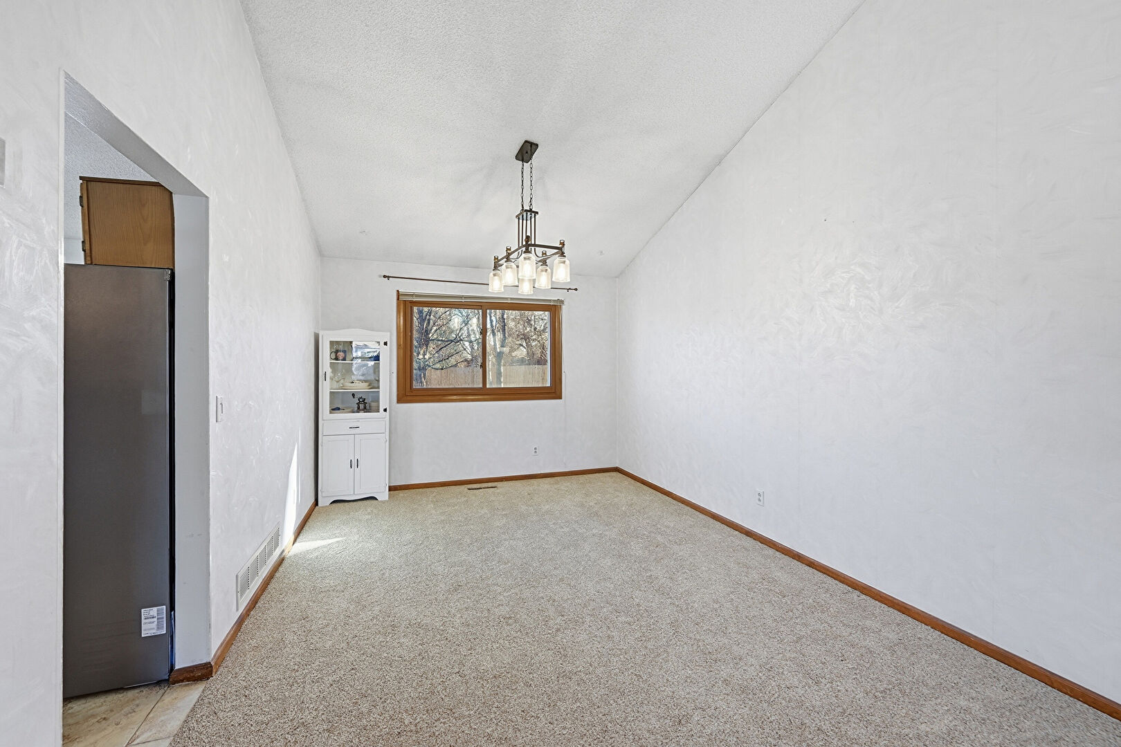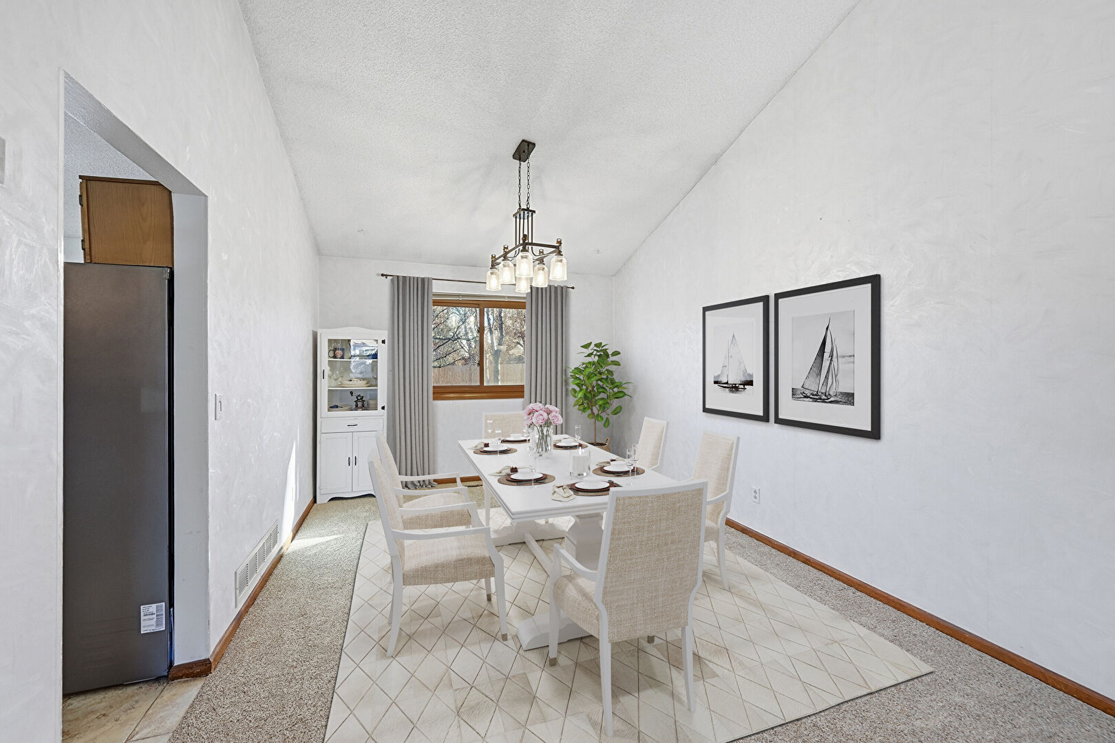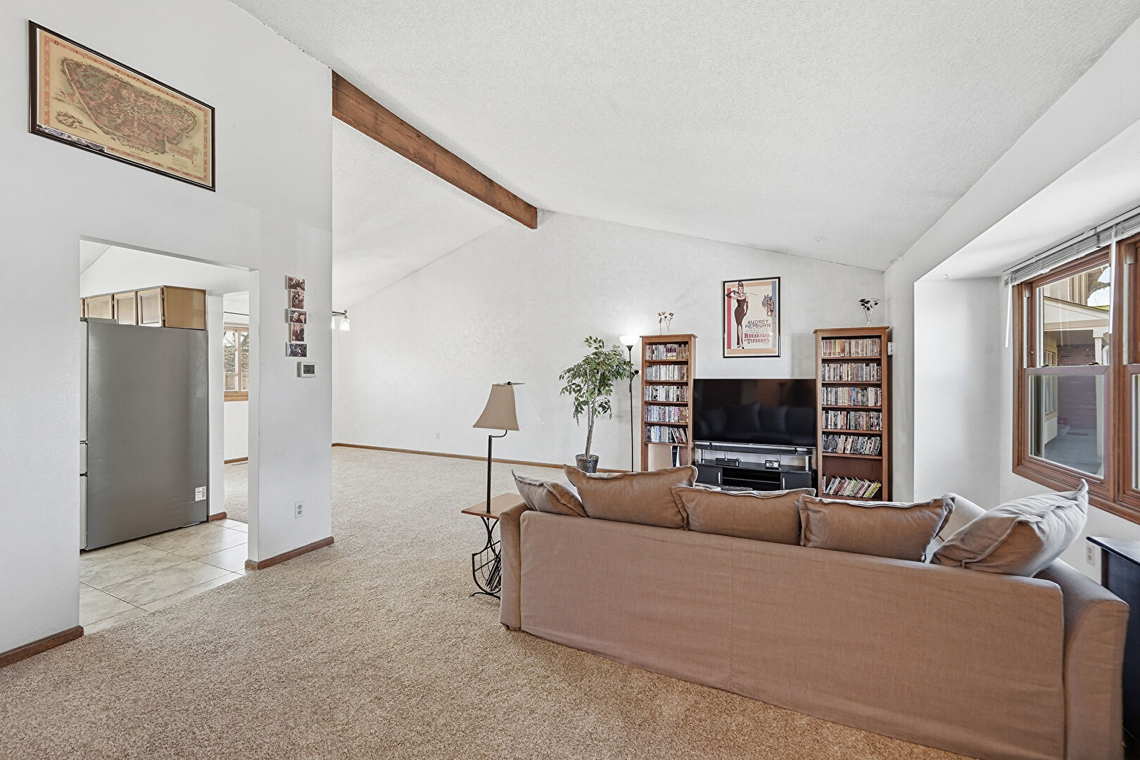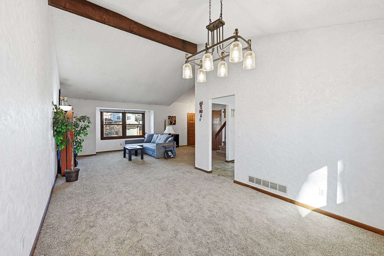Baseboards Wall, Beamed Ceiling, Carpet, Drywall, High Ceiling, Natural Light, Notable Chandelier, Tile Floor, Vaulted Ceiling, Vent, Textured Ceiling, Vent