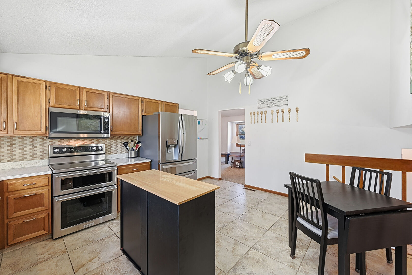 Baseboards Wall, Black Cabinets, Butcher Block Countertops, Ceiling Fan, Drywall, Fireplace, High Ceiling, Kitchen Island, L Shaped Kitchen, Medium Brown Cabinets, Natural Light, Open Shelves, Shaker Cabinets, Stone Countertops, Tile Floor, Vaulted Ceiling, Visible Hinge Cabinets, Kitchen Island, Medium Brown Cabinets, Textured Ceiling