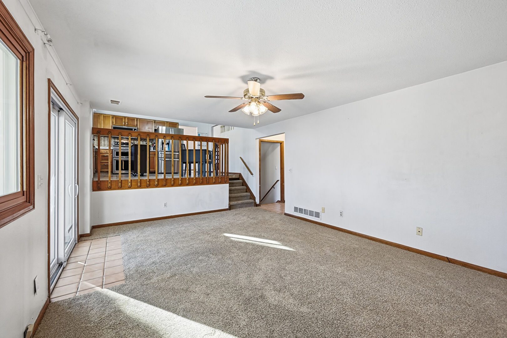 Accent Wall, Baseboards Wall, Carpet, Ceiling Fan, Drywall, Fireplace, Natural Light, Stairs, Tile Floor, Vent, Wood Wall, Drywall, Tile Floor, Wood Wall