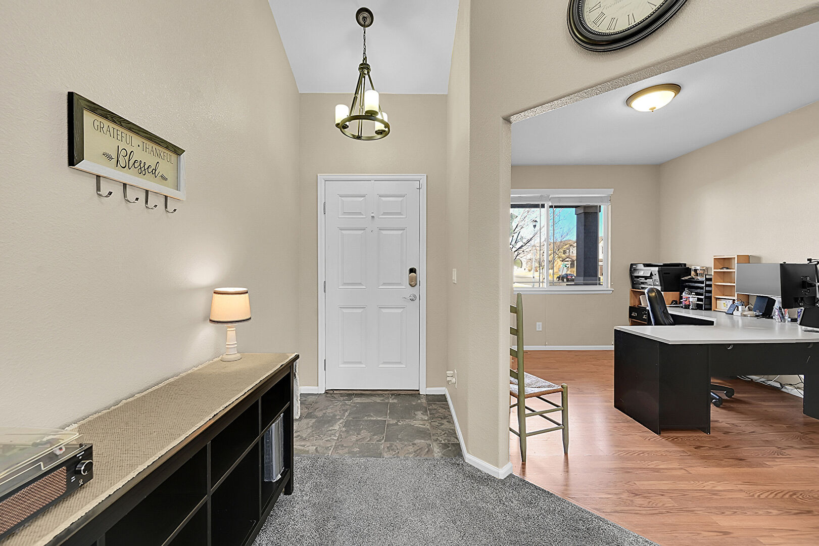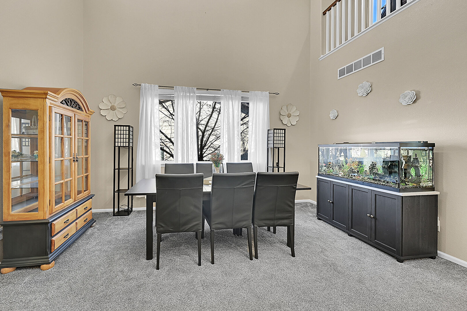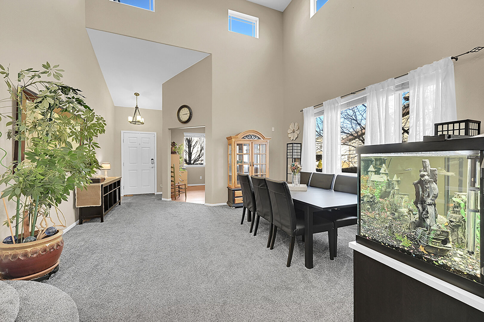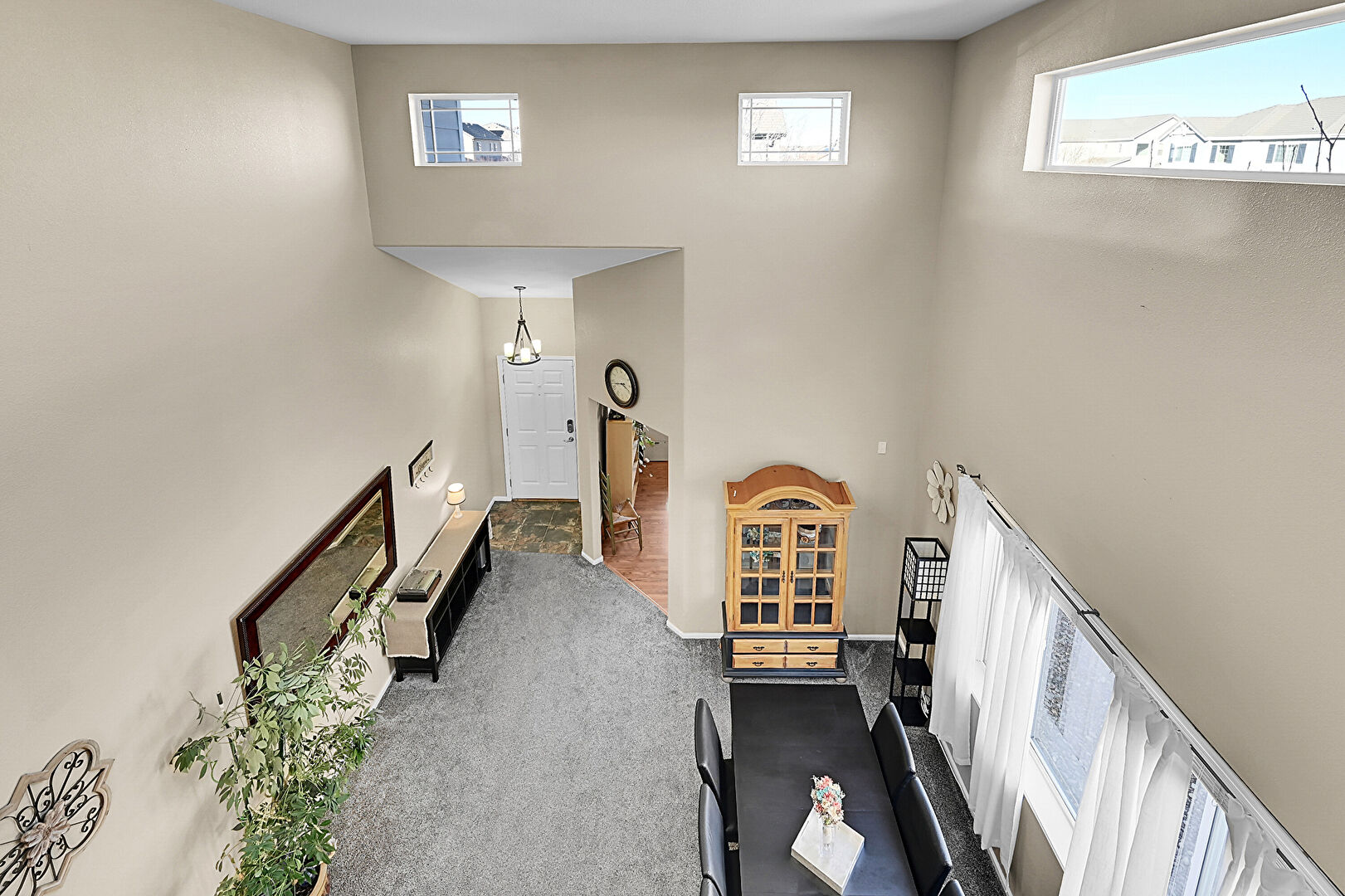 Baseboards Wall, Carpet, Drywall, High Ceiling, Natural Light, Notable Chandelier, Textured Wall, Vaulted Ceiling, Vent, Wood Finish Floor, Carpet, Recessed Lighting