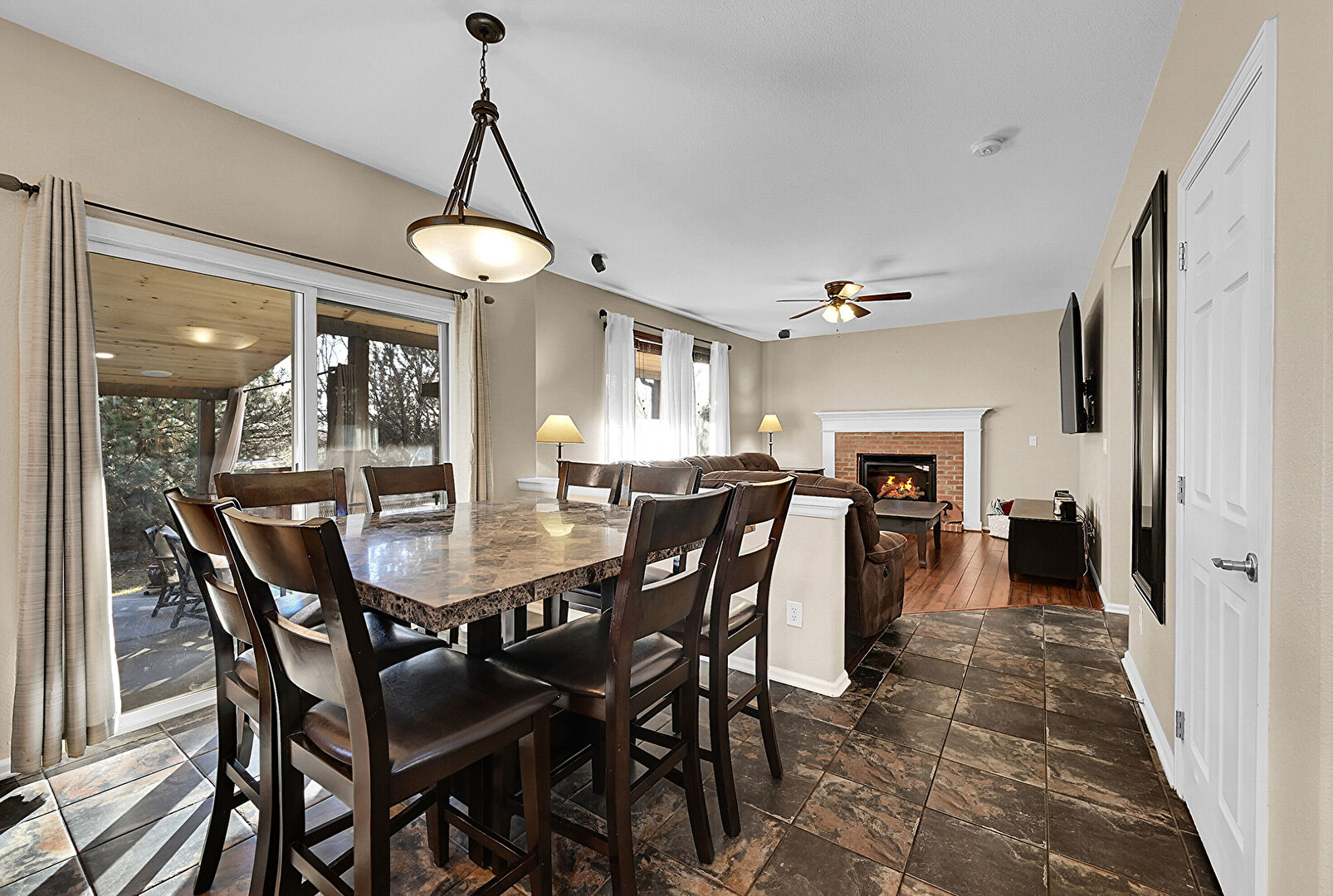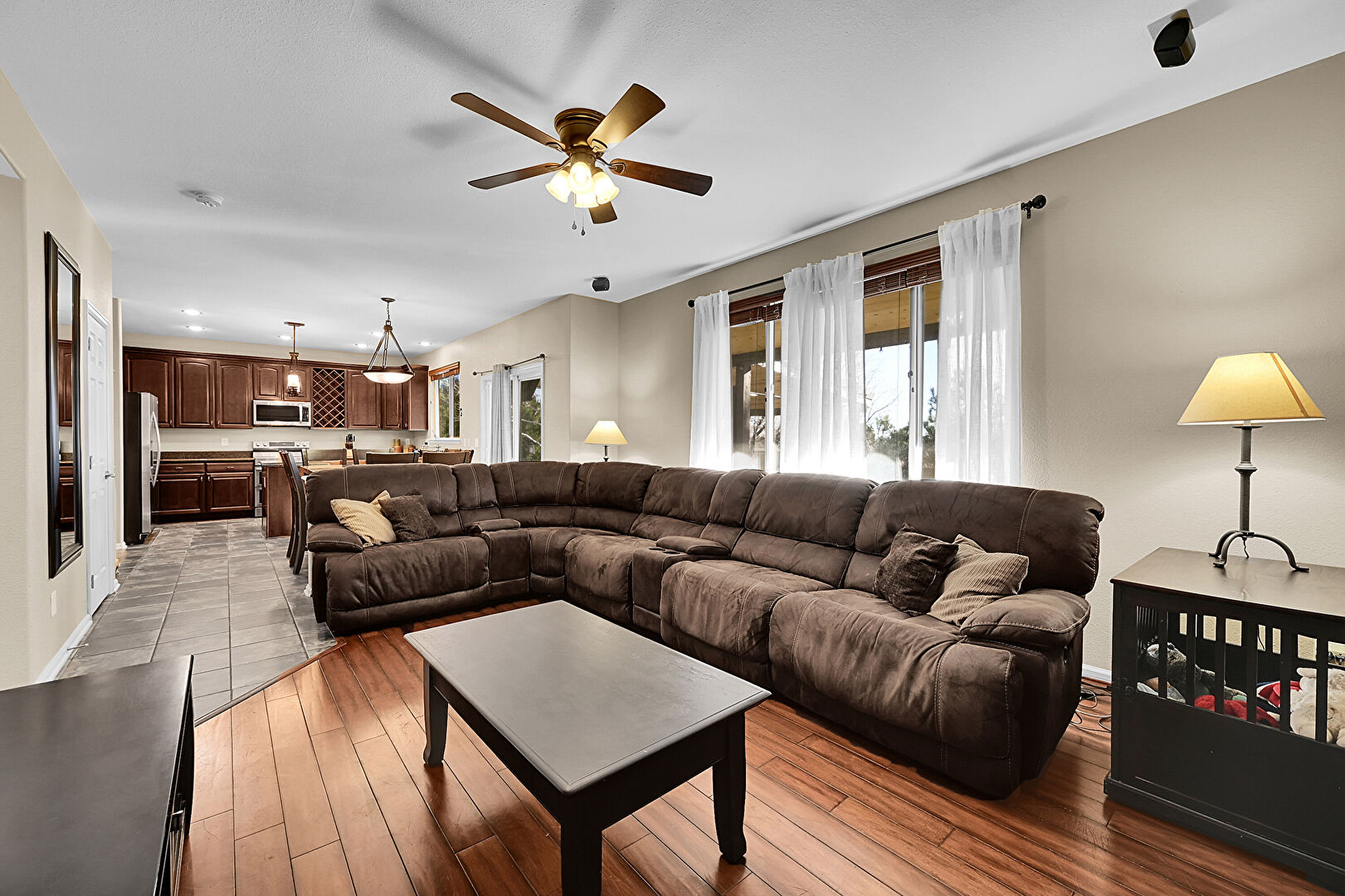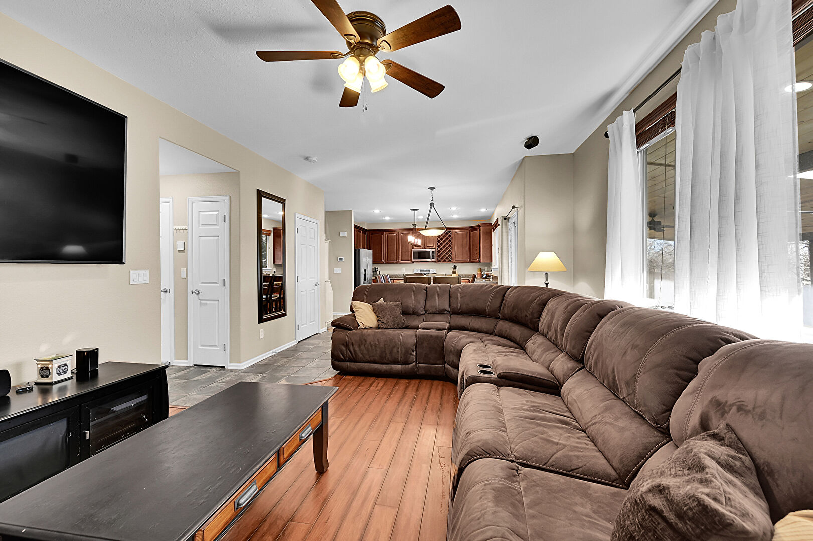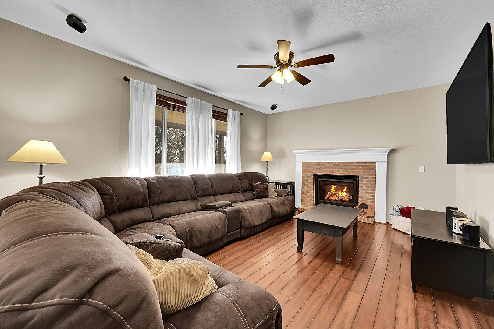 Baseboards Wall, Ceiling Fan, Drywall, Fireplace, L Shaped Kitchen, Natural Light, Recessed Lighting, Wood Finish Floor, Baseboards Wall, L Shaped Kitchen, Wood Finish Floor