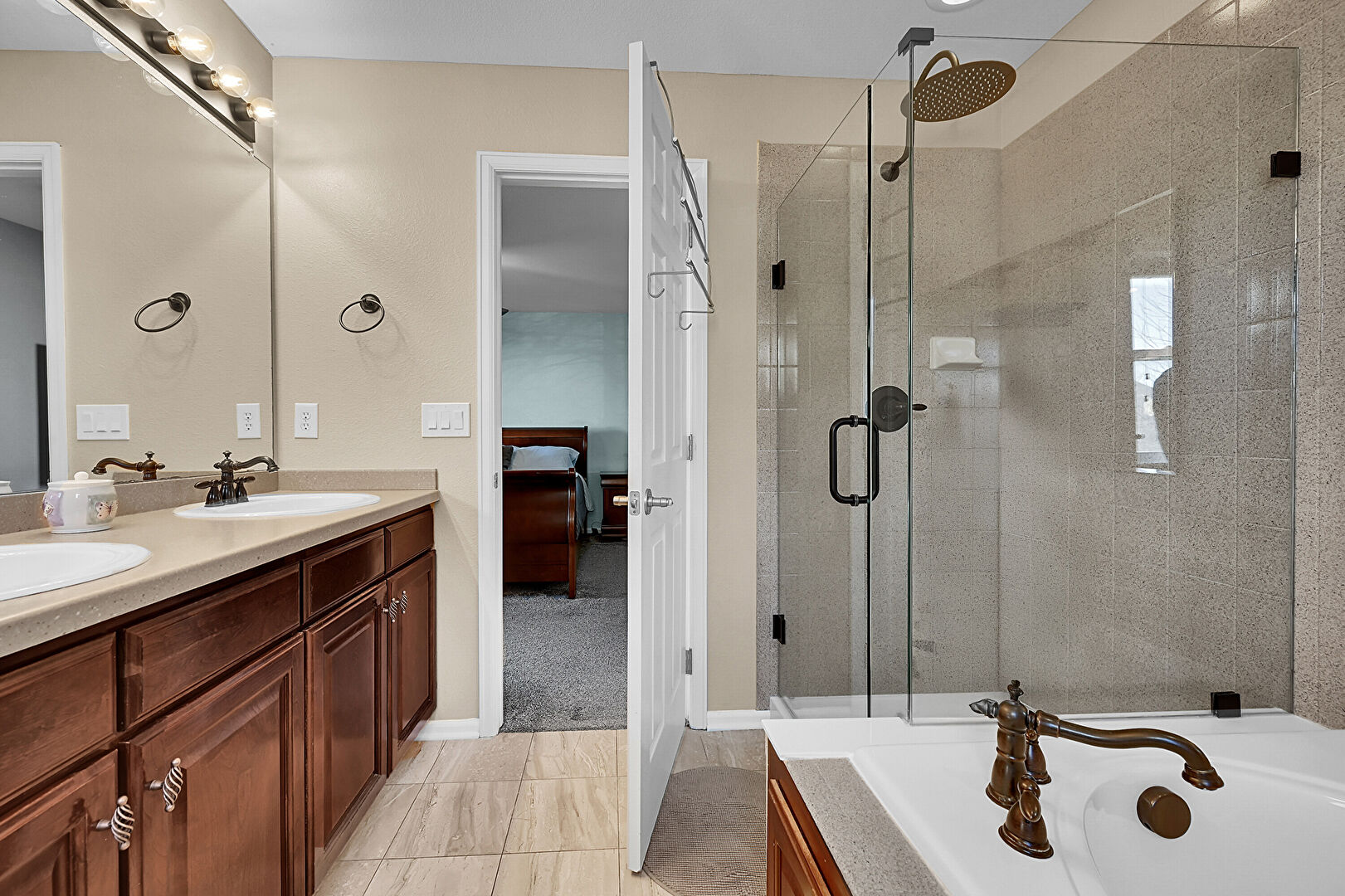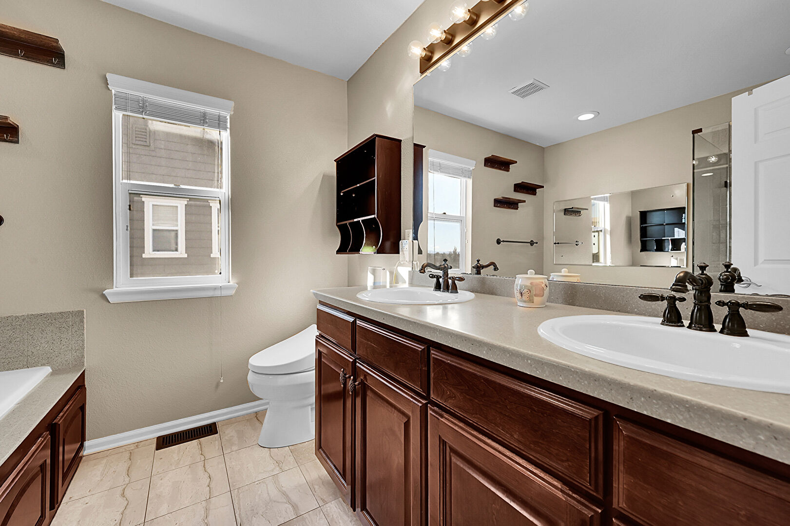 Baseboards Wall, Double Vanity, Drywall, Ensuite Bathroom, Full Bathroom, Marble Finish Floor, Natural Light, Vent, Double Vanity, Marble Finish Floor