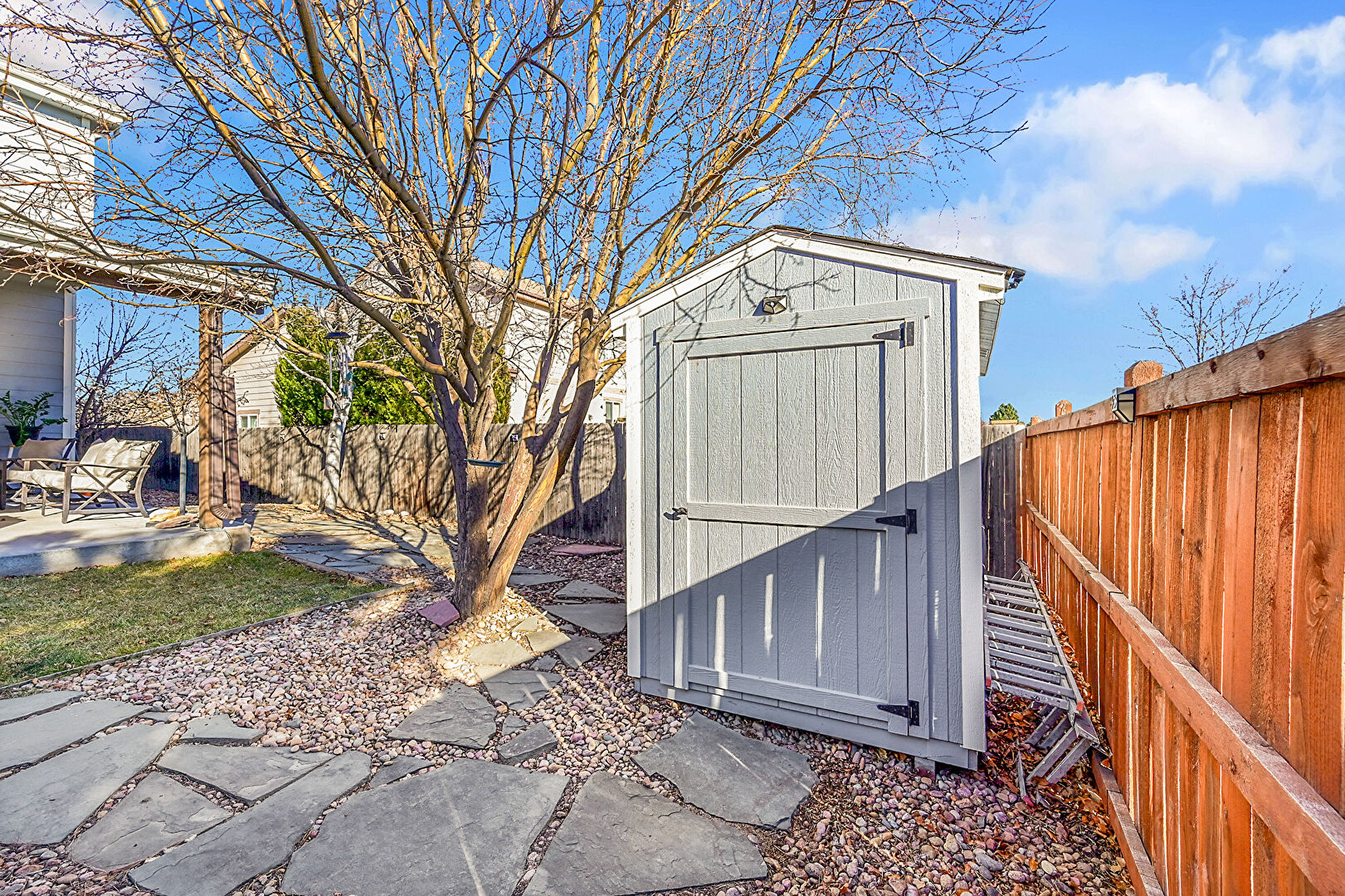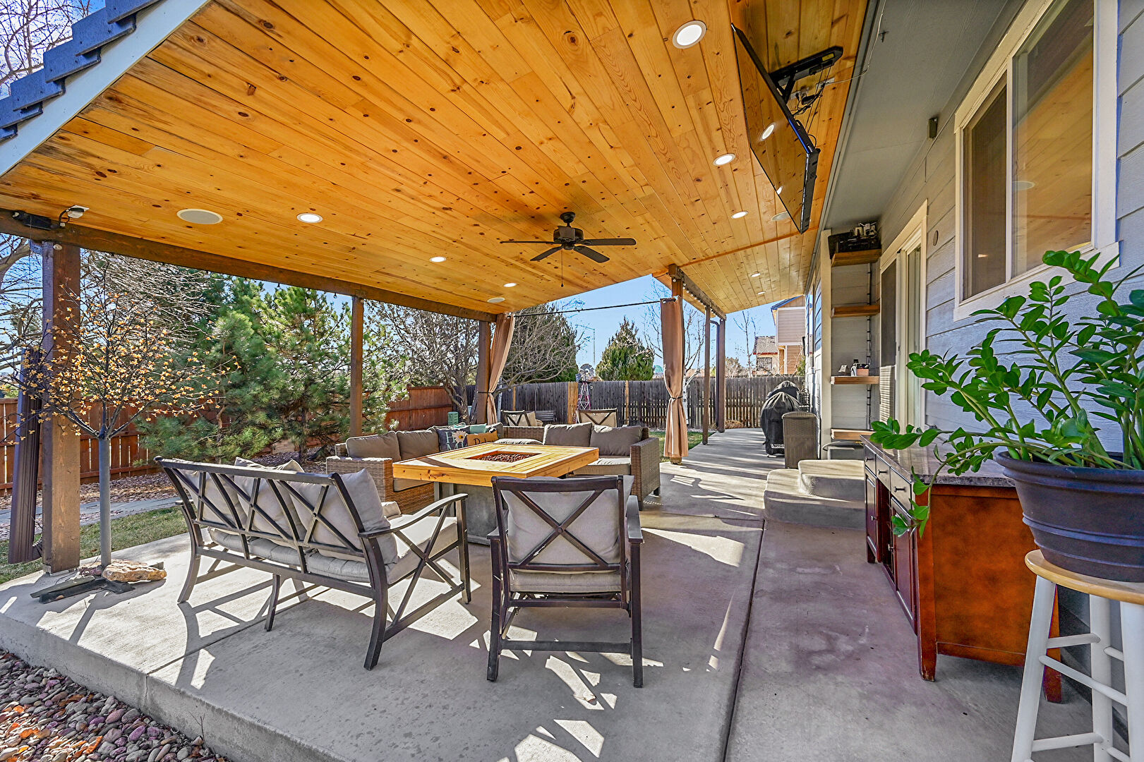 Ceiling Fan, Fence, Fire Pit, Grill, Lawn, Outdoor Dining Area, Outdoor Living Space, Outdoor Structure, Patio, Shed, Fence, Outdoor Living Space