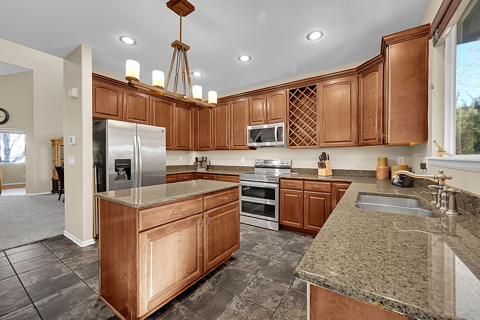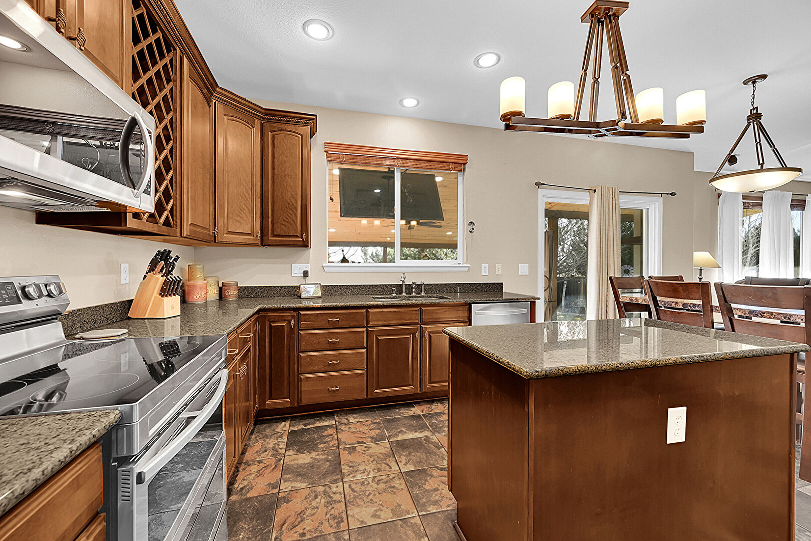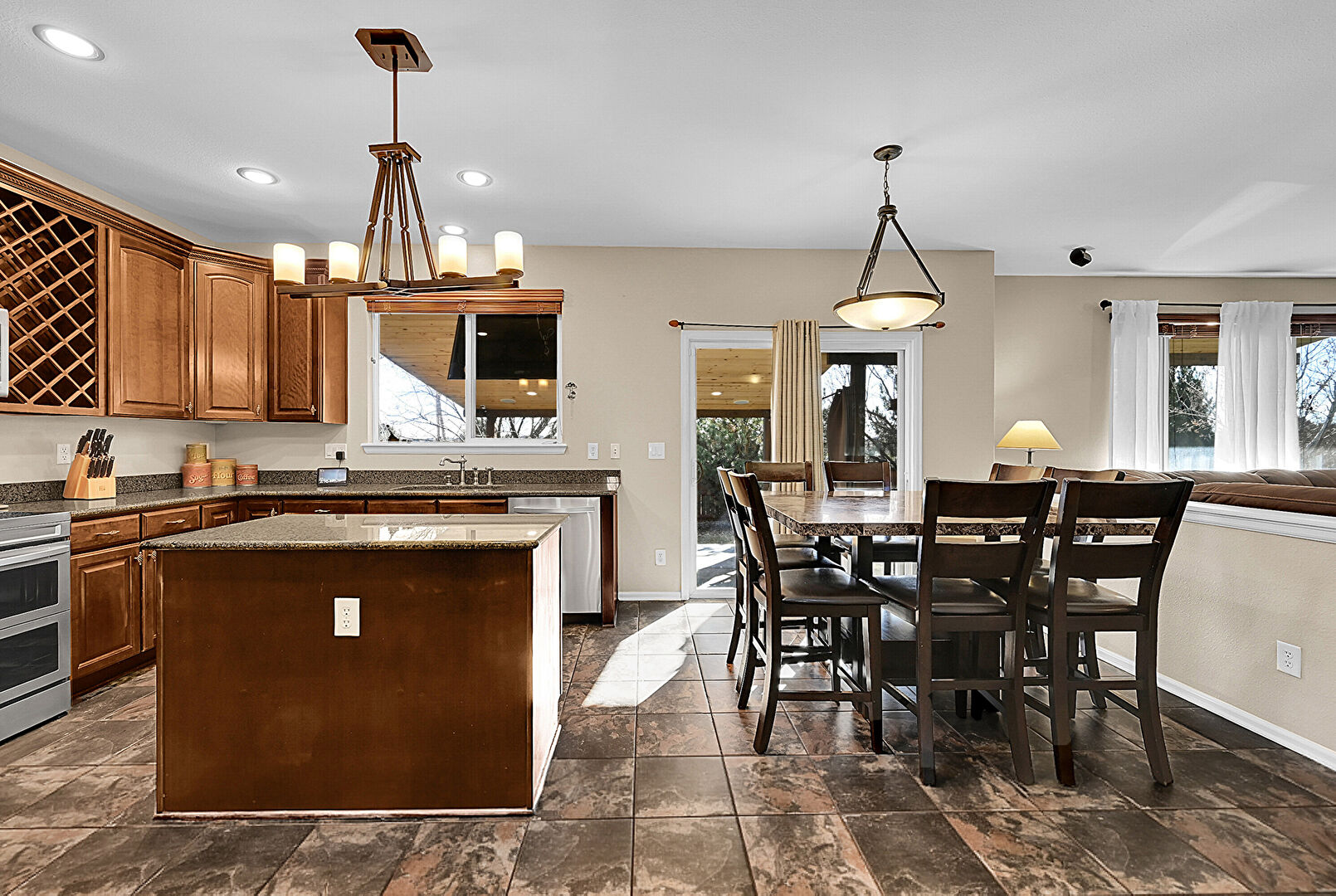 Arched Cabinets, Baseboards Wall, Crown Molding Cabinets, Dark Brown Cabinets, Drywall, Kitchen Island, Medium Brown Cabinets, Natural Light, Notable Chandelier, Opens To Living Area, Pendant Lighting, Raised Cabinets, Recessed Lighting, Stone Countertops, Stone Finish Floor, U Shaped Kitchen, Arched Cabinets, Drywall, Kitchen Island, Raised Cabinets, Recessed Lighting, Stone Countertops