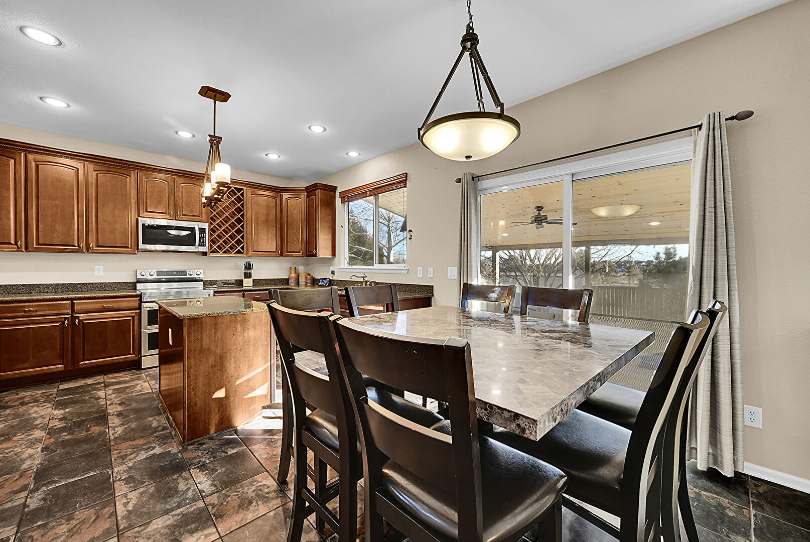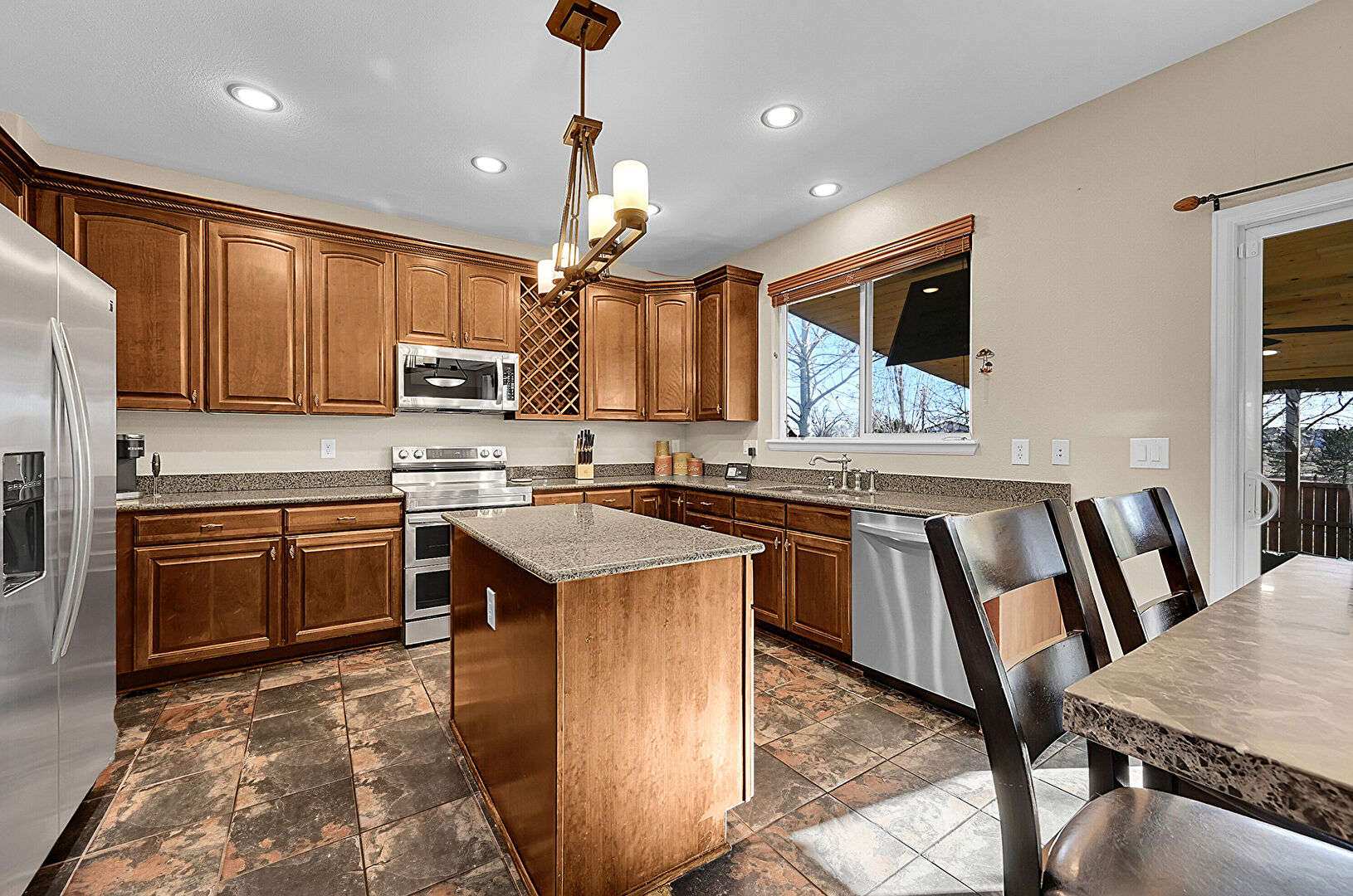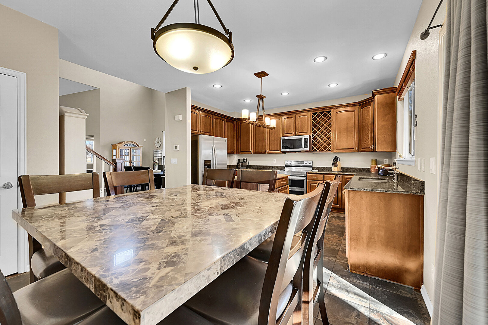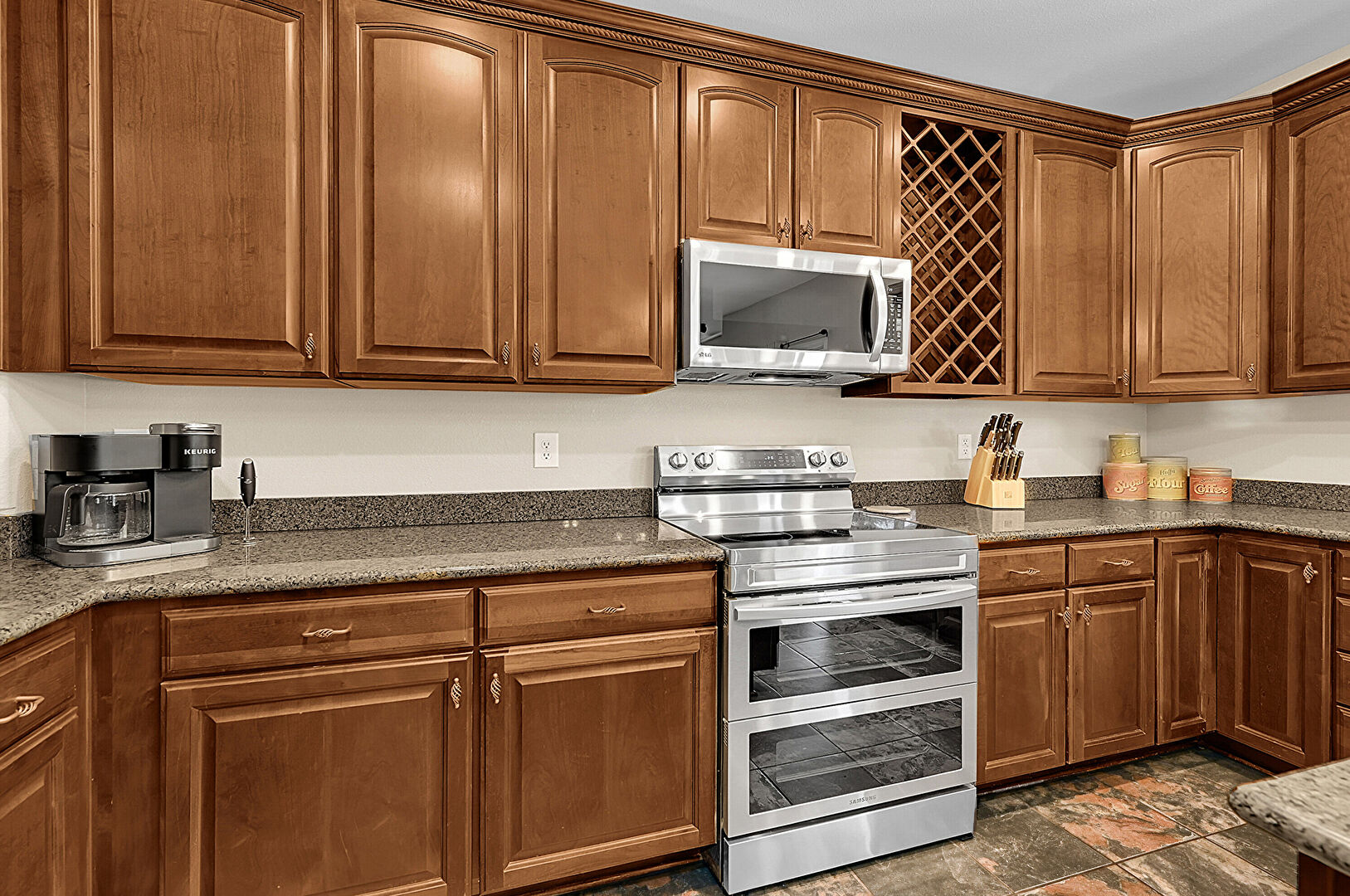 Arched Cabinets, Baseboards Wall, Crown Molding Cabinets, Dark Brown Cabinets, Drywall, Kitchen Island, Medium Brown Cabinets, Natural Light, Notable Chandelier, Opens To Living Area, Pendant Lighting, Raised Cabinets, Recessed Lighting, Stone Countertops, Stone Finish Floor, U Shaped Kitchen, Arched Cabinets, Drywall, Kitchen Island, Raised Cabinets, Recessed Lighting, Stone Countertops