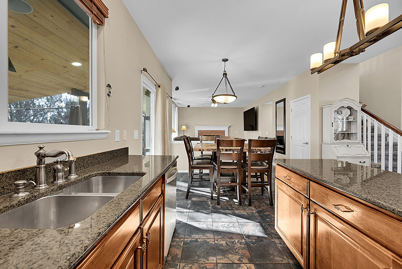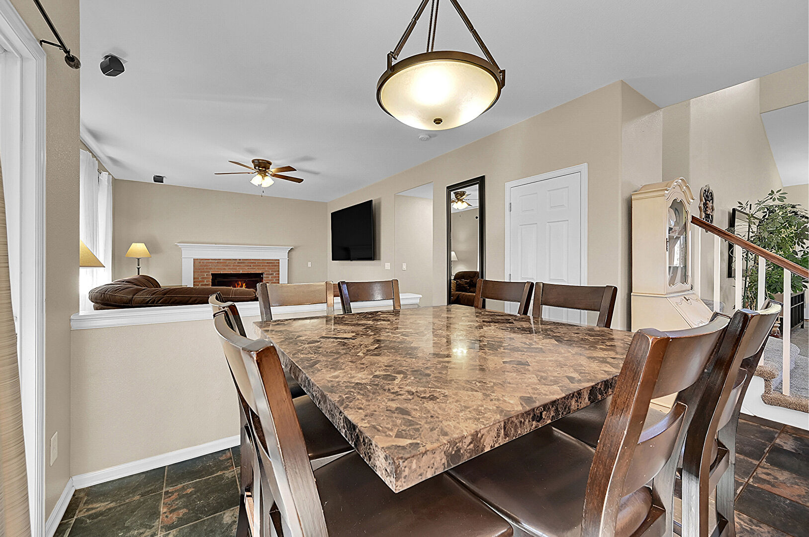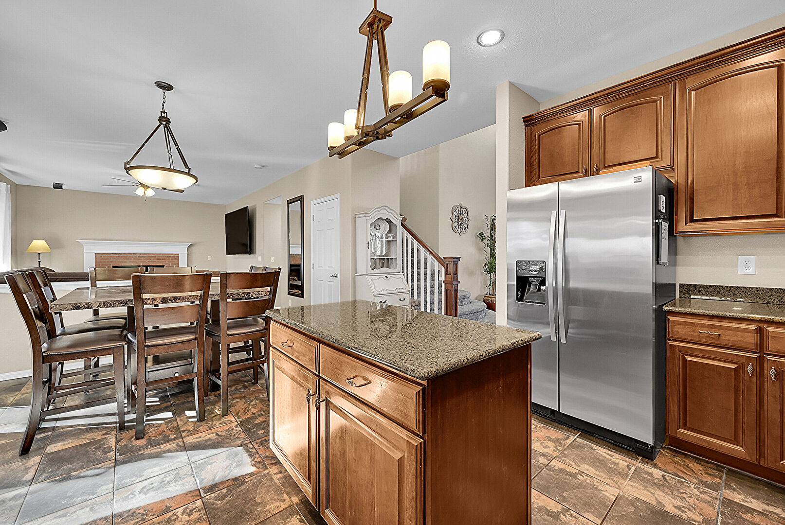 Baseboards Wall, Ceiling Fan, Drywall, Fireplace, Natural Light, Notable Chandelier, Recessed Lighting, Stairs, Stone Finish Floor, Drywall, Natural Light, Stone Finish Floor, U Shaped Kitchen