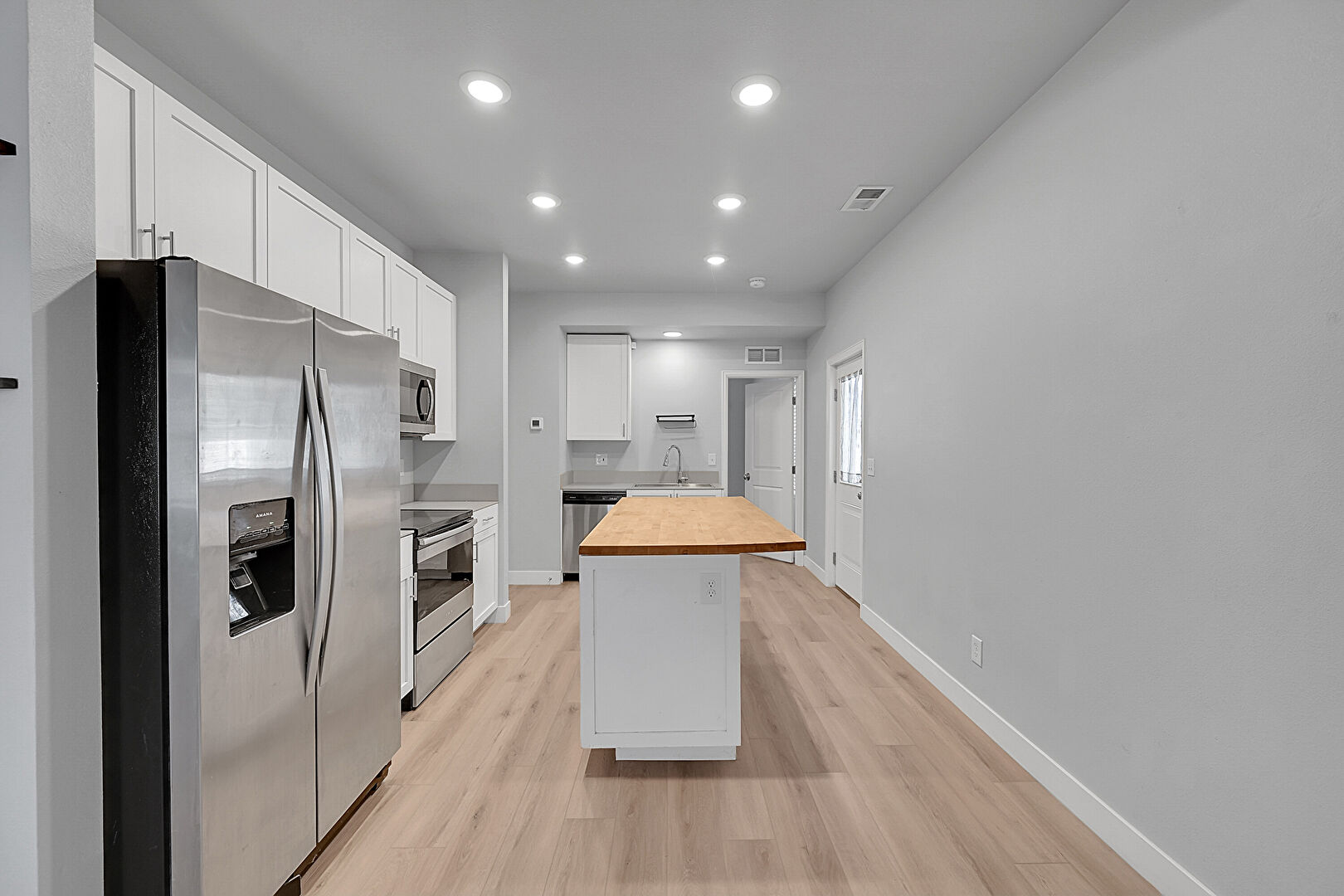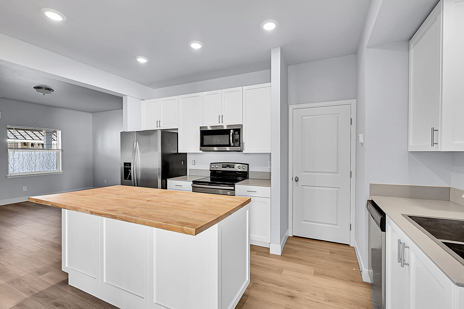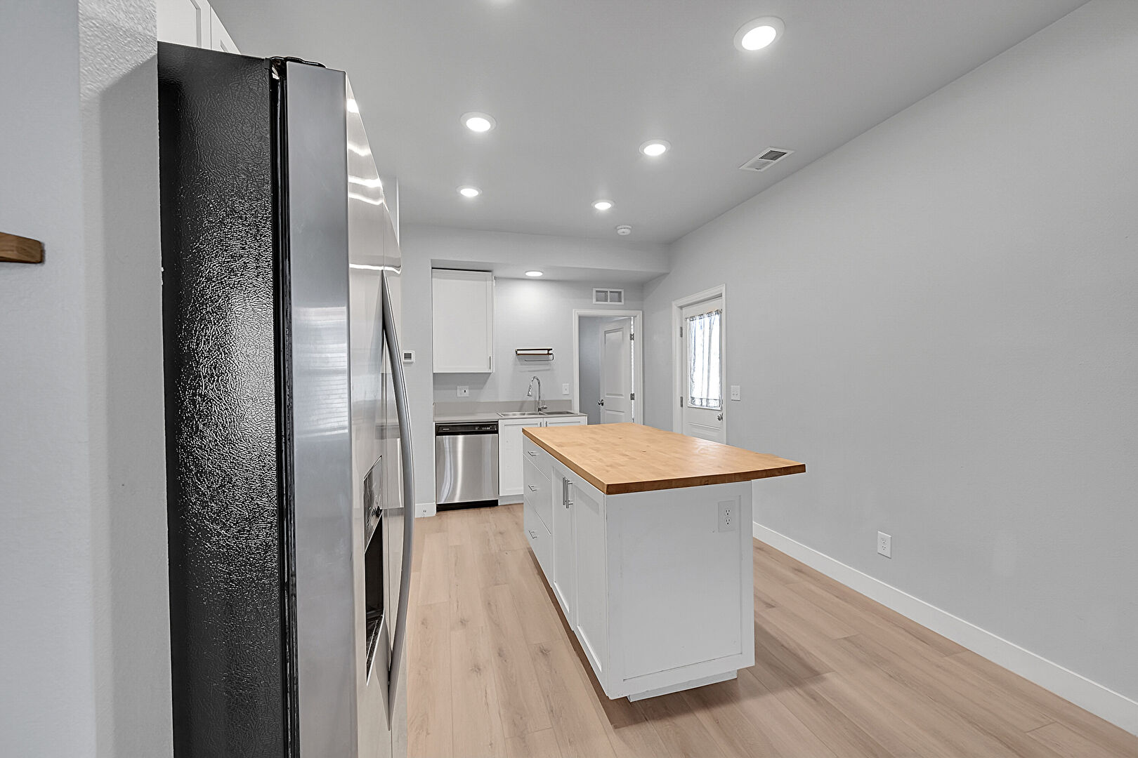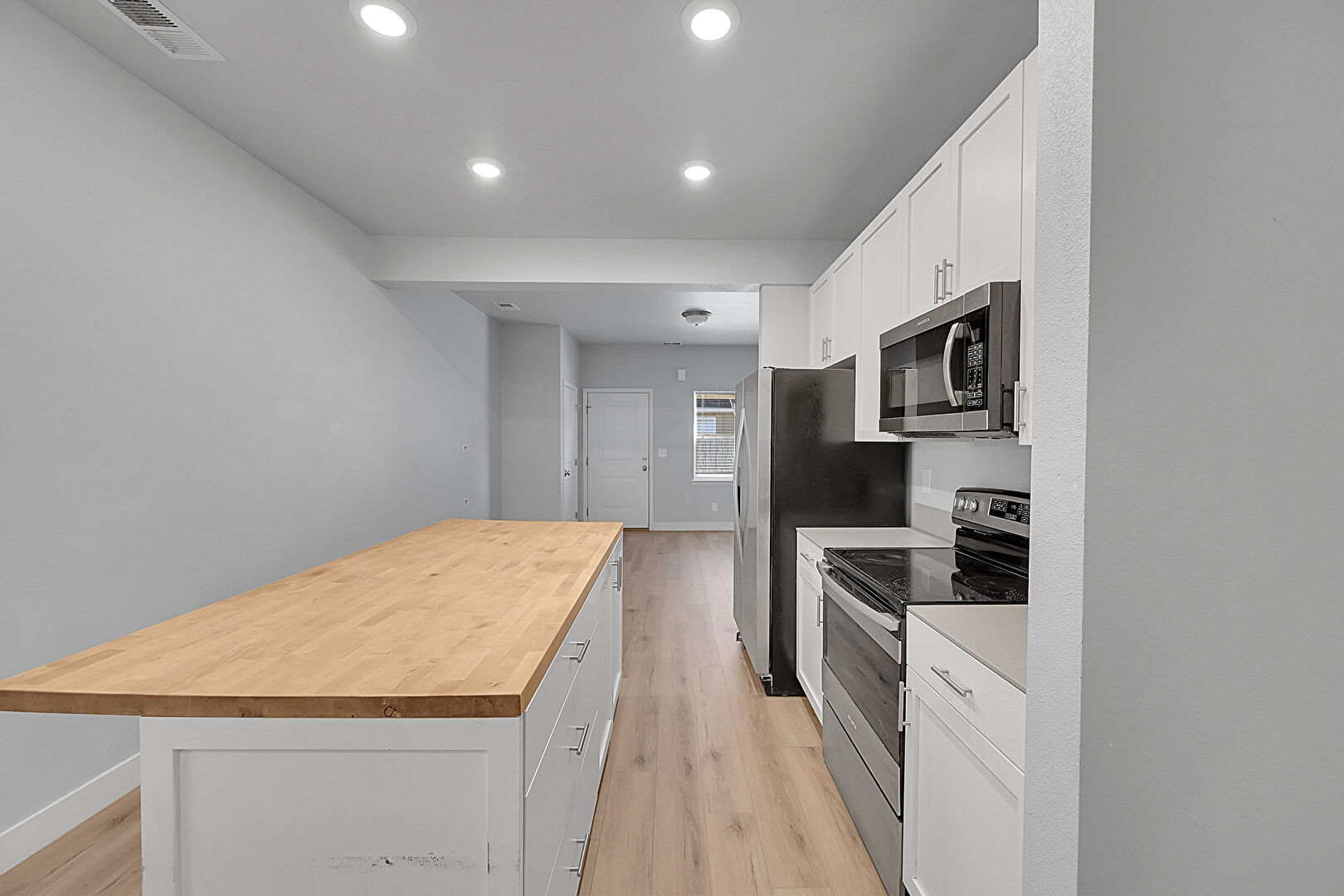 Baseboards Wall, Butcher Block Countertops, Drywall, Kitchen Bar, Kitchen Island, L Shaped Kitchen, Natural Light, Recessed Lighting, Shaker Cabinets, Stone Countertops, Vent, Wood Finish Floor, Butcher Block Countertops, Ceiling Fan, Drywall, Kitchen Island, L Shaped Kitchen, Recessed Lighting, Shaker Cabinets, Wood Finish Floor