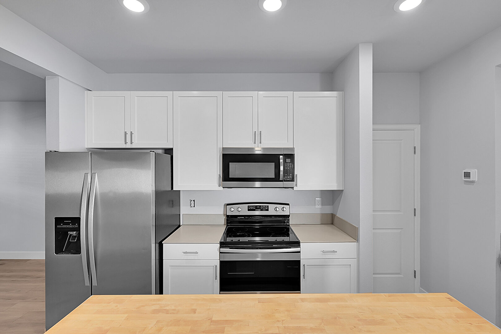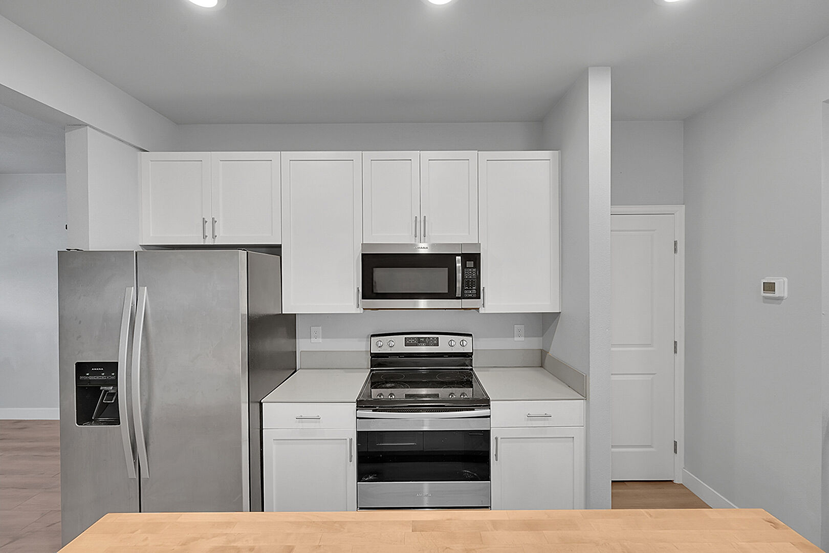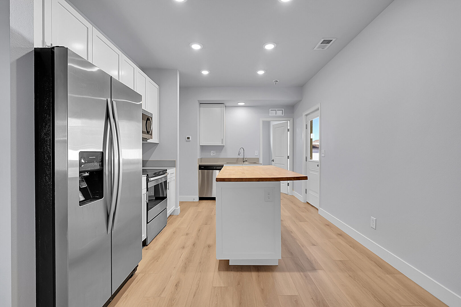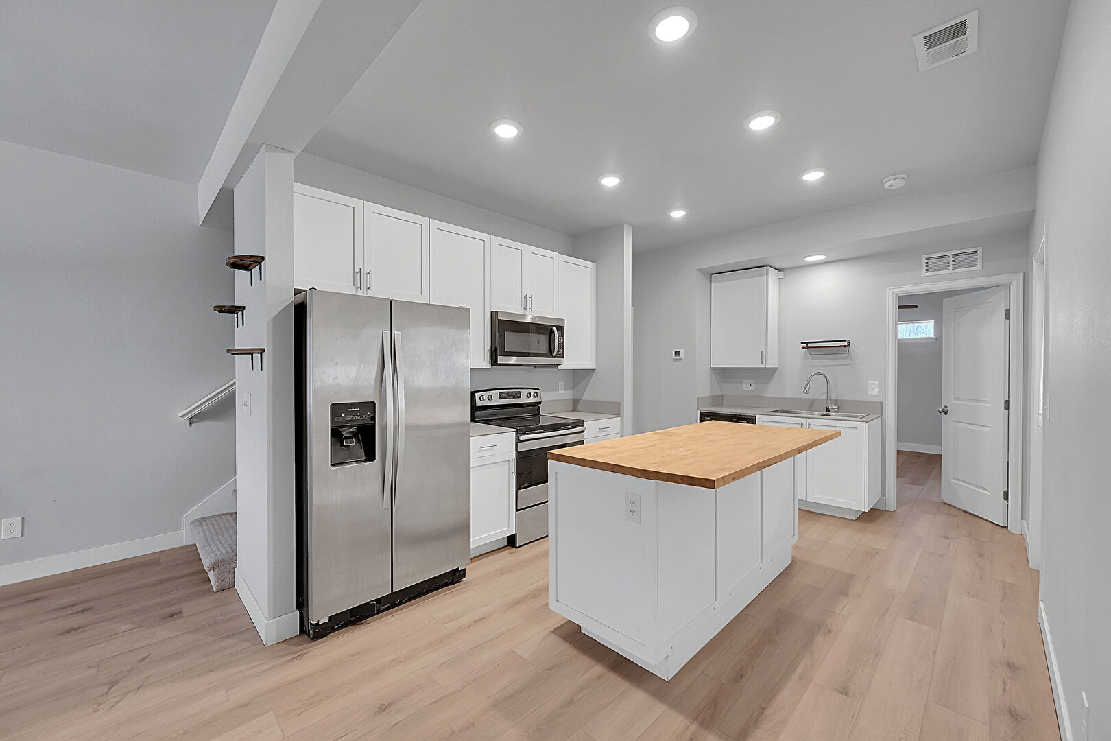 Baseboards Wall, Butcher Block Countertops, Drywall, Kitchen Bar, Kitchen Island, L Shaped Kitchen, Natural Light, Recessed Lighting, Shaker Cabinets, Stone Countertops, Vent, Wood Finish Floor, Butcher Block Countertops, Ceiling Fan, Drywall, Kitchen Island, L Shaped Kitchen, Recessed Lighting, Shaker Cabinets, Wood Finish Floor