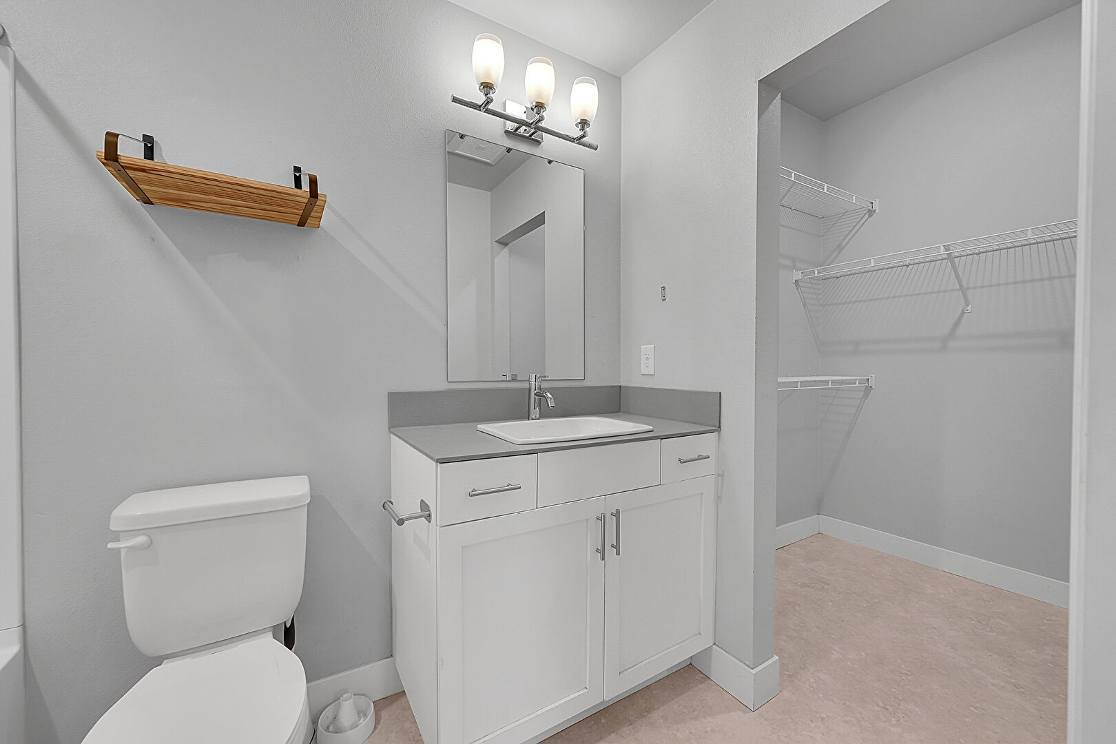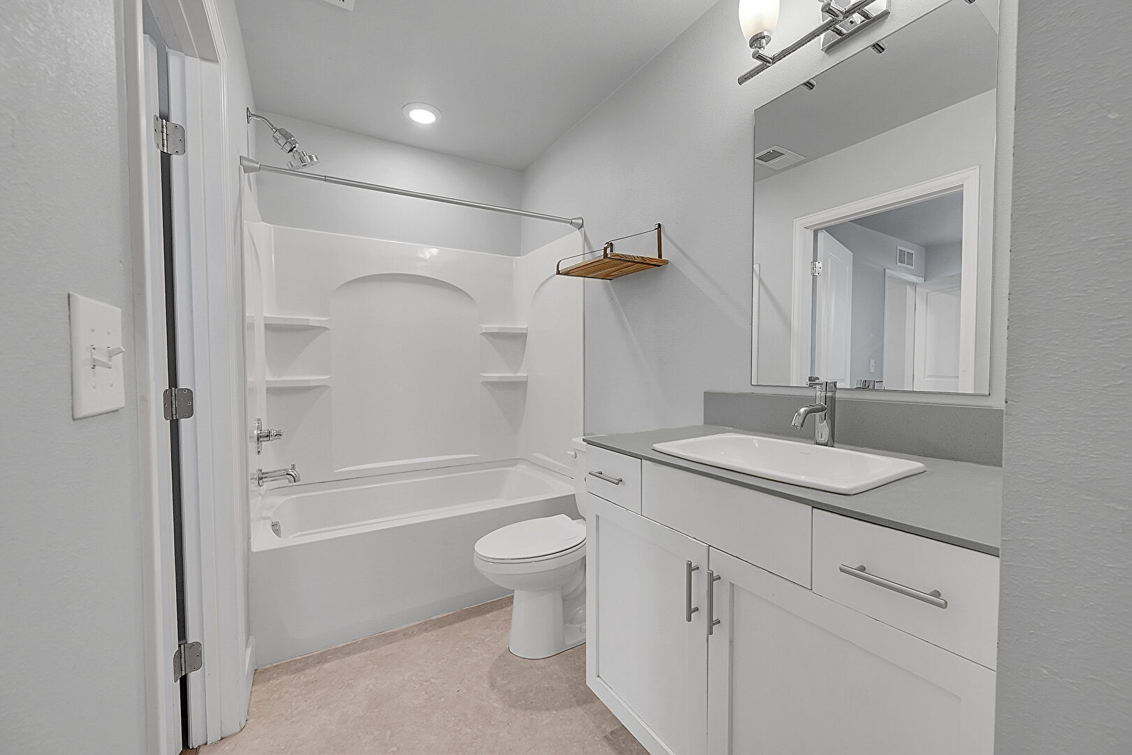 Baseboards Wall, Combined Bath Shower, Drywall, Full Bathroom, Recessed Lighting, Textured Wall, Tile Floor, Vanity, Vent, Vinyl Floor, Walk In Closet, Full Bathroom, Vanity