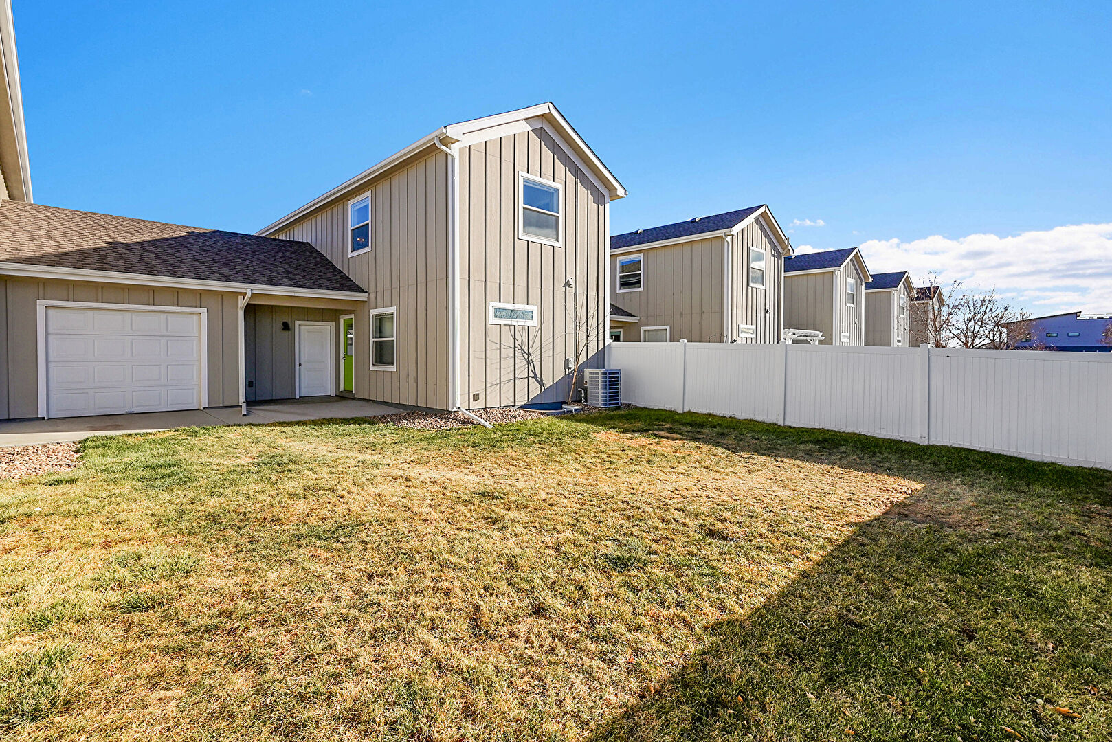 Board Batten Siding, Concrete Foundation, Downspout, Fence, Gutters, Lawn, Residential View, Split Ac Unit, Vertical Siding, Shingle Roof