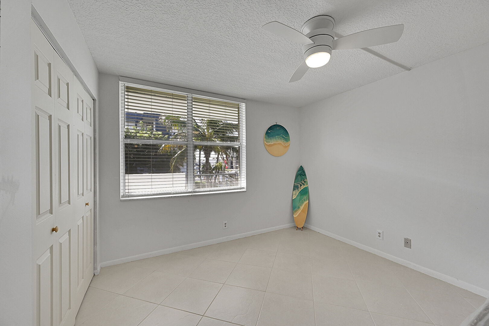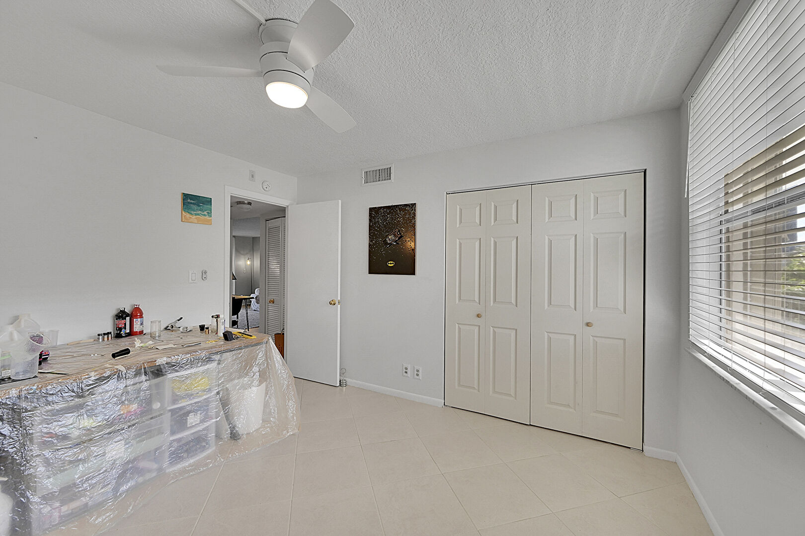 Baseboards Wall, Ceiling Fan, Closet, Drywall, Natural Light, Textured Ceiling, Tile Floor, Vent, Ceiling Fan, Textured Ceiling, Vent