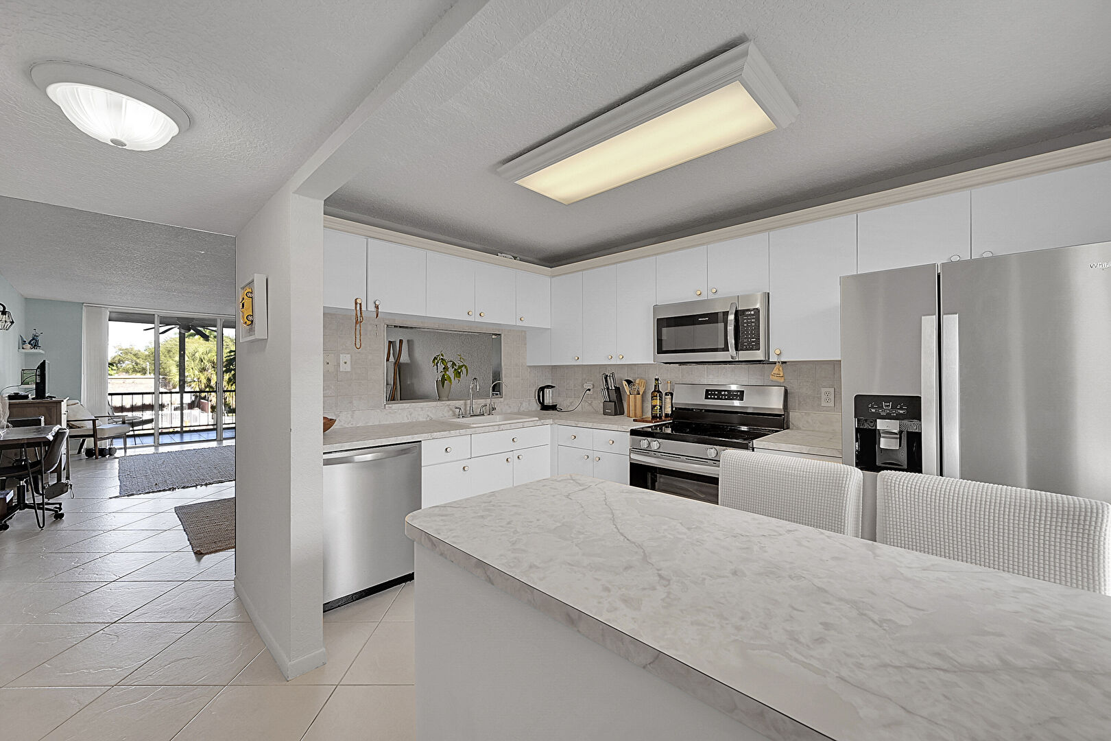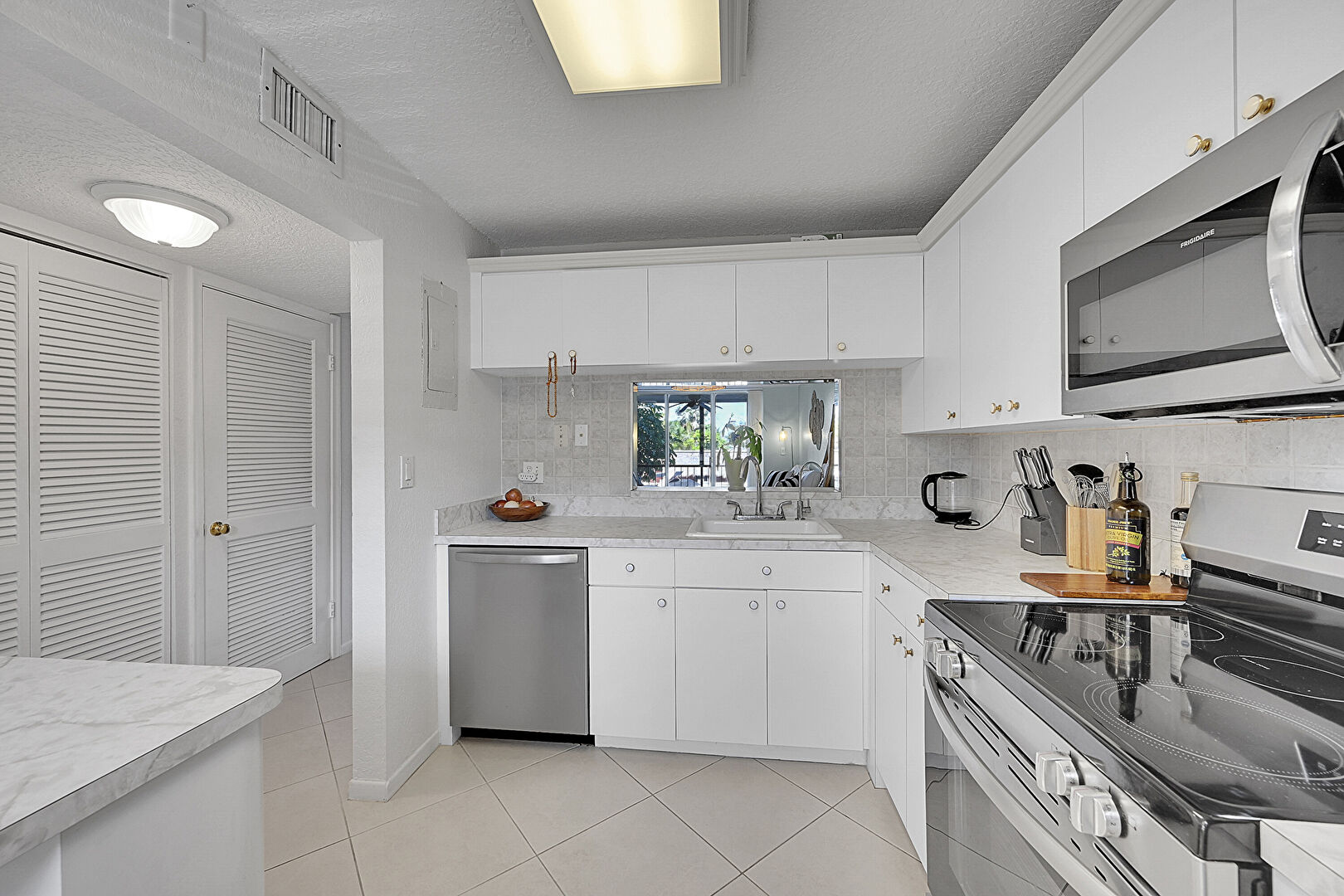 Baseboards Wall, Crown Molding Cabinets, Drywall, Electric Panel, Kitchen Bar, Kitchen Peninsula, L Shaped Kitchen, Natural Light, Open Shelves, Pass Through Window, Textured Ceiling, Tile Floor, Vent, Drywall, Natural Light, Tile Floor
