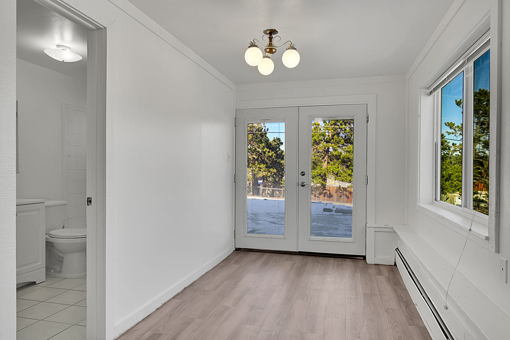Baseboard Radiator, Baseboards Wall, Drywall, French Doors, Natural Light, Notable Chandelier, Wood Finish Floor, Crown Molding