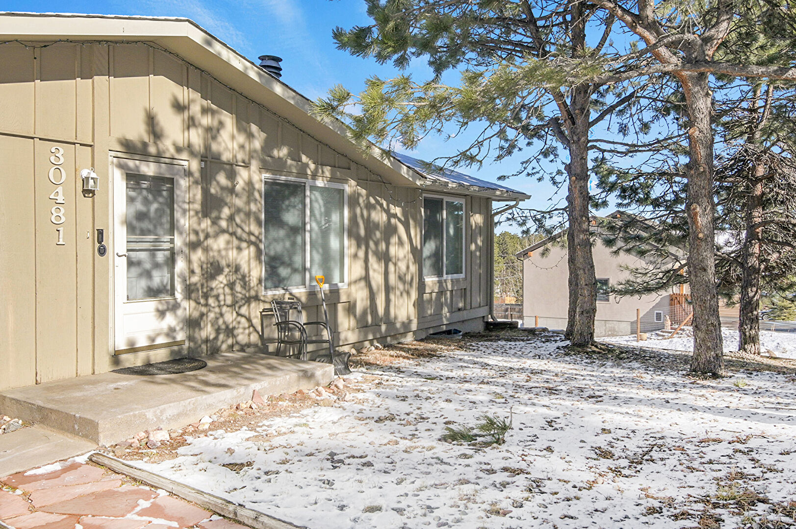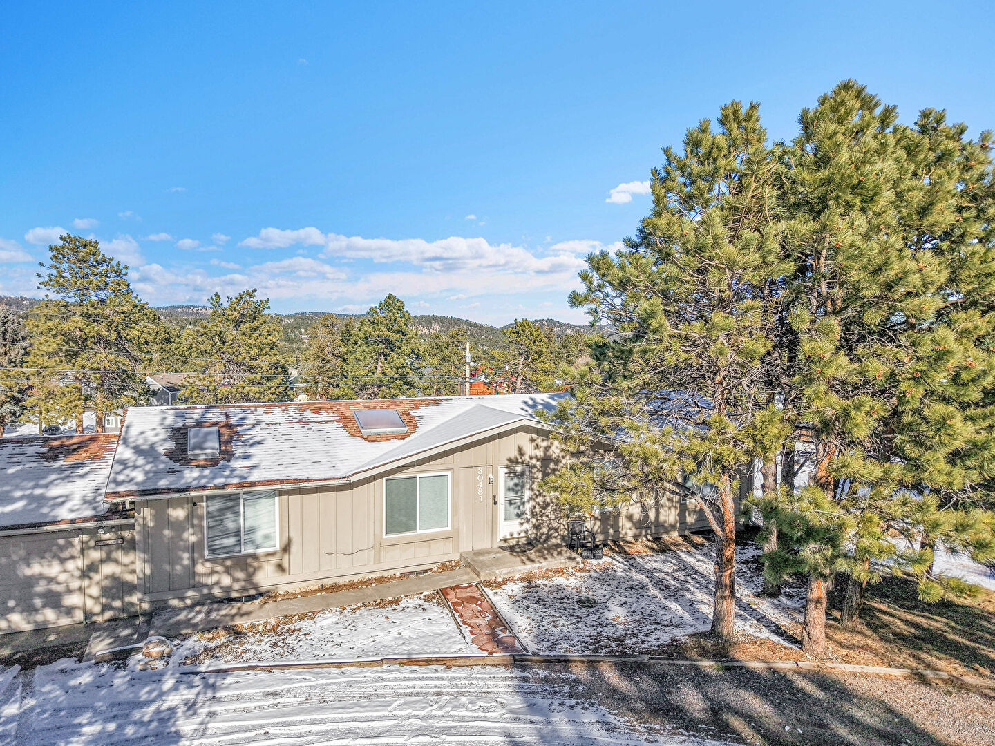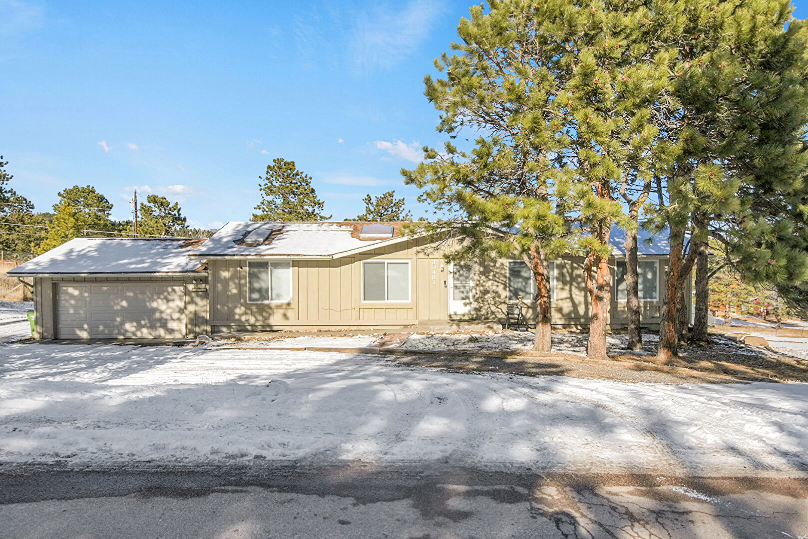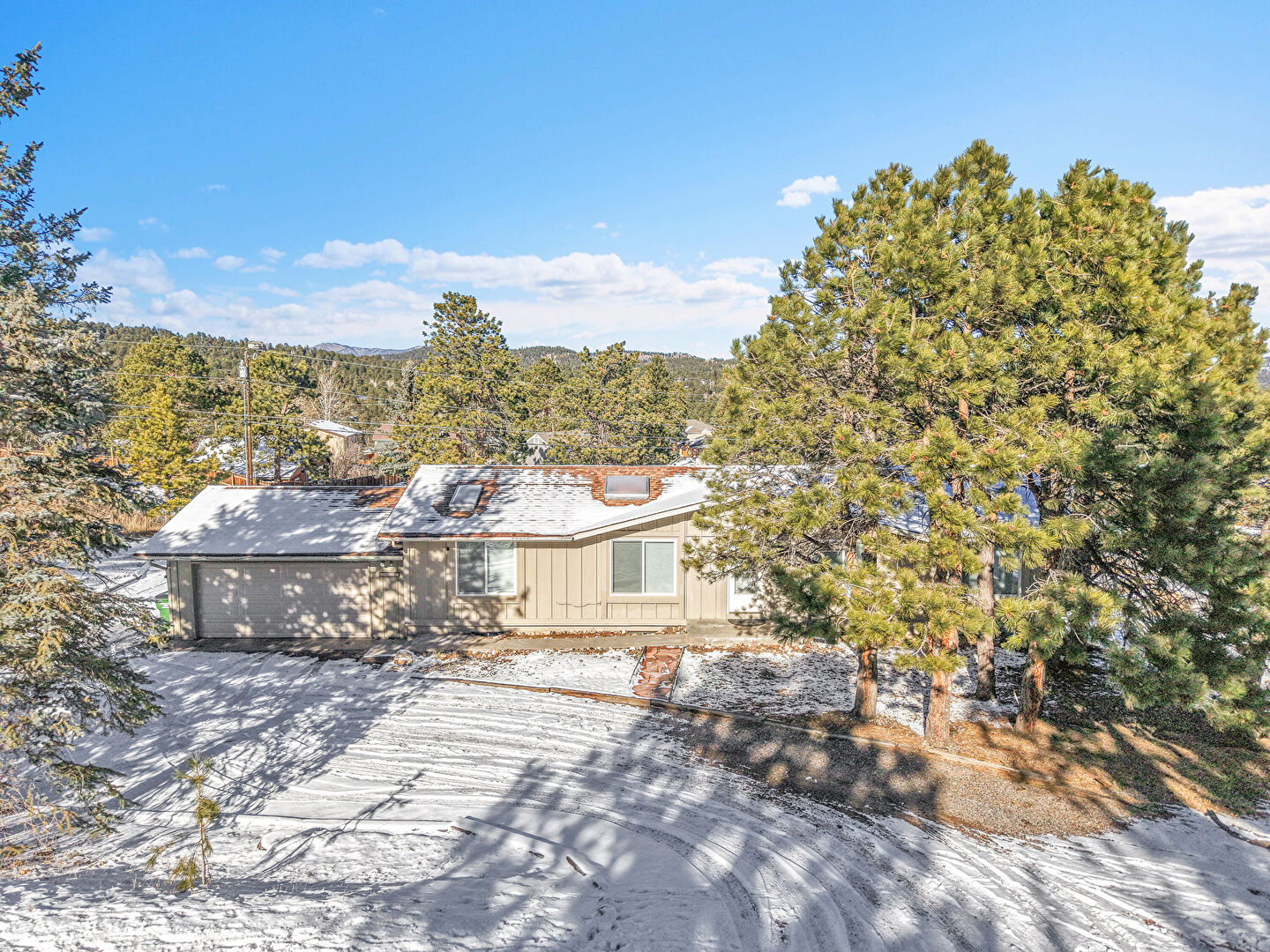 Concrete Foundation, Downspout, Driveway, Forest View, Gutters, Vertical Siding, Board Batten Siding, Solar Panels, Vertical Siding