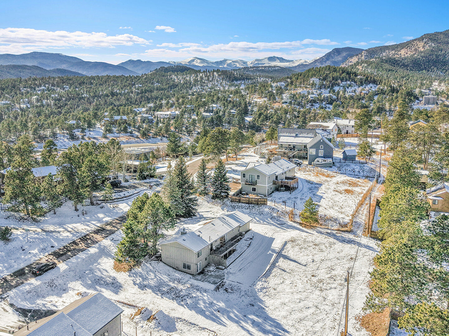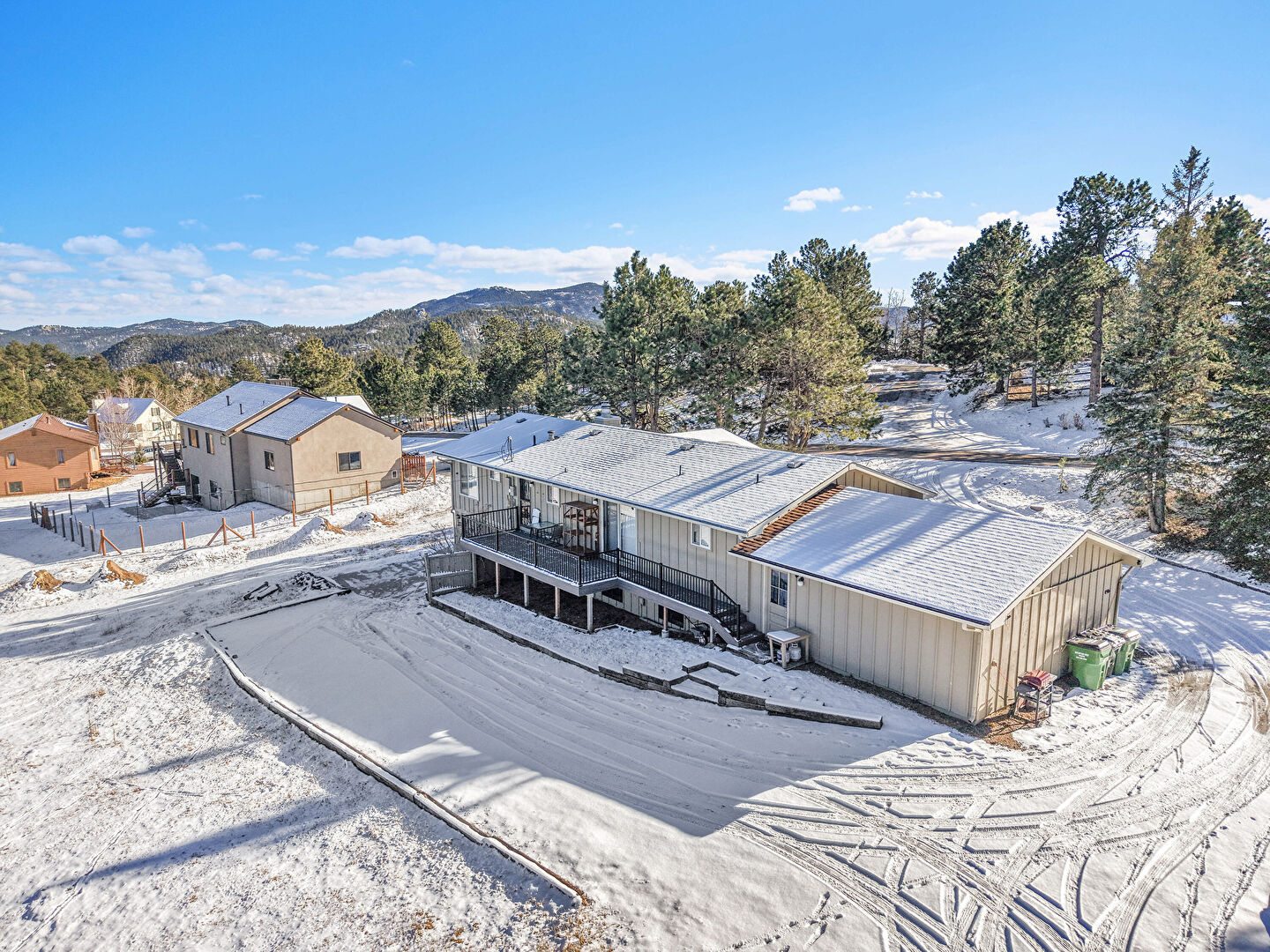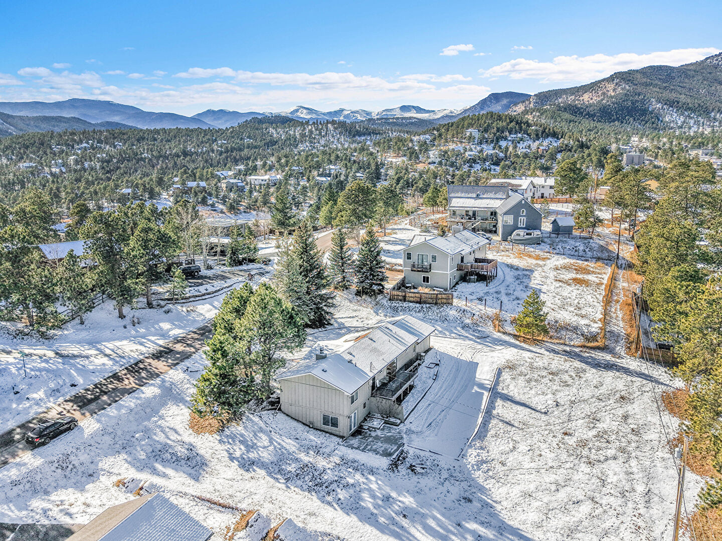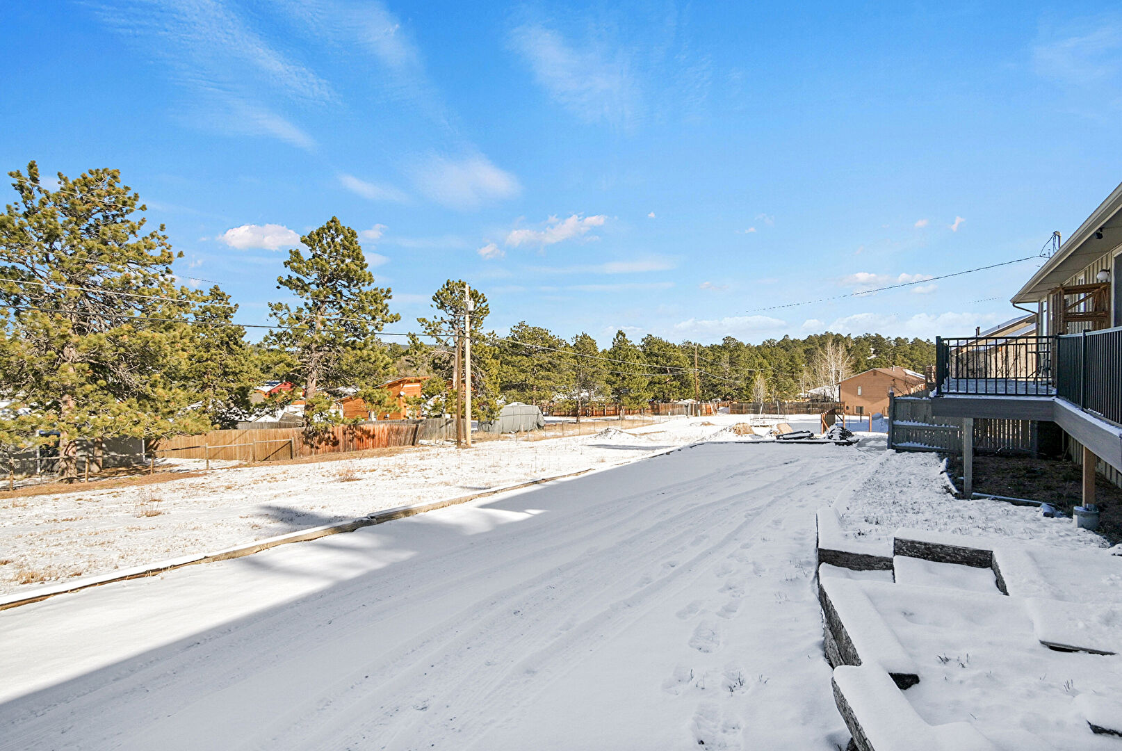 Concrete Foundation, Downspout, Driveway, Forest View, Gutters, Vertical Siding, Board Batten Siding, Solar Panels, Vertical Siding