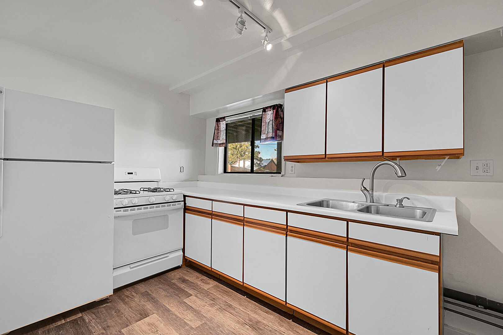 Drywall, Medium Brown Cabinets, Track Lighting, Wood Finish Floor, Baseboards Wall, Natural Light