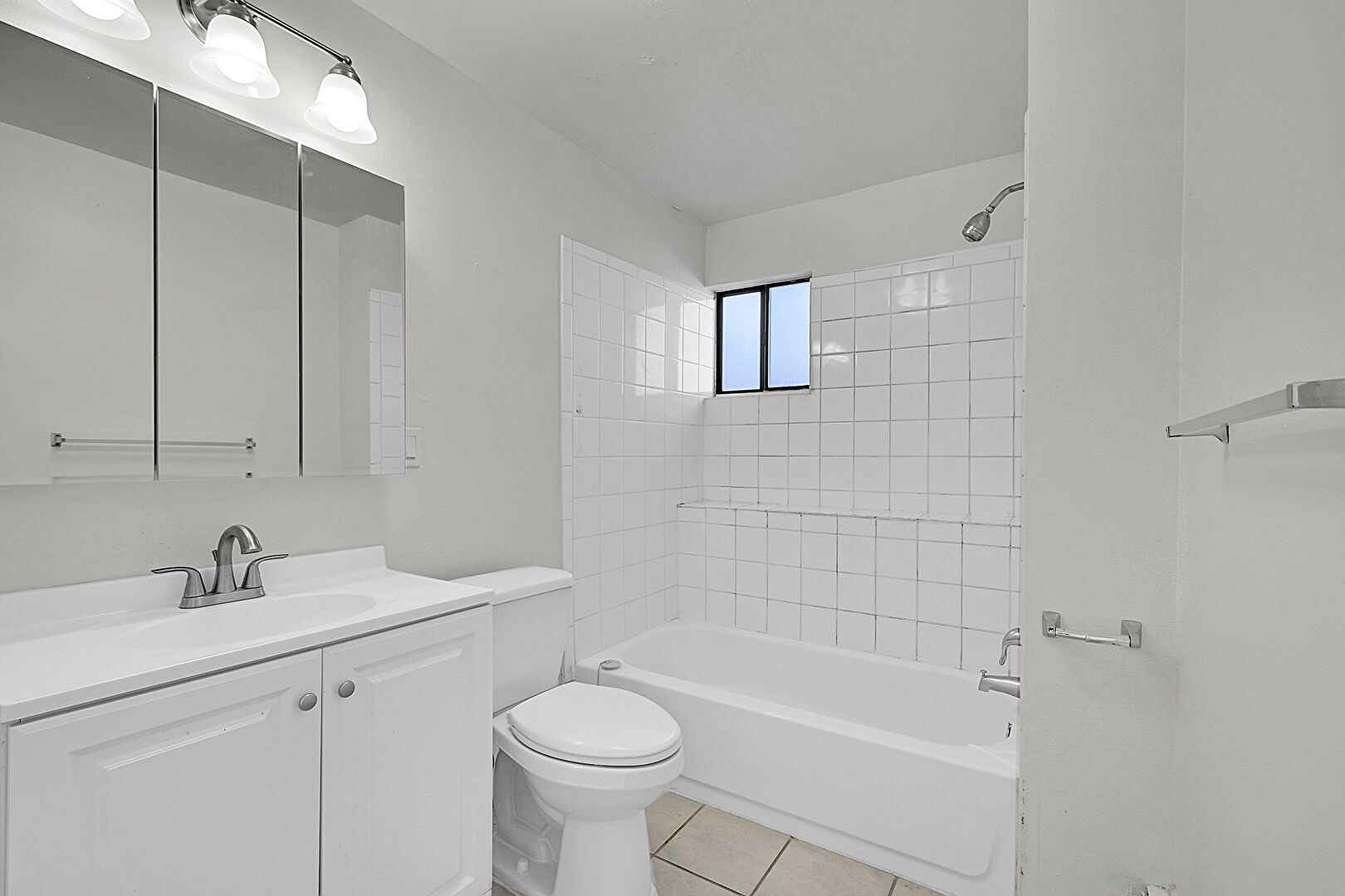 Combined Bath Shower, Drywall, Full Bathroom, Natural Light, Tile Floor, Vanity