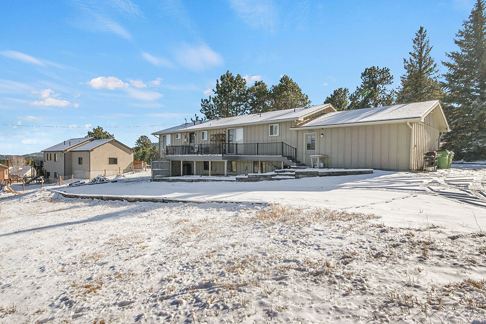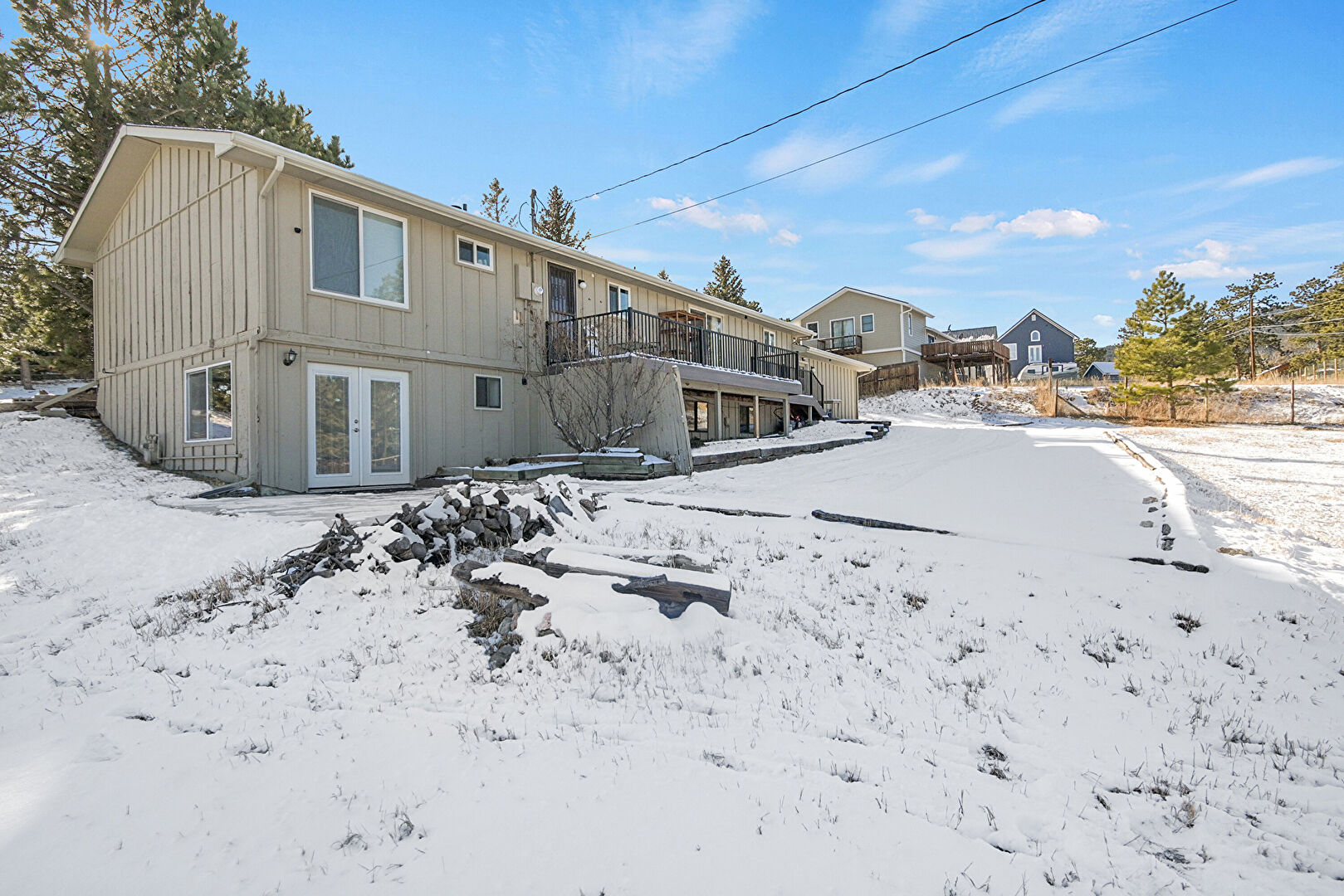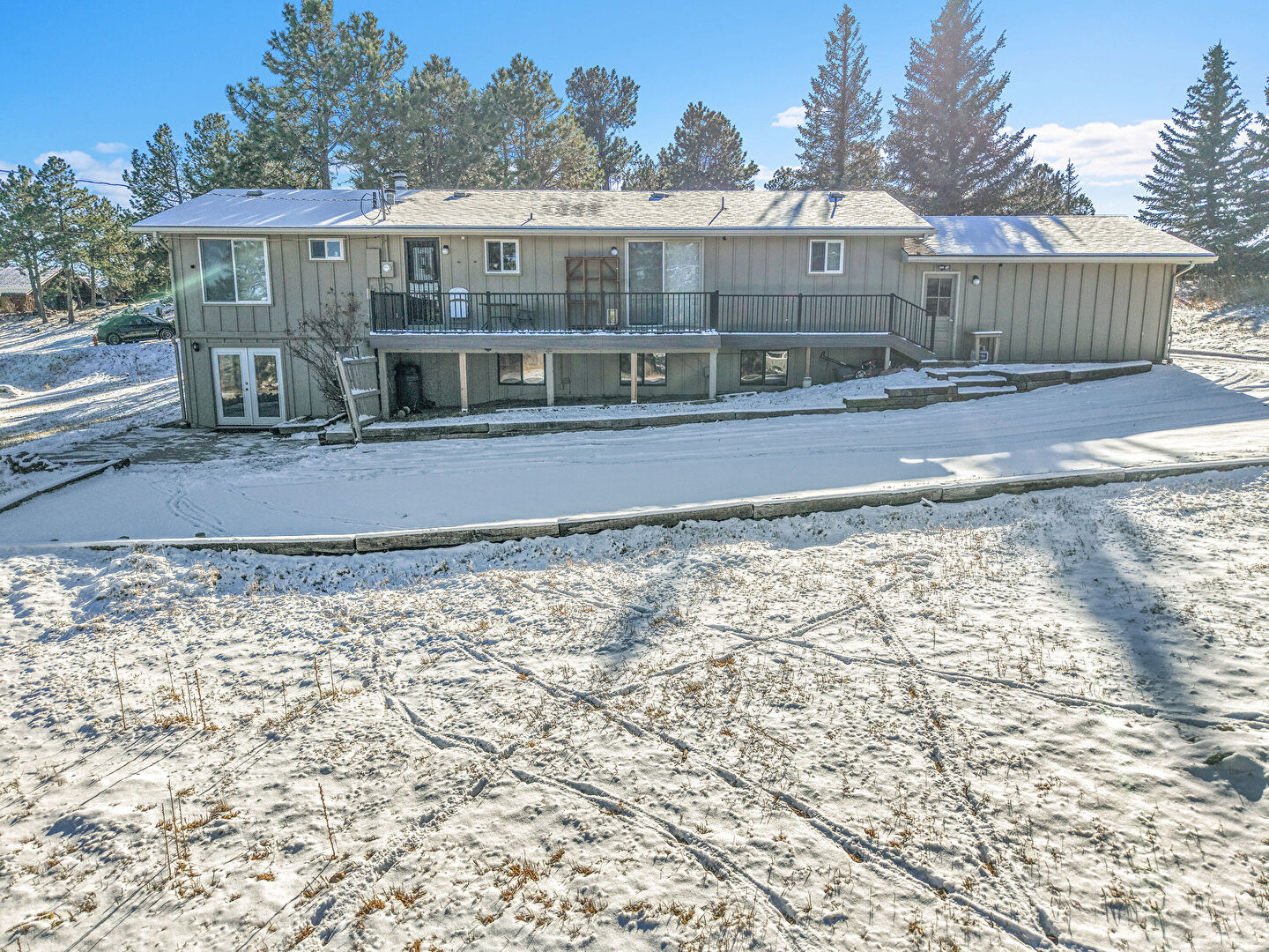 Balcony, Basement Walk Out, Board Batten Siding, Deck, Downspout, French Doors, Gutters, Residential View, Stairs, Vertical Siding, Basement Walk Out, Board Batten Siding, Vertical Siding