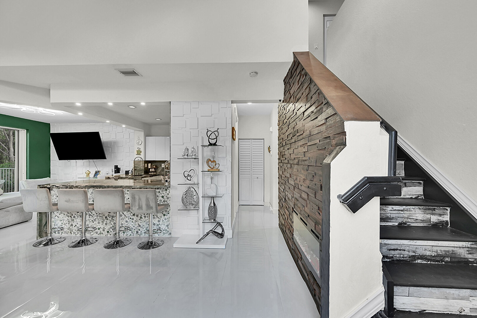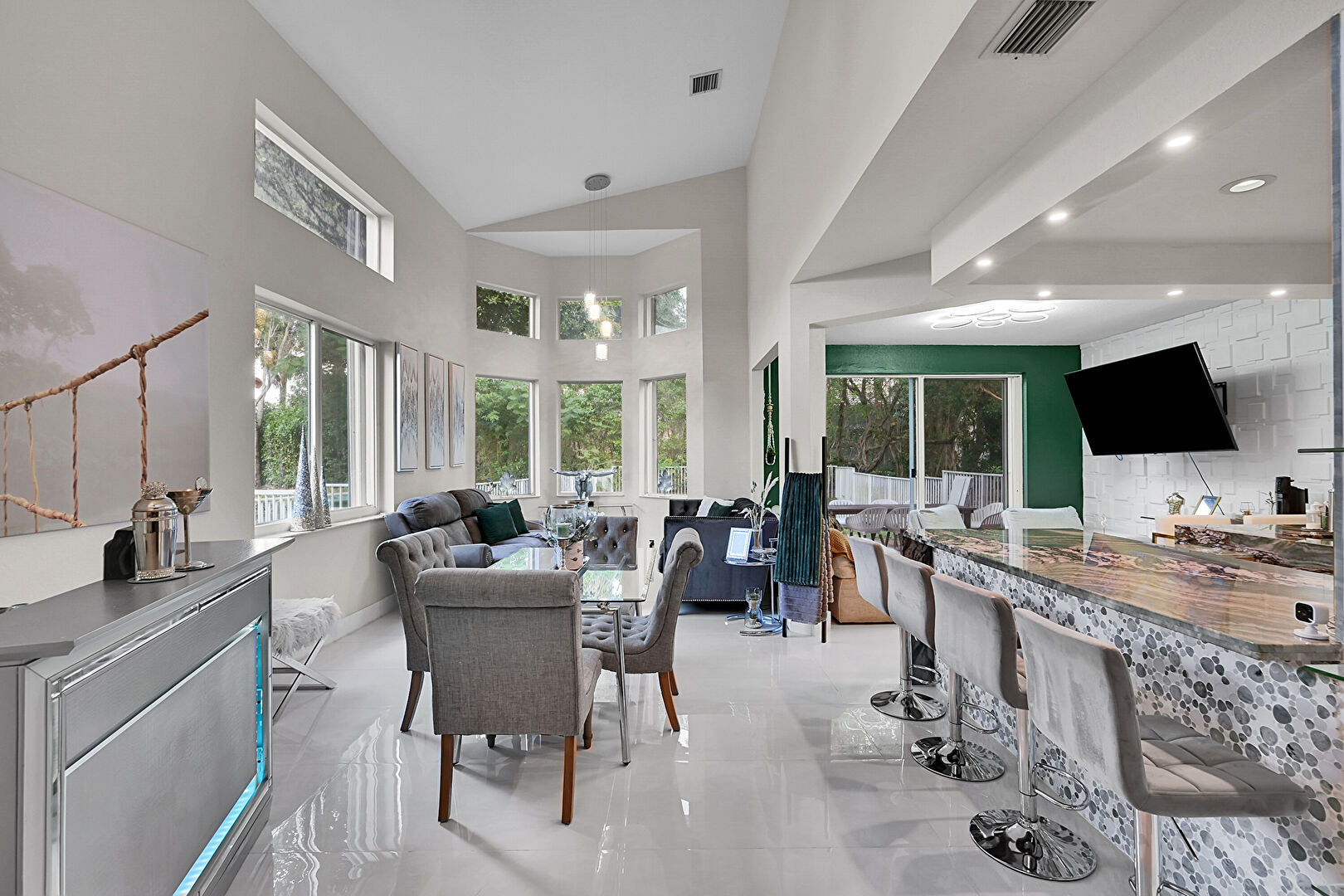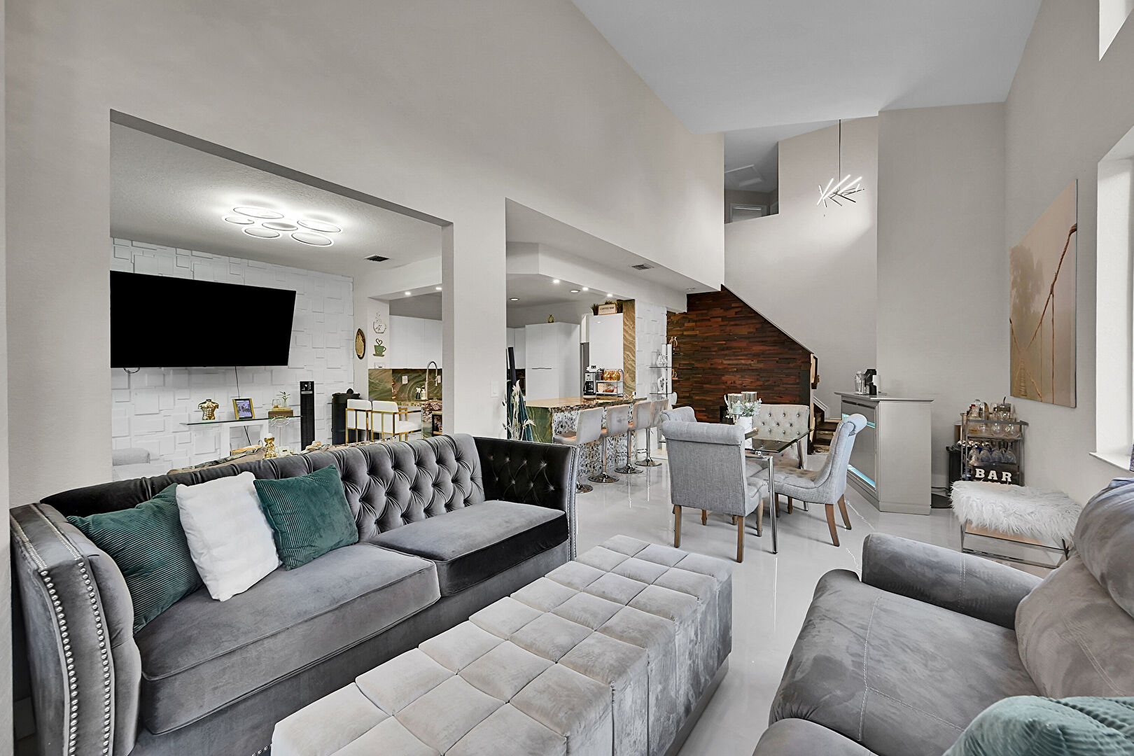 Accent Wall, Concrete Floor, Drywall, High Ceiling, Natural Light, Recessed Lighting, Textured Ceiling, Tile Floor, Vaulted Ceiling, Vent, Drywall, High Ceiling, Textured Ceiling, U Shaped Kitchen